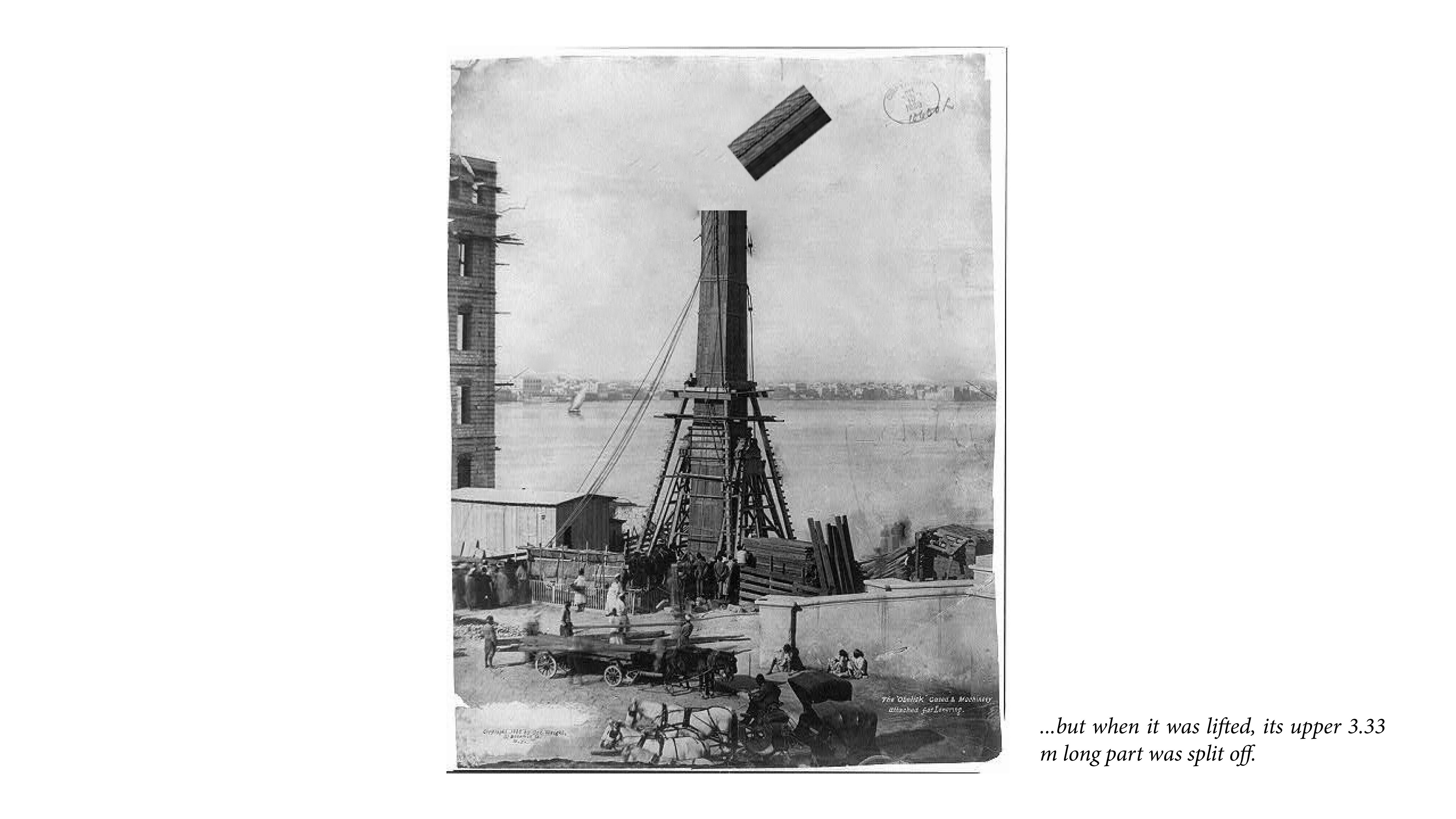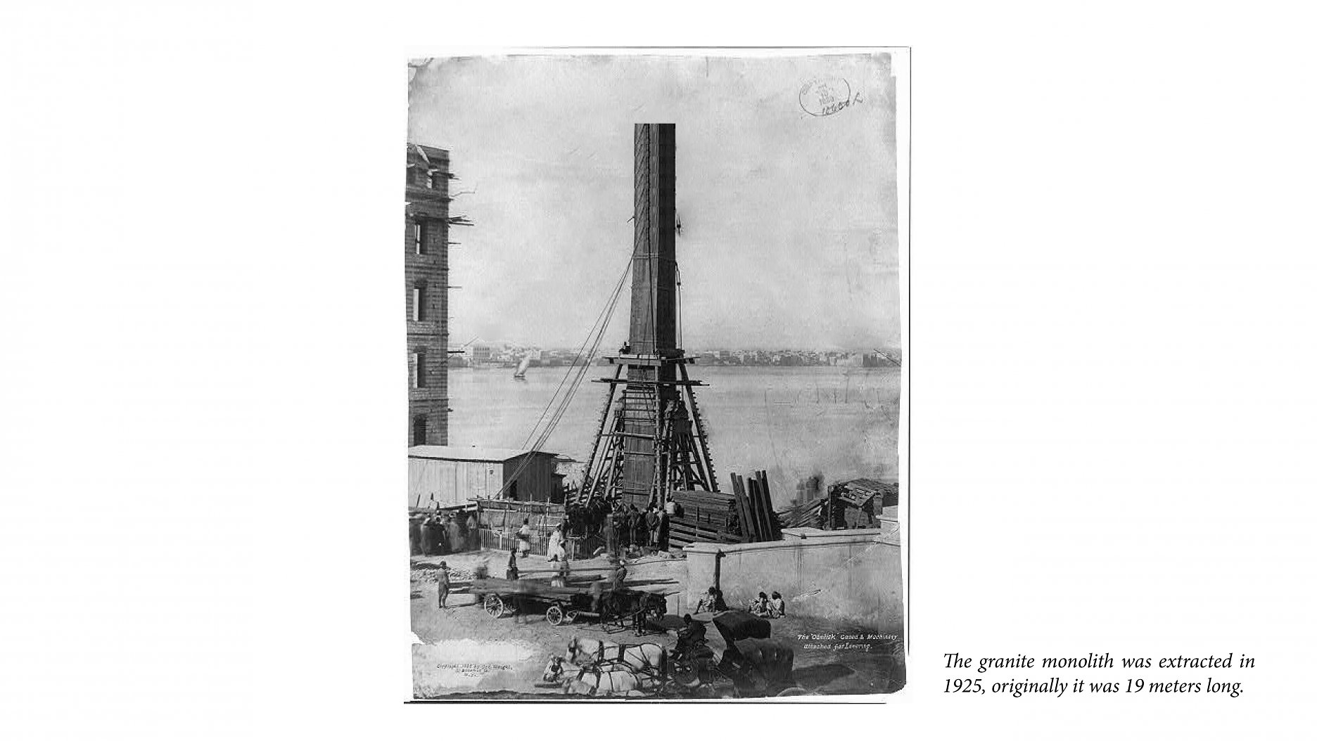 K vytěžení žulového monolitu došlo až roku 1925, po vylomení měřil 19m, ale při nadzvedávání se jeho horní 3,33m dlouhá část odlomila.
