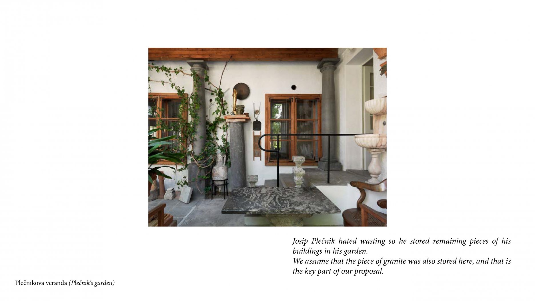 Josip Plečnik nesnášel plýtvání a zbylé kusy ze svých staveb skladoval na své zahradě, takže předpokládáme, že i daný kus žulového odlomku zde uskladnil a to je stěžejní část našeho návrhu.