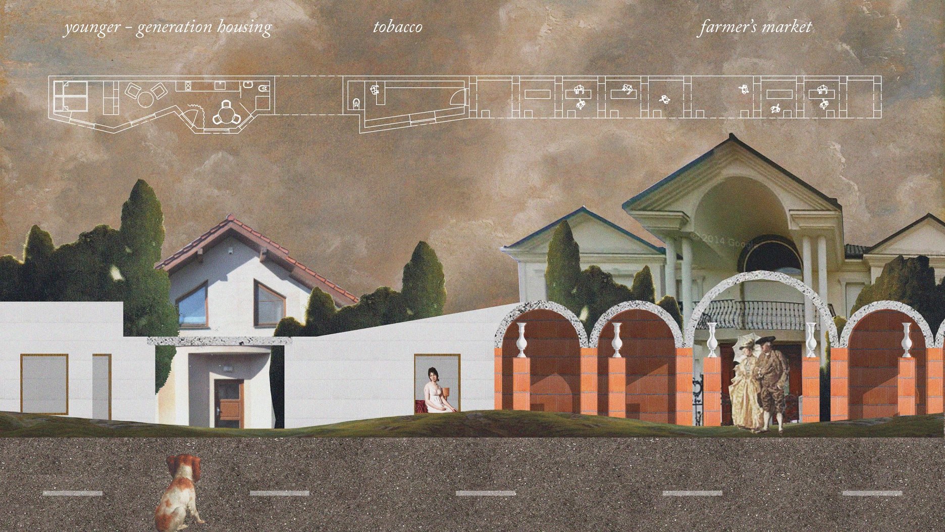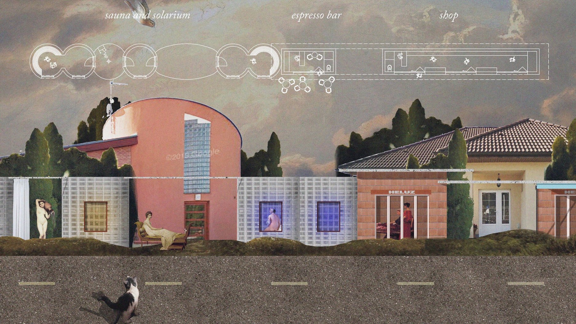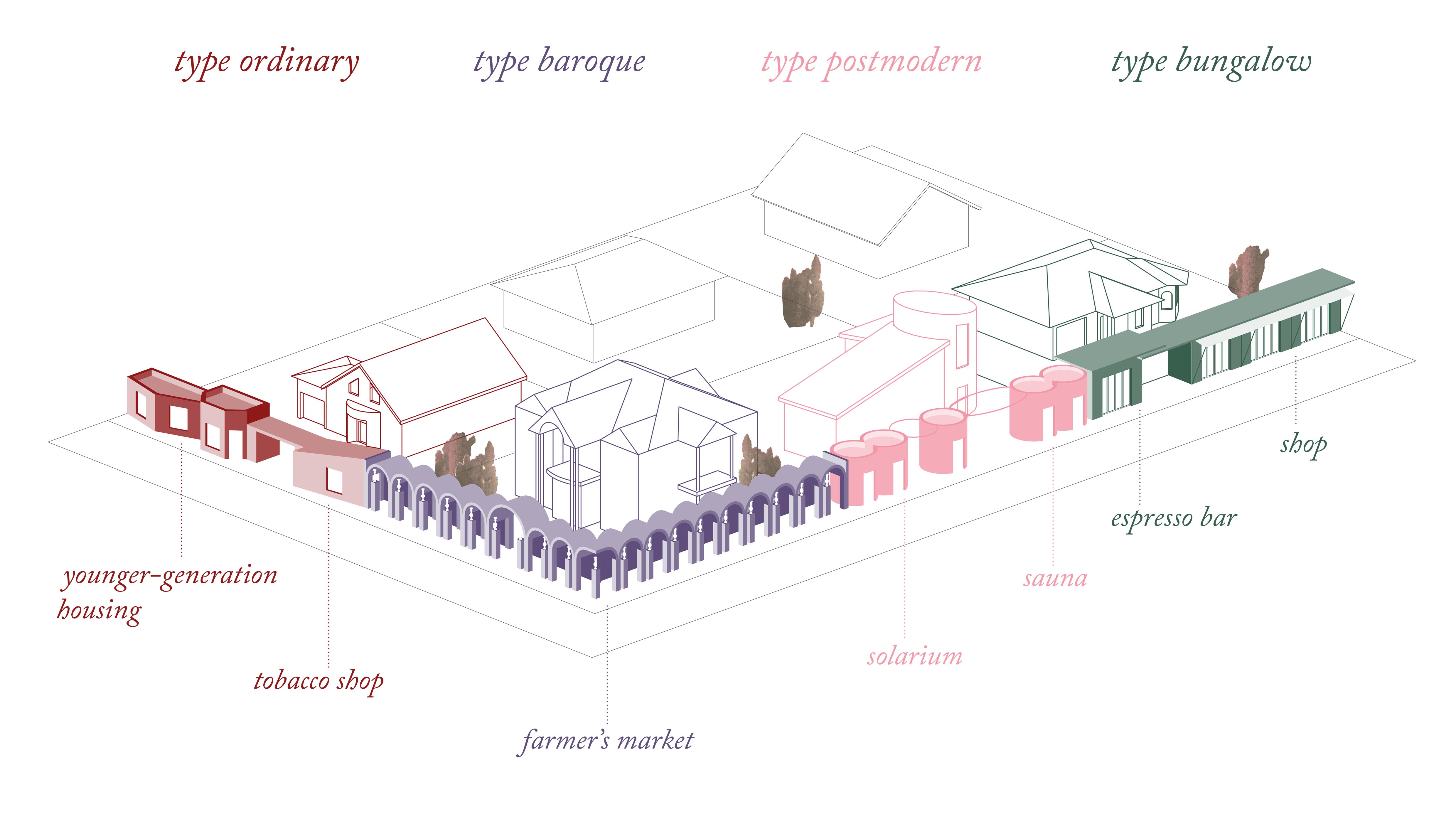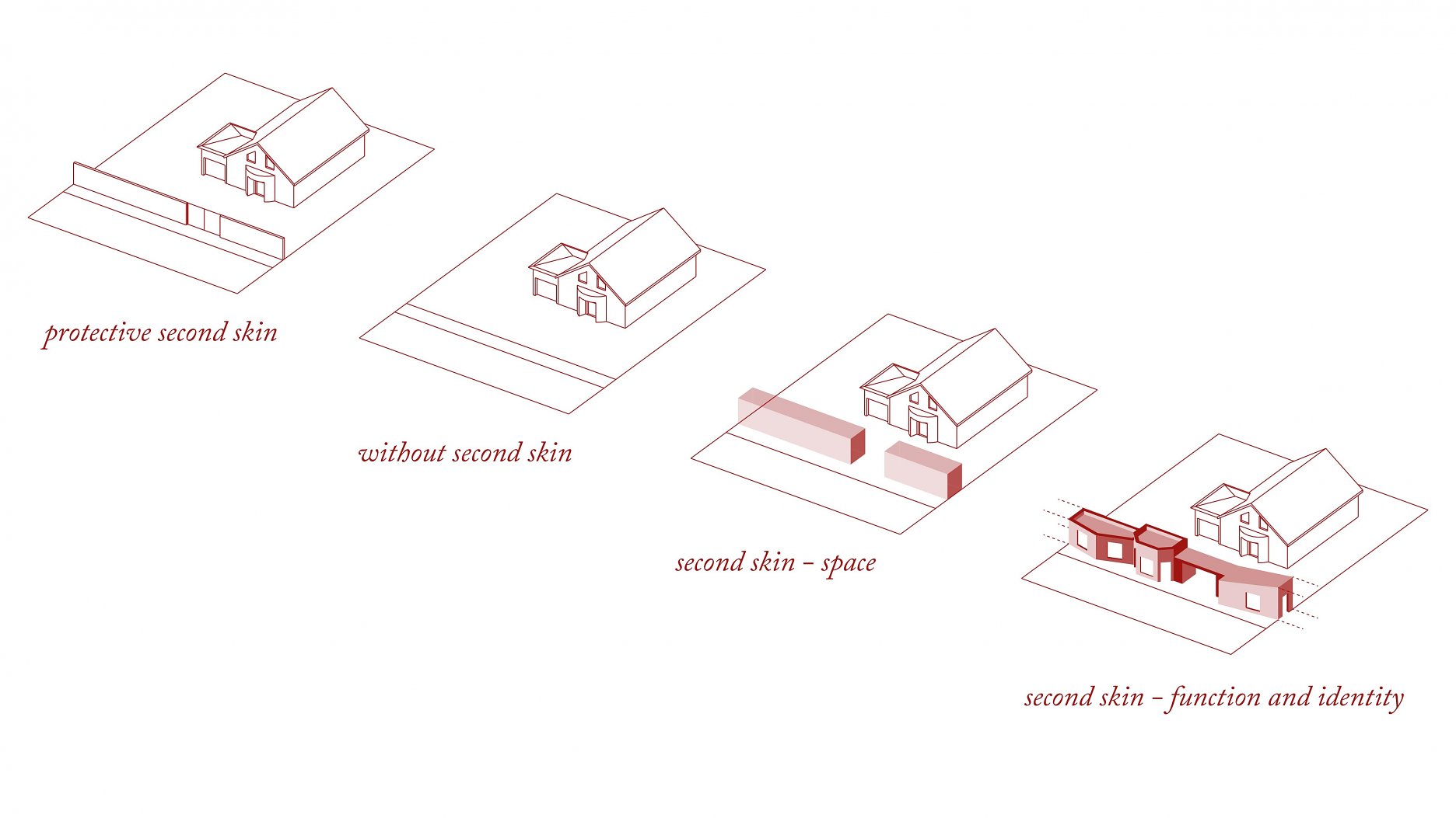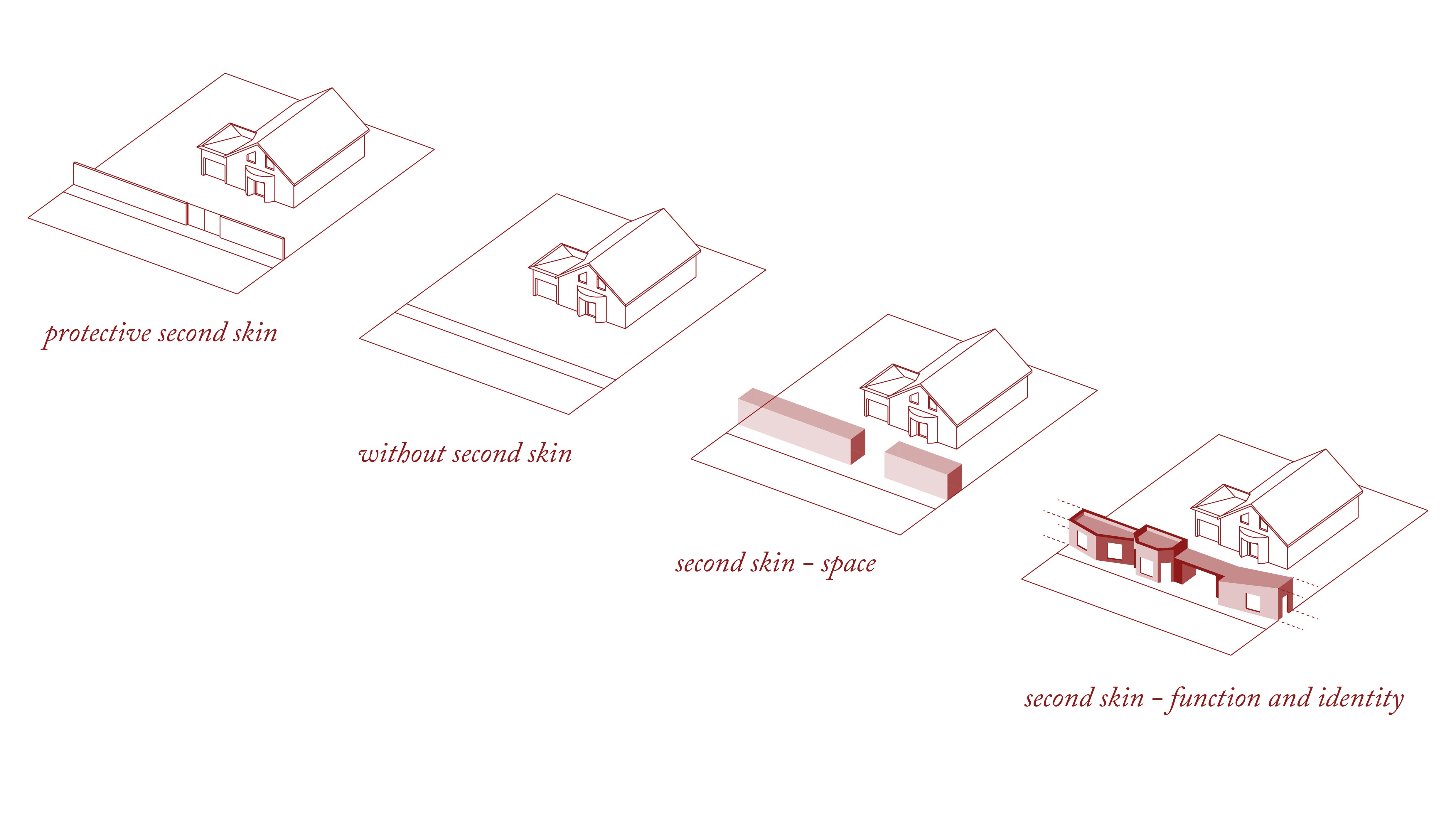 Místo boje se suburbiem navrhujeme alternativní způsob vymezení soukromí. Domy necháváme domy, a věnujeme se hranicím - ochranné kůži, které rozšiřujeme o funkční náplň.