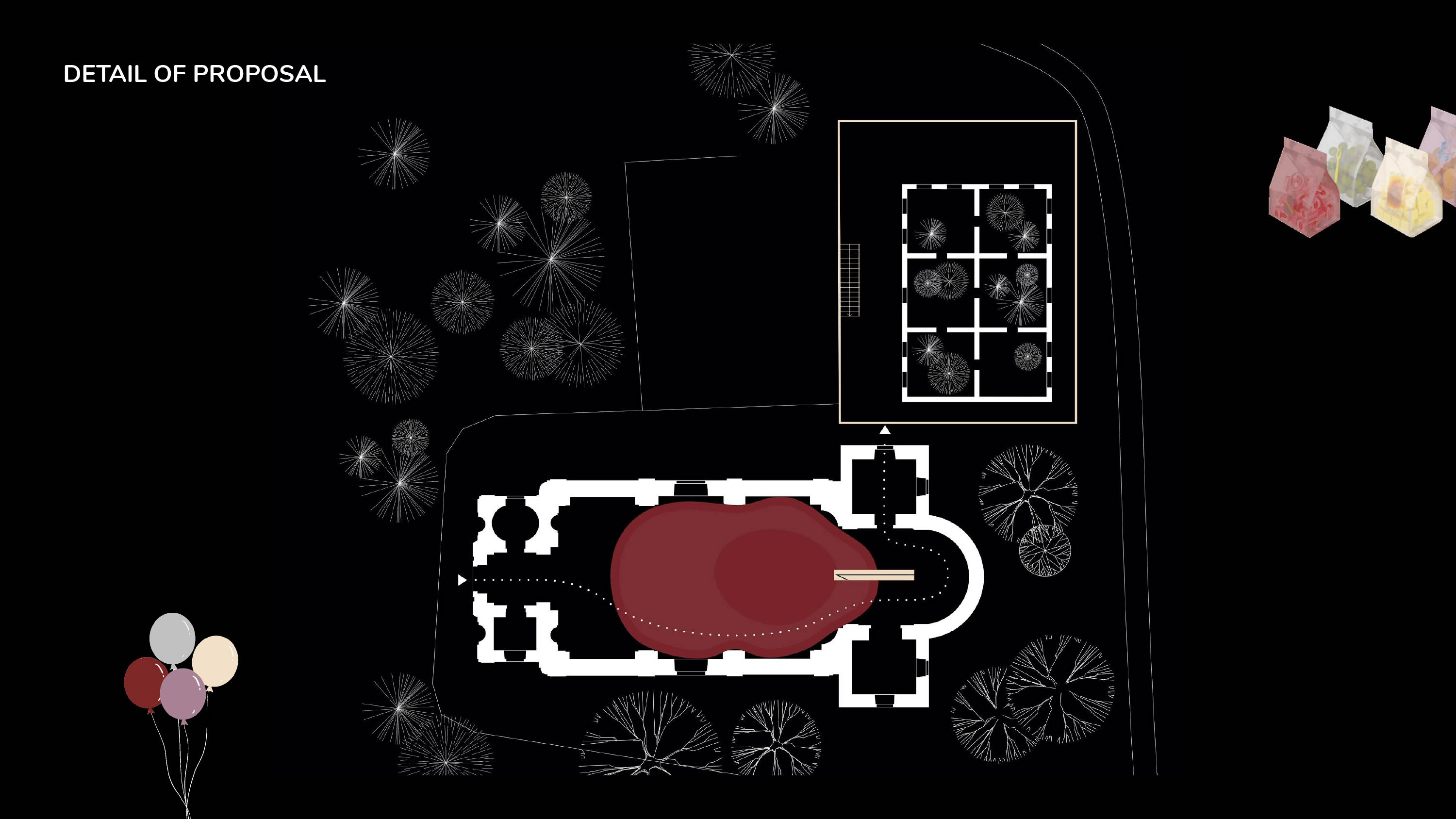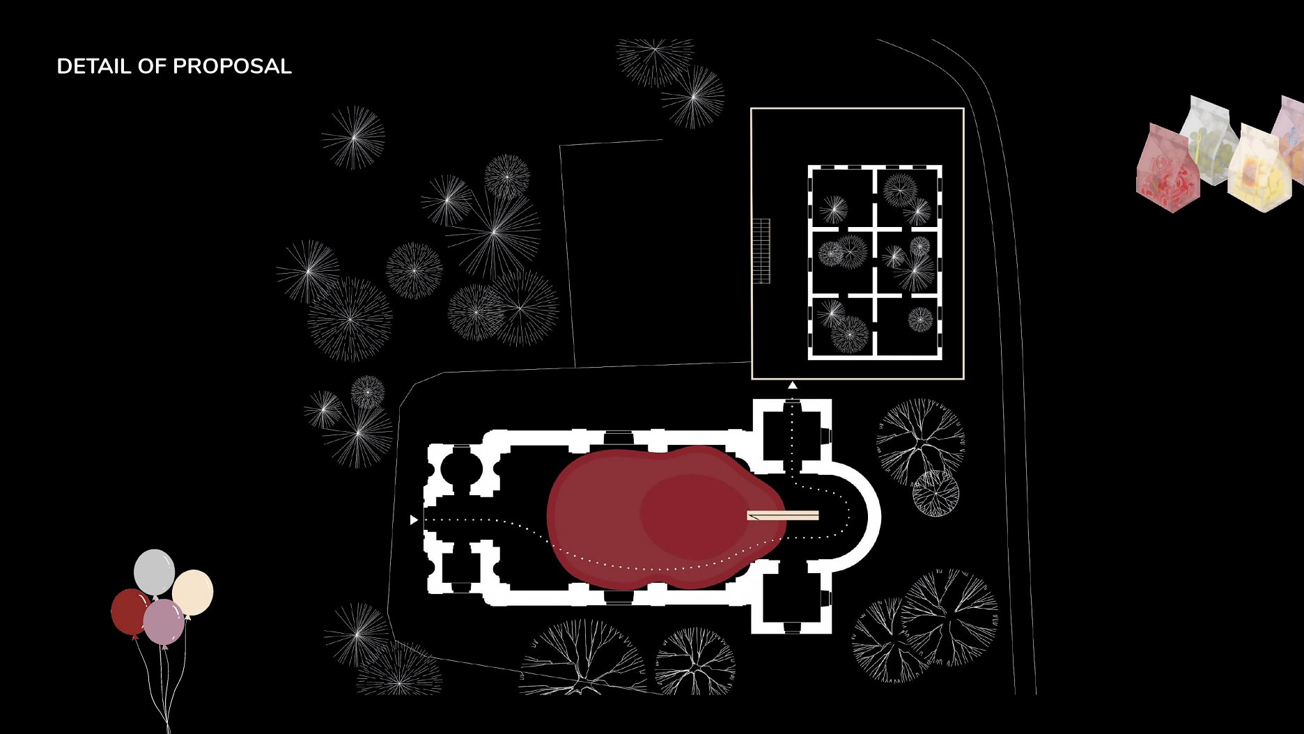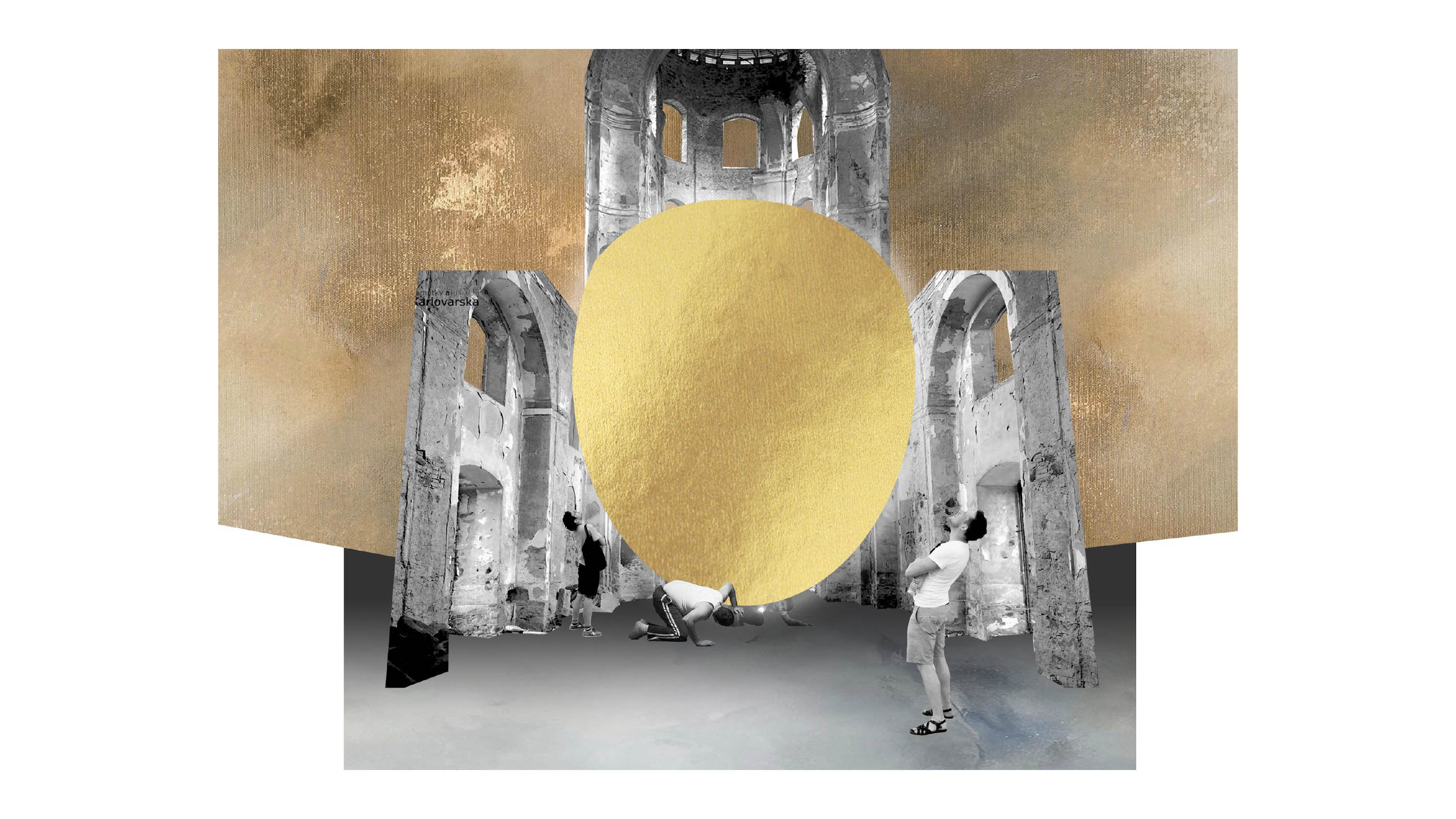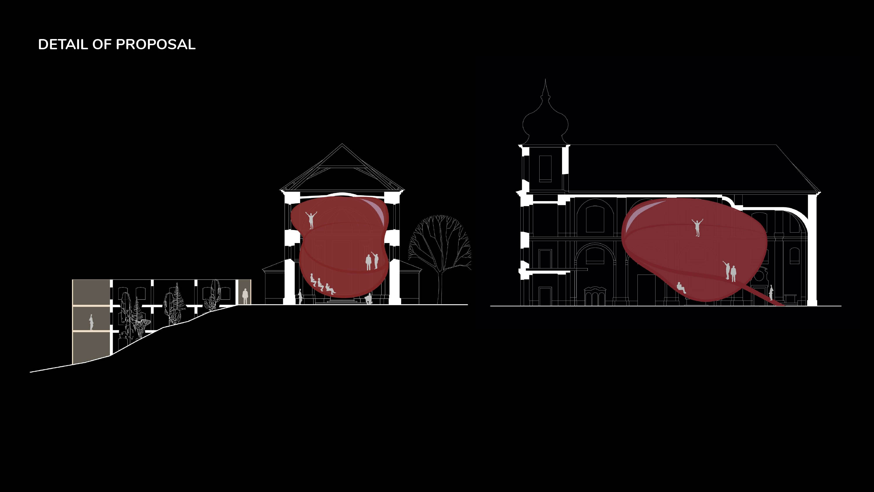 Poukazujeme na přítomnost uměle vytvořené psychologické hranice a naší intervencí chceme obnovit všeobecnou pohostinnost a posvátnost místa. Návrh přináší celospolečensky kulturní přesah a praktické využití chátrajících objektů."