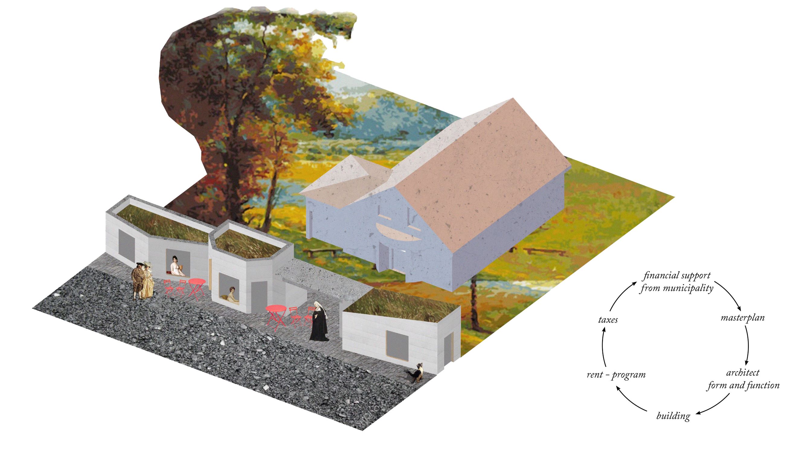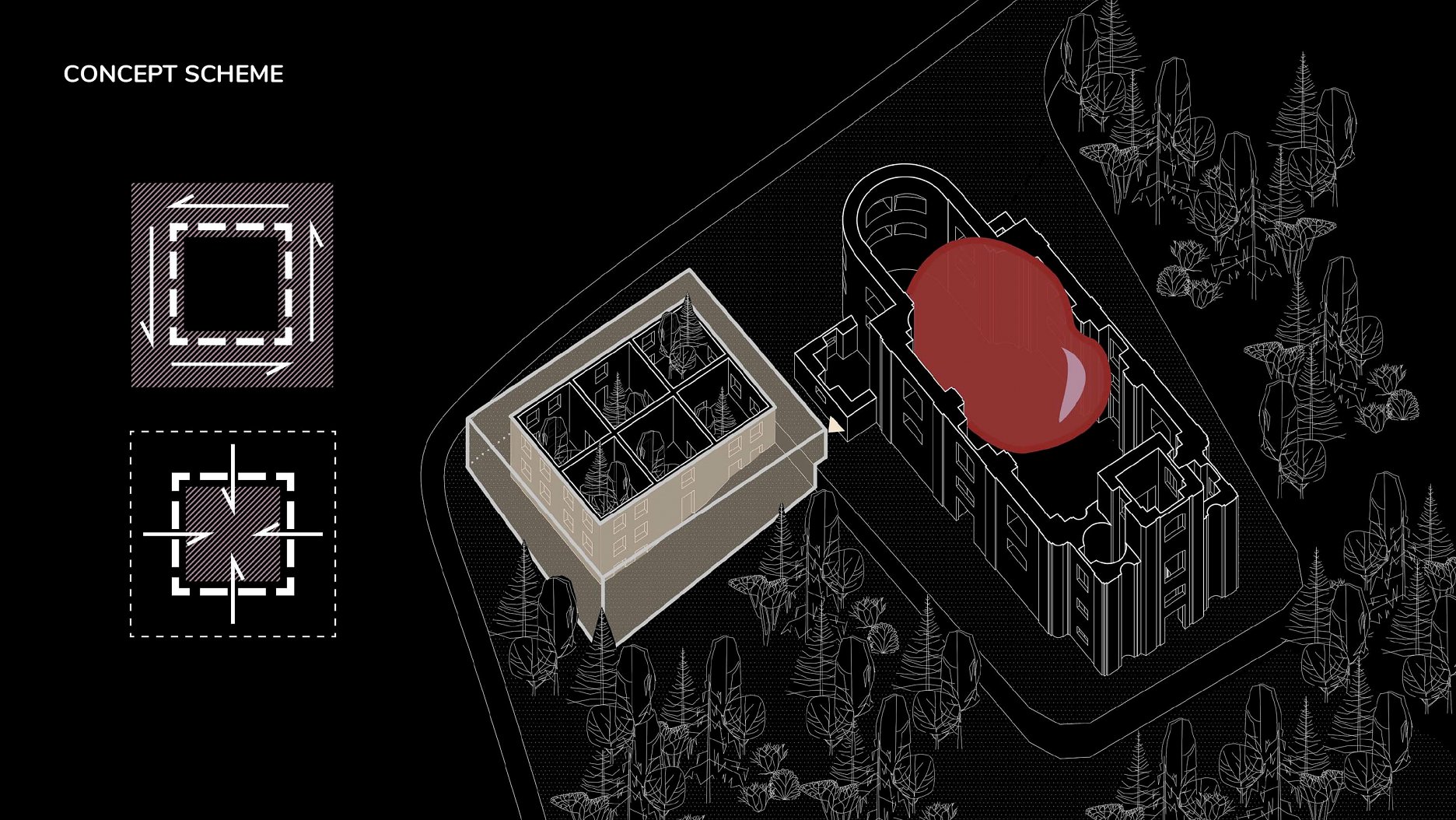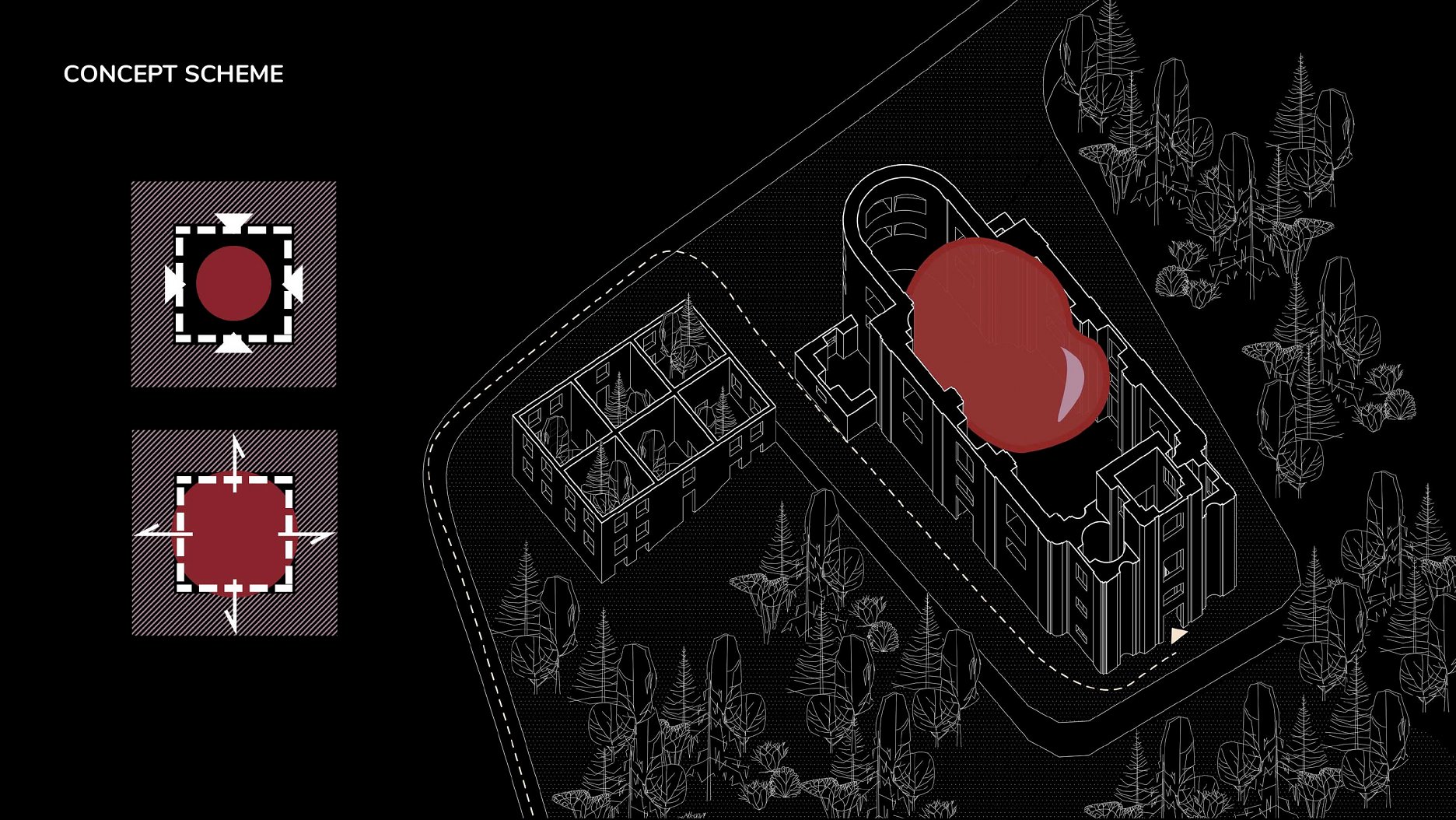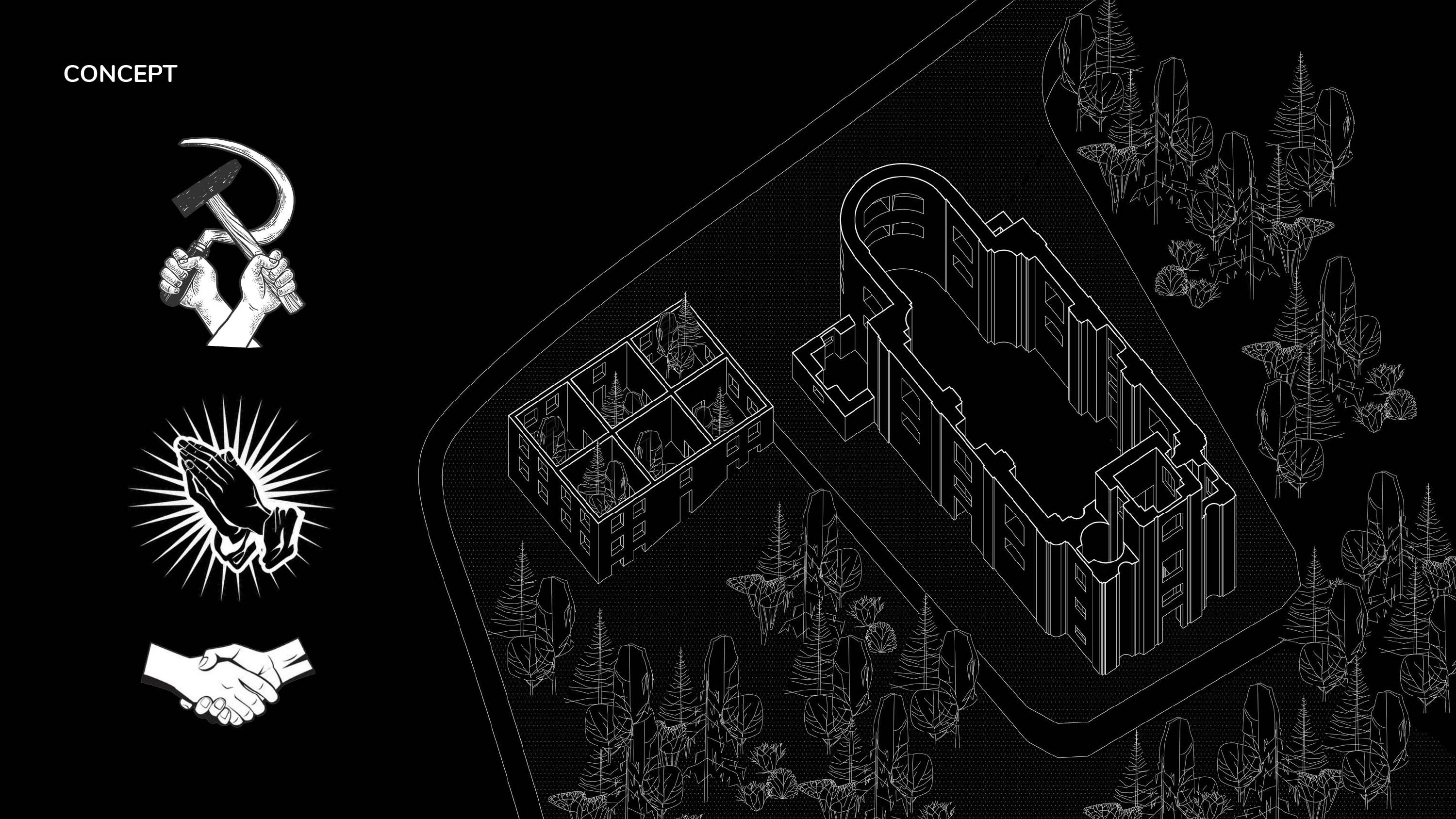 Poukazujeme na přítomnost uměle vytvořené psychologické hranice a naší intervencí chceme obnovit všeobecnou pohostinnost a posvátnost místa. Návrh přináší celospolečensky kulturní přesah a praktické využití chátrajících objektů."