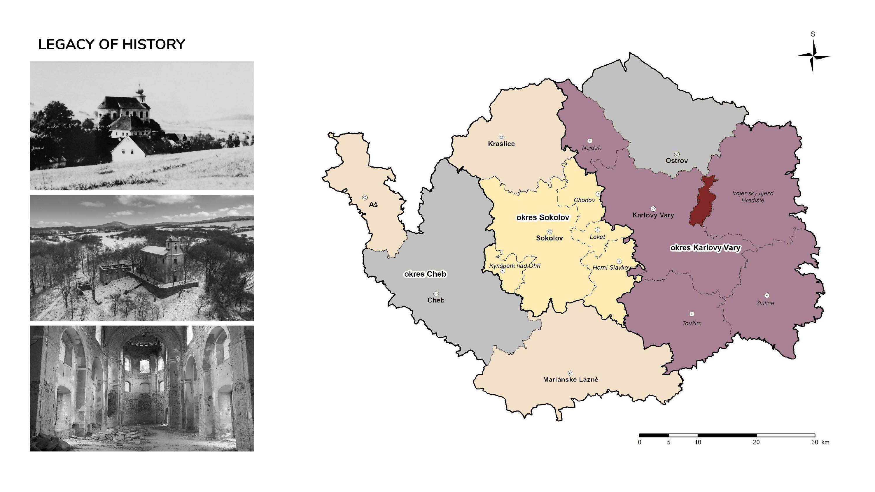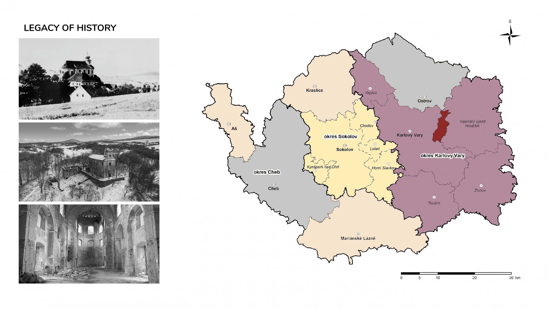 Represe, uvědomění a odpuštění, tak jak je nacházíme v historii, se propisují do našeho návrhu. Demonstrujeme je na příkladu Svatoborského kostela Nanebevzetí Panny Marie, který je jedním z pouhých dvou dochovaných kostelů v oblasti Doupovských hor. Chátrá a jeho zřícení by mělo za následek nenávratný zánik kulturně-historického odkazu. Spolek pro dokumentaci a obnovu památek Karlovarska iniciuje snahy o jeho zachování a v jeho místě vytvoření připomínky zaniklých obcí a osudů obyvatel Doupovských hor.