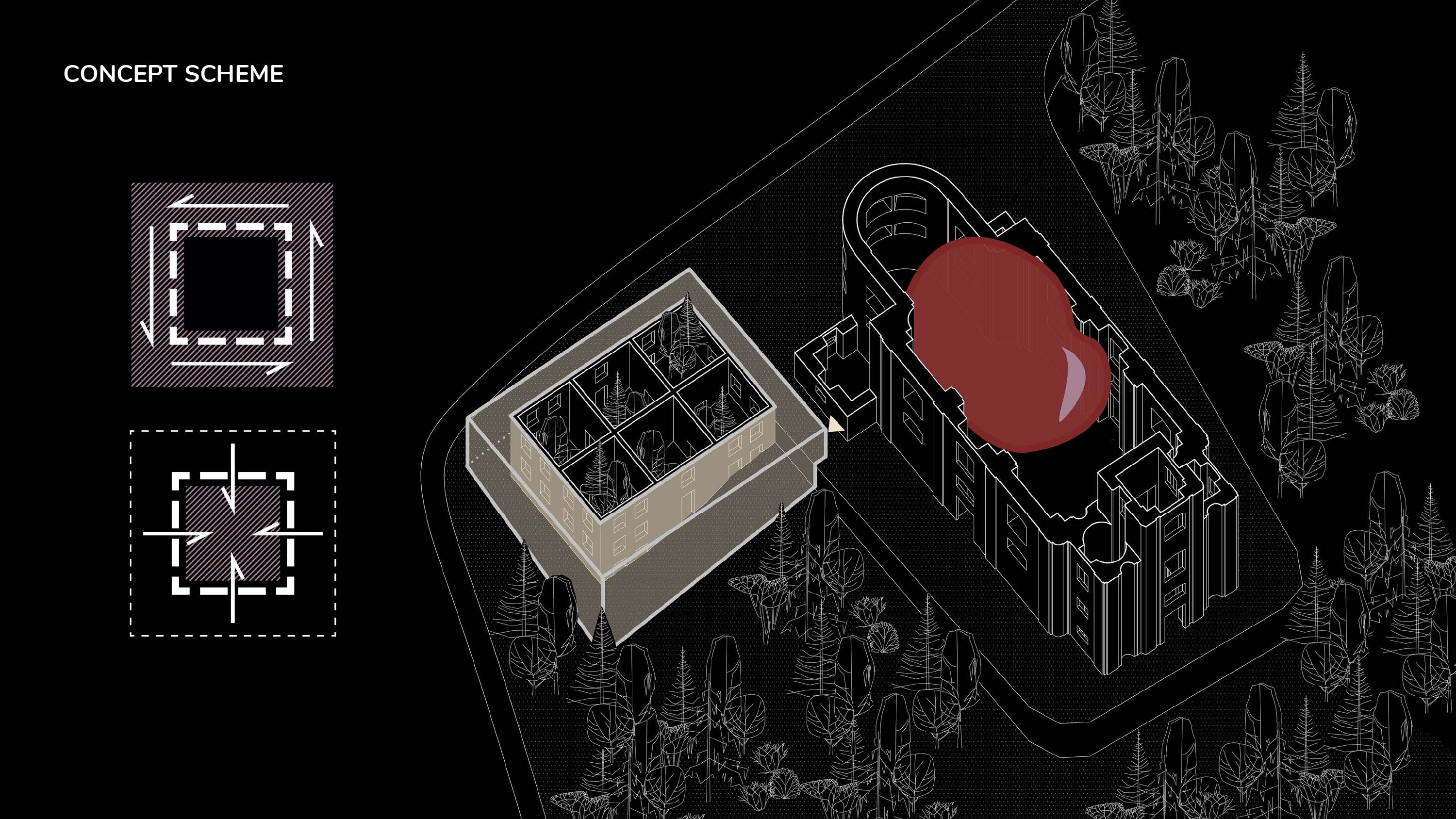 Represi symbolizujeme prostřednictvím nového objektu - bubliny - jež se snaží expandovat všemi směry, ale střetává se s nepřekonatelnou fyzickou bariérou. Sledujeme tím analogii k dějinám místa, kdy se noví obyvatelé snažili vytěsnit německé usedlíky. Do návrhu se tak propisuje patrné napětí mezi starým a novým.