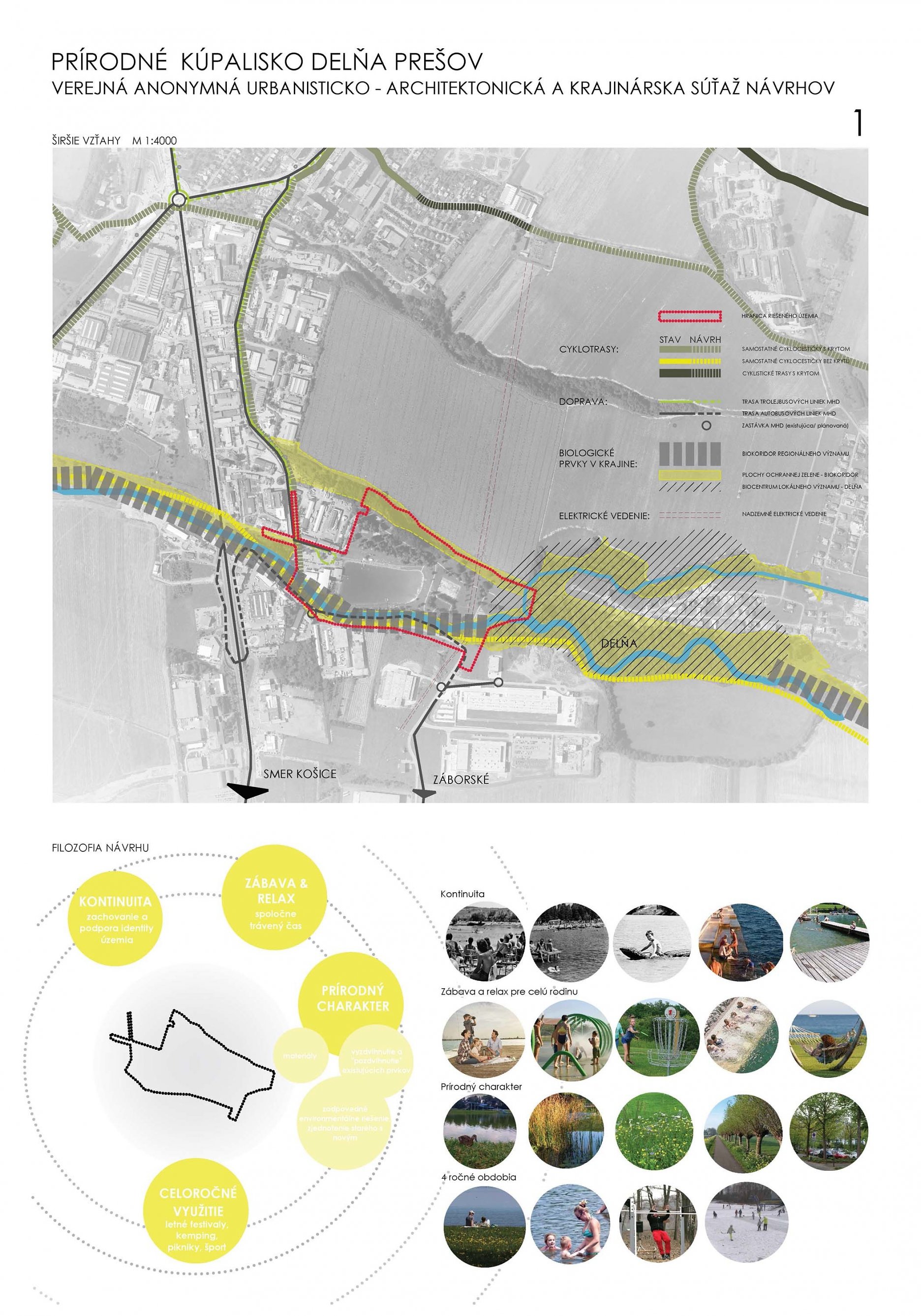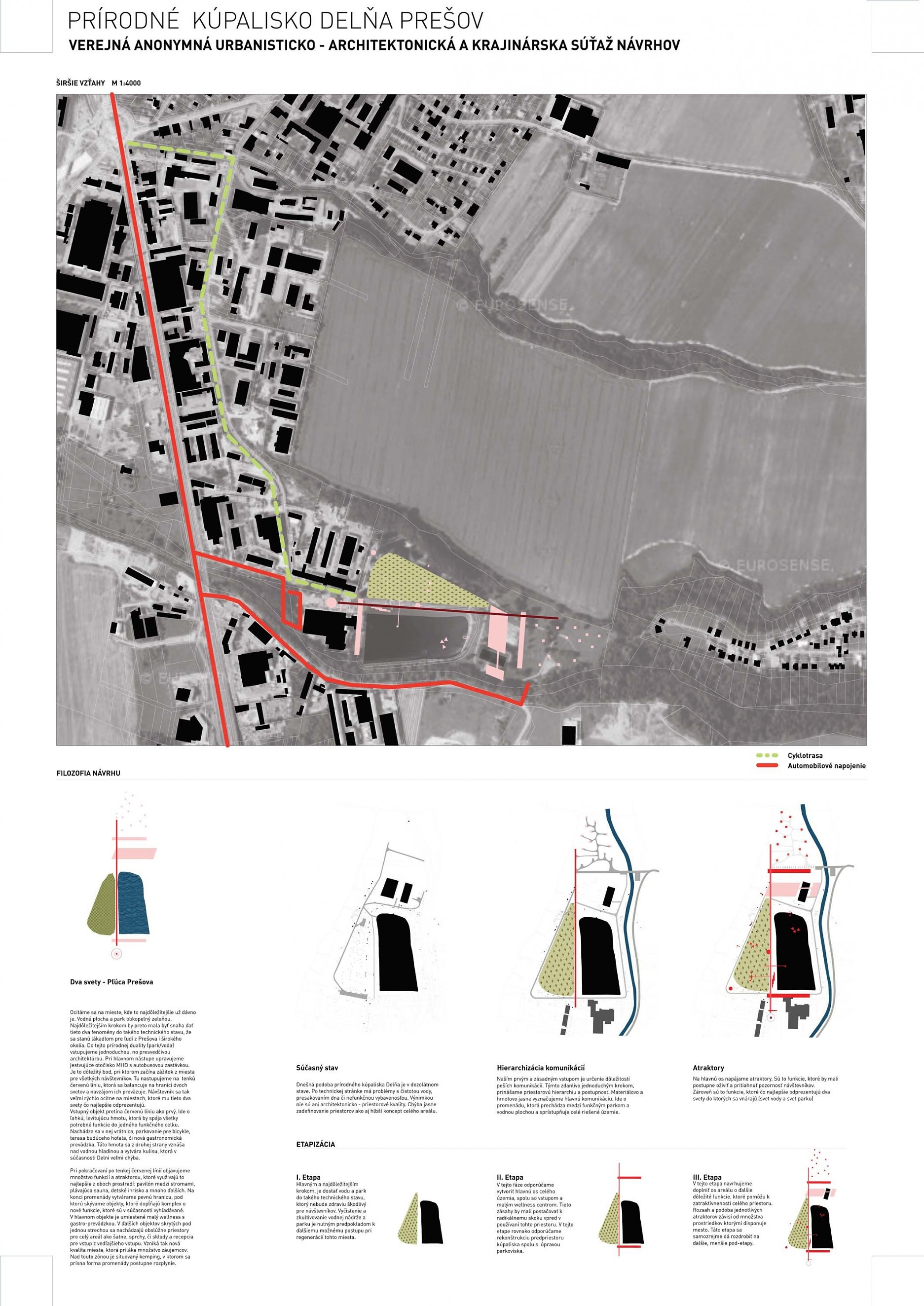 Hodnotenie poroty: Návrh dobre narába so štruktúrou krajiny, vhodne a v optimálnom pomere ju člení na vodné plochy a plochy zelene, v samotnej vodnej ploche veľkú časť ponecháva pre zónu vodných rastlín, ktorá je silným prírodným i čistiacim prvkom, pre čistenie vody navrhuje koreňovú čističku, vhodne umiestňuje móla, rešpektuje charakter biocentra. Stanovuje jasný princíp - program pre jednotlivé plochy, využíva jednotné architektonické vzdušné moduly, boxy. Objekty a jednotlivé funkcie rozptyľuje po celej ploche areálu. Cyklodopravu vťahuje priamo do areálu. Zazemňuje VN vedenie. Pódium vhodne umiestňuje v terénnej depresii, výsadbami ho izoluje vo vzťahu k obytnej zóne (minimalizácia rušivých vplyvov). Umiestnenie kempu je v nevhodnej polohe bez väzby na dopravu a bez riešenia obsluhy. Návrh ponecháva vo svojom riešení jedno záchytné parkovisko, čo možno považovať z hľadiska počtu návštevníkov za nedostatočné riešenie. Za problematické považujeme riešenie nástupného areálu, ktorý nie je dimenzovaný dostatočne veľkoryso, naopak, vytvára pocit stiesnenosti.