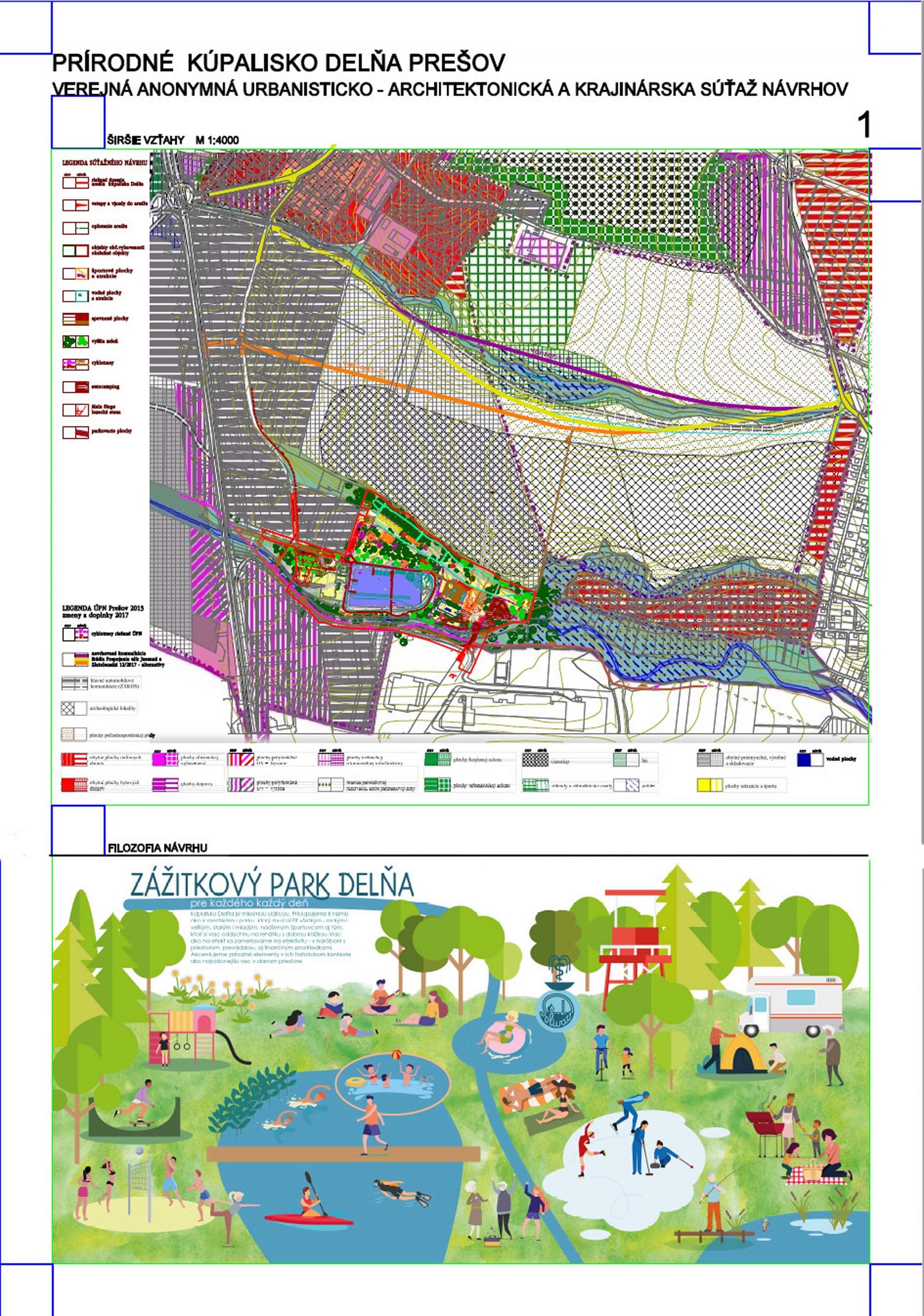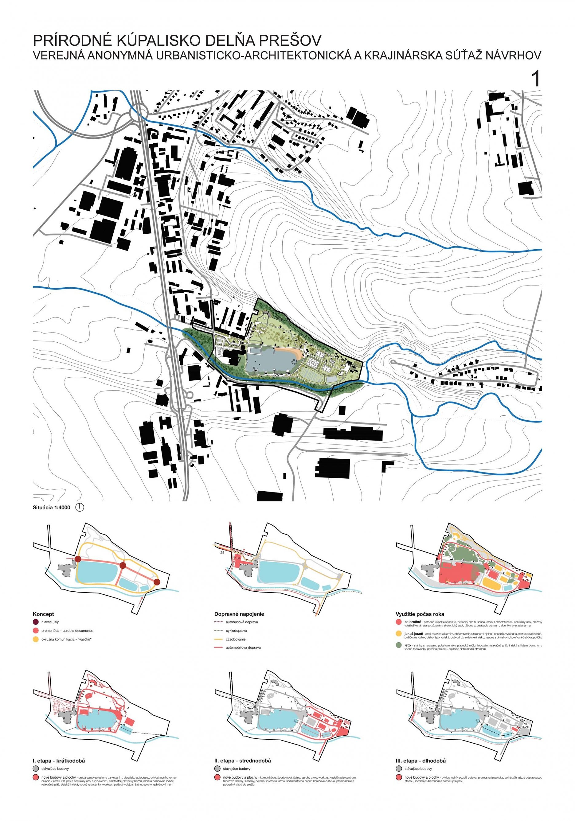 Hodnotenie poroty: Návrh prináša z priestorovo-kompozičného a prevádzkového hľadiska veľmi jednoznačný a čistý koncept, ktorého hlavnú os tvorí východo-západná pešia a obslužná trasa vedená od vstupu do areálu pozdĺž severného brehu vodnej nádrže. Na ňu kolmo nadväzuje severo-južná os, vedená od južného vstupu do areálu, ktorá oddeľuje sektor krátkodobej – dennej rekreácie a oddychu a pobytovej zóny s chatovou osadou a kempingom v zeleni. Tretím silným kompozično-prevádzkovým prvkom je horizontálna podnož - pavilón s vybavenosťou na západnom brehu nádrže, ktorý zjednocuje a prepája vstupné priestory do areálu s parterom hotela. Ako jeden z mála návrhov veľmi logicky a zároveň príťažlivo rieši nástup do vstupného priestoru areálu osadeného na návršie pomocou koridoru so stupňami a bezbariérovými rampami. Vstup je tak kvalitne akcentovaný podporený i striedmym a nadčasovým architektonickým výrazom. Silnou stránkou návrhu je tiež istá jednoduchosť až civilnosť architektonického a krajinárskeho riešenia, ktoré na jednej starne sústreďuje konkrétne aktivity do jednotlivých polôh a objektov a na druhej strane ponecháva veľa voľného, prírodného prostredia. Práca s kontrastom umožňuje optimálne vyznieť ako prírodnej, tak novovloženej architektonickej substancii, pričom sú vo vzájomnej symbióze. Návrh prináša v našich podmienkach výrazný invenčný prístup k riešeniu, ktoré má v prípade realizácie vysoký predpoklad prínosu i v širšom regionálnom a nadregionálnom kontexte. Na základe návrhu bude potrebné v ďalších fázach podrobnejšie dopracovať, resp. riešiť krajinárske úpravy, umiestnenie pobrežných rastlinných čistiacich zón, parkovisko pre kemp mimo biokoridoru rieky Delňa umiestnenie a statické riešenie toboganu mimo telesa hrádze nádrže šatne a sprchy pri vstupe do areálu.