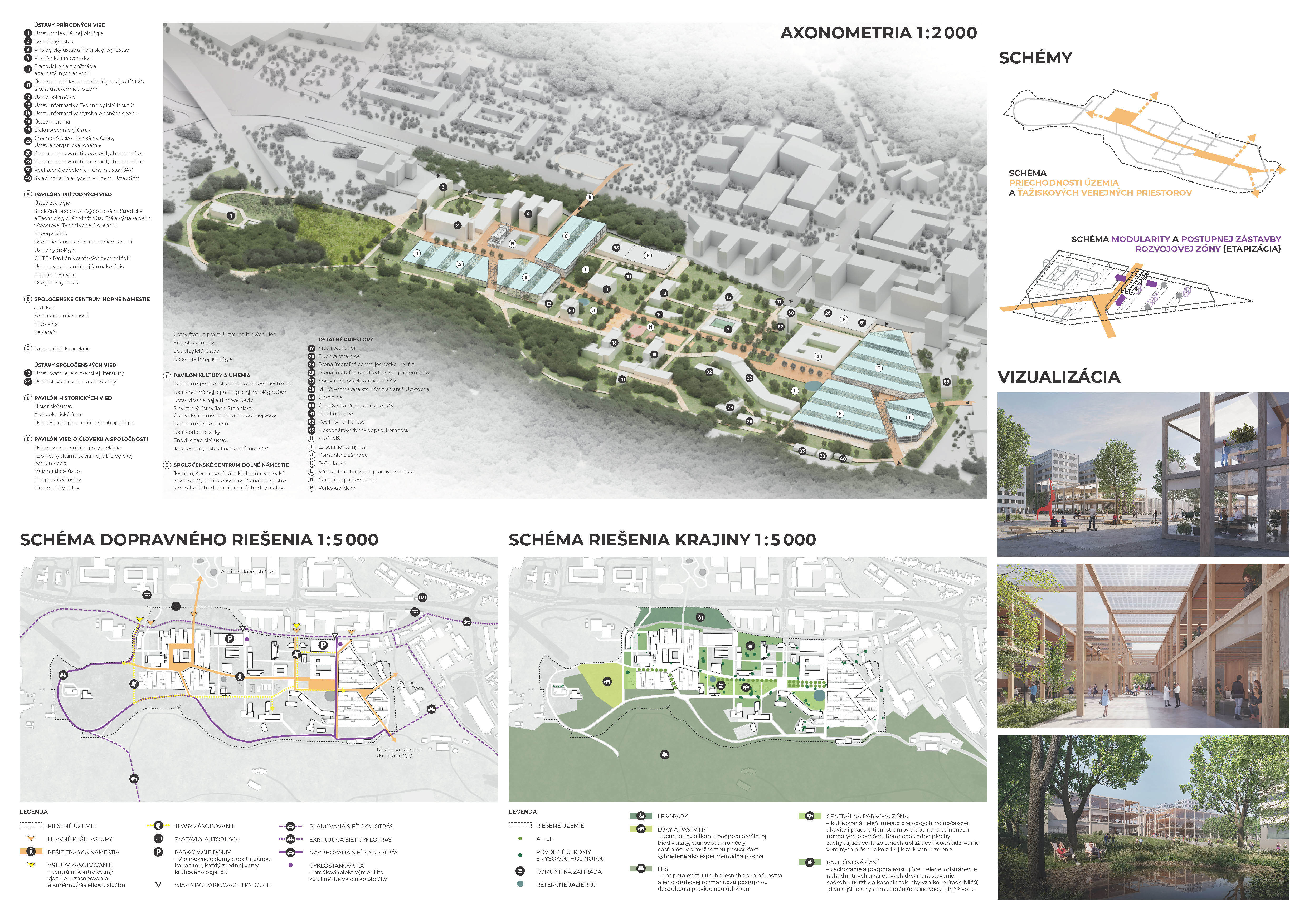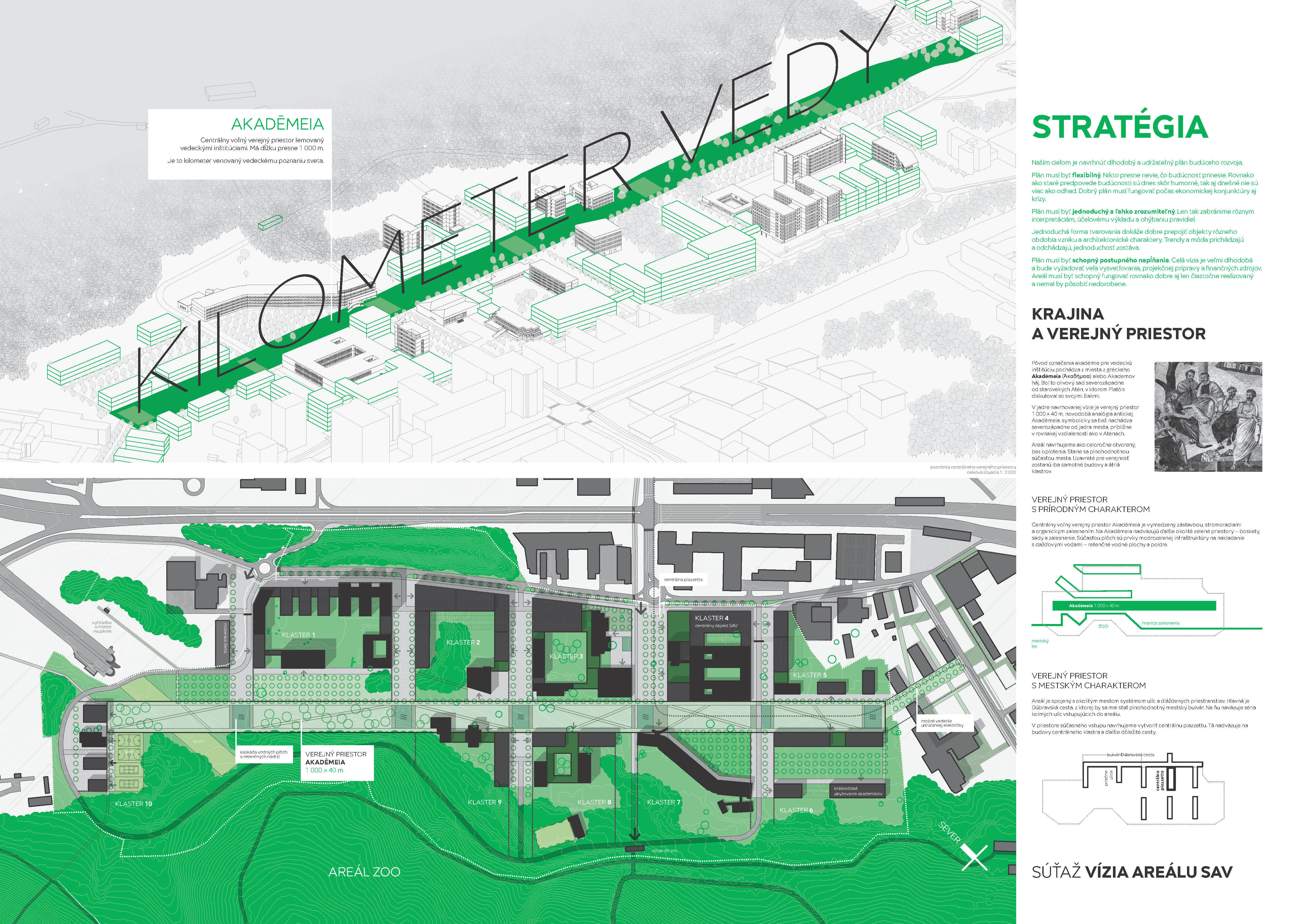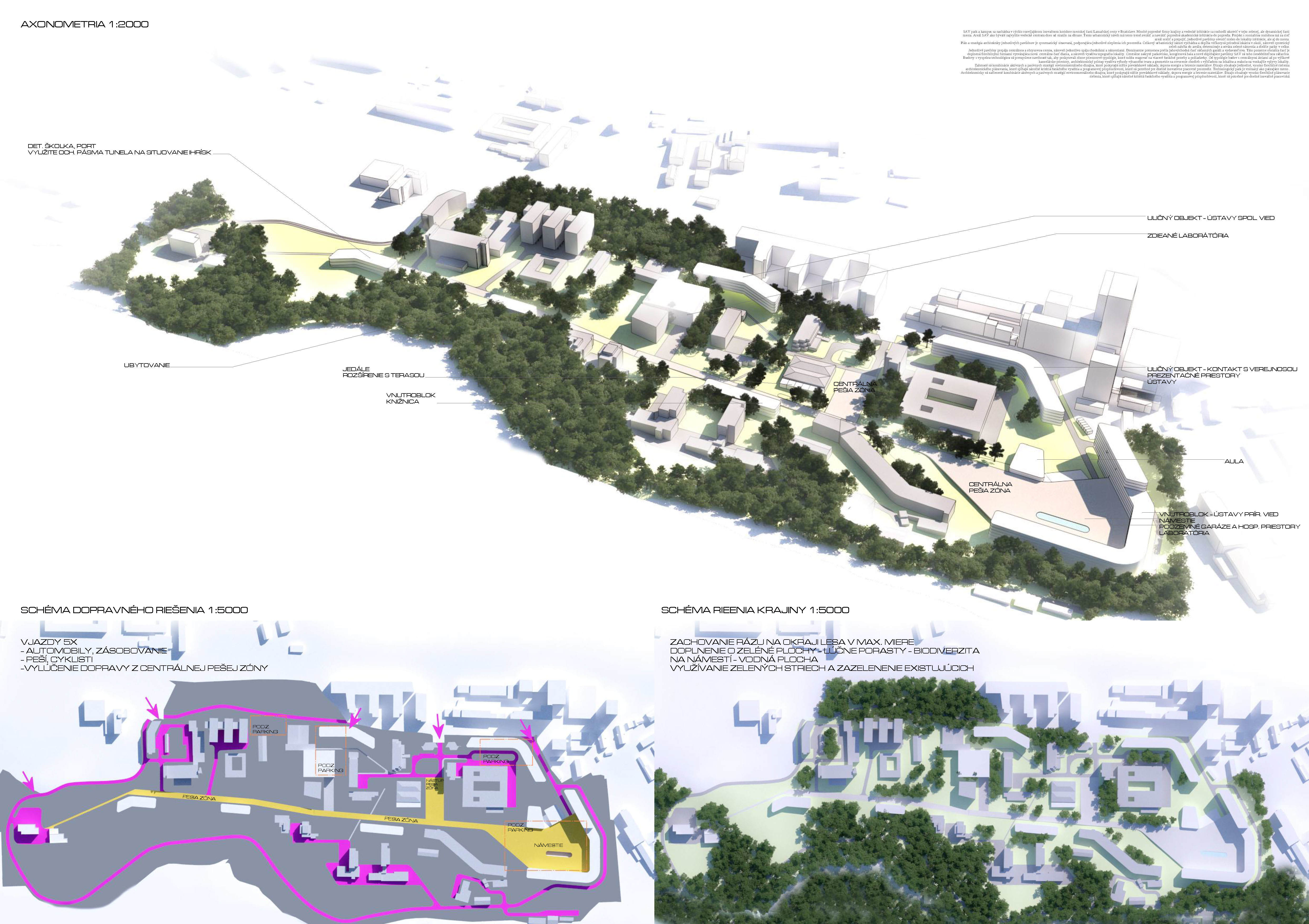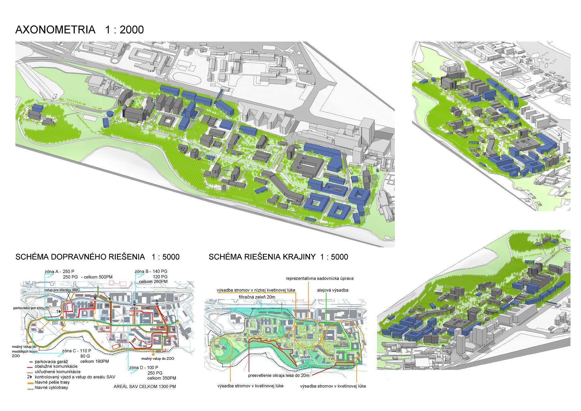 Celkové urbanistické riešenie je založené na silnom lineárnom prvku - osi, ktorá pretína areál SAV v pozdĺžnom smere a zároveň na rešpektovaní existujúcej hodnotnej architektúry a dopĺňaní urbanistickej štruktúry prevažne solitérnymi objektami - jednotlivými pavilónmi. Na os nadväzujú verejné priestory usporiadané v "mriežke". Jednotlivé časti mriežky ponúkajú rôzne typy náplne, pobytovej kvality či druhu vegetácie, zároveň sú predelené riadkovou výsadbou stromov. Silný lineárny koncept je výhodou aj nevýhodou zároveň, hlavne vo východnej časti zostáva nedopovedaný a necháva otvorené rôzne možnosti na jeho interpretáciu, podobne ako dopĺňanie štruktúry areálu solitérmi, ktorá môže mať aj zásadný vplyv na etapizáciu a výslednú transformáciu areálu. Rozvoj areálu je postavený na dopĺňaní jednotlivých objektov prevažne formou solitérov s výraznou a jasne čitateľnou geometriou reagujúcou na existujúcu zástavbu a navrhovaný verejný priestor. Porota oceňuje čitateľný pohľad na riešenie nástupných priestorov do jednotlivých objektov, ich nenáročnú aktivizáciu, prácu s existujúcimi, ale aj navrhovanými výtvarnými dielami, drobnou architektúrou, intervenciami vo verejnom priestore, či informačným systémom. Návrh sa ťažiskovo zameriava na centrálnu časť v rámci pozdĺžnej osi areálu, ale priestorové kvality na oboch jej koncoch sú otázne.