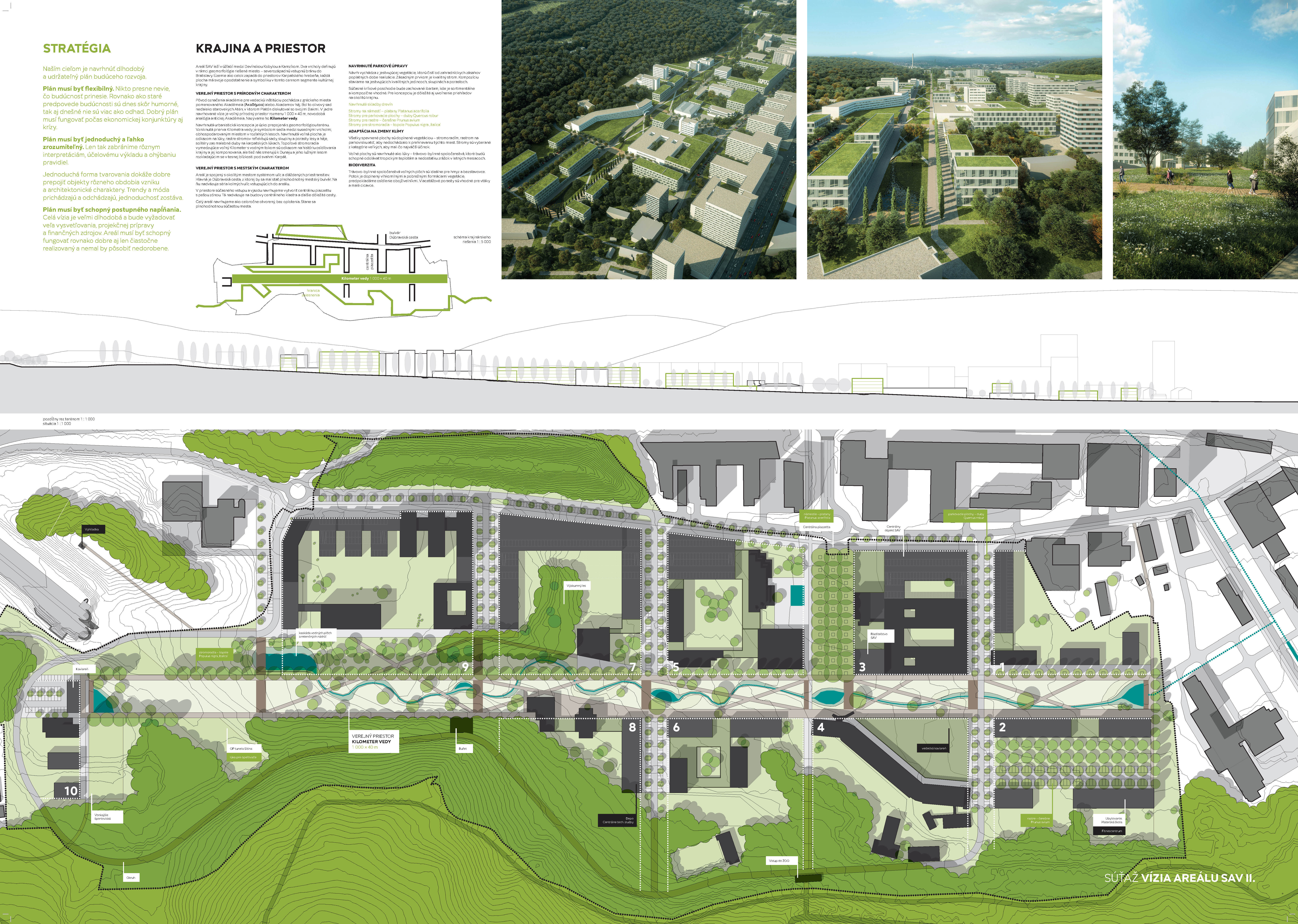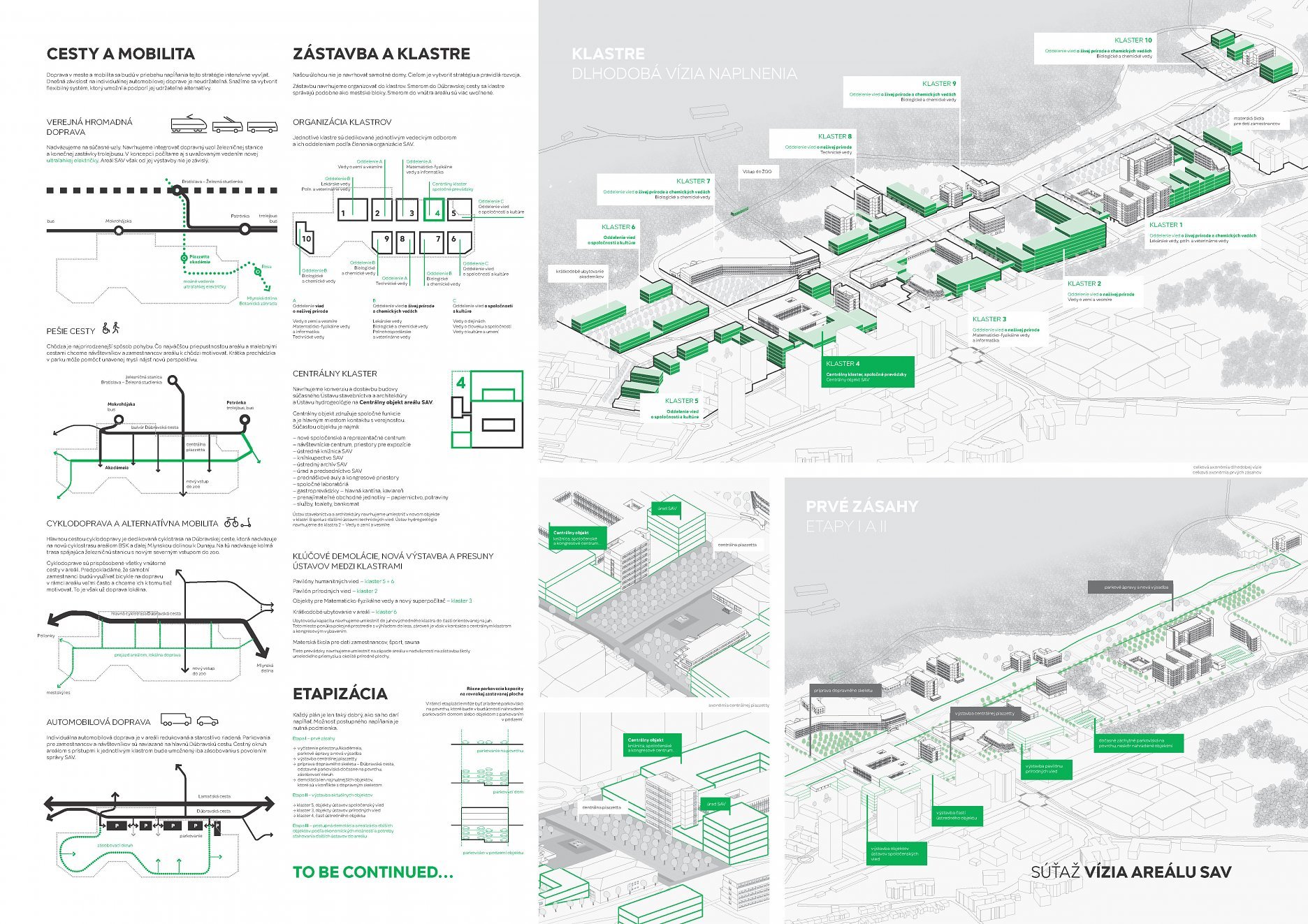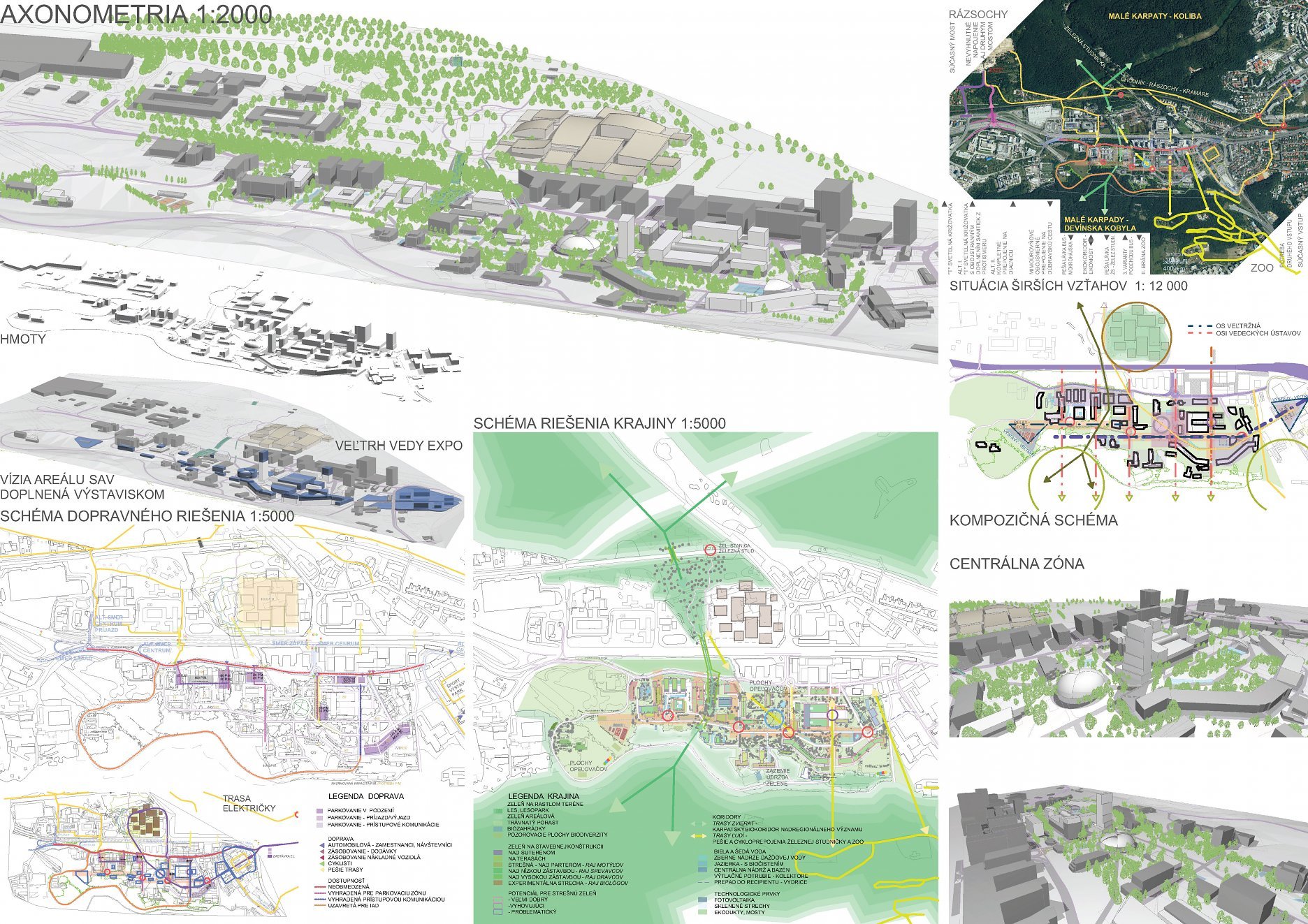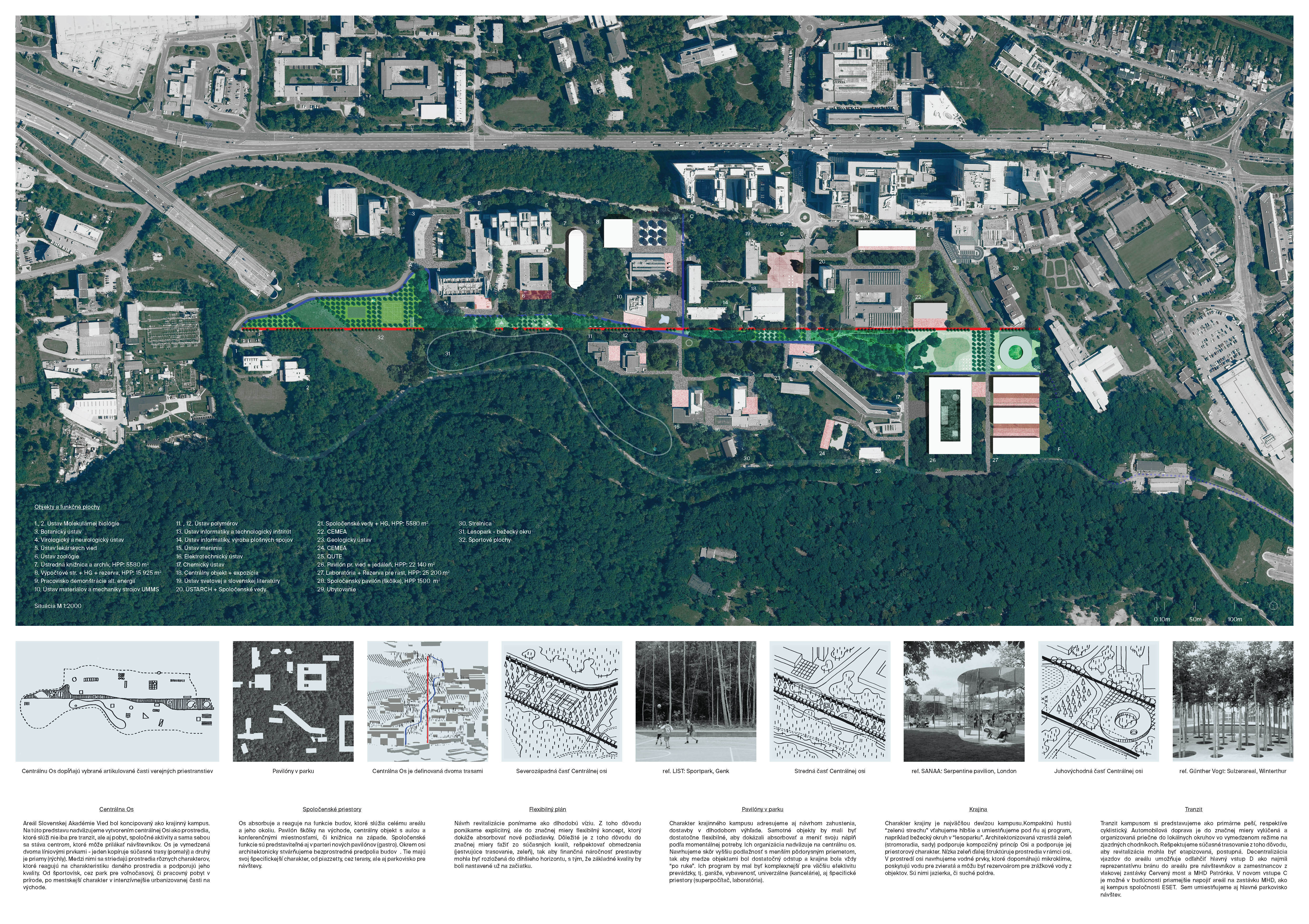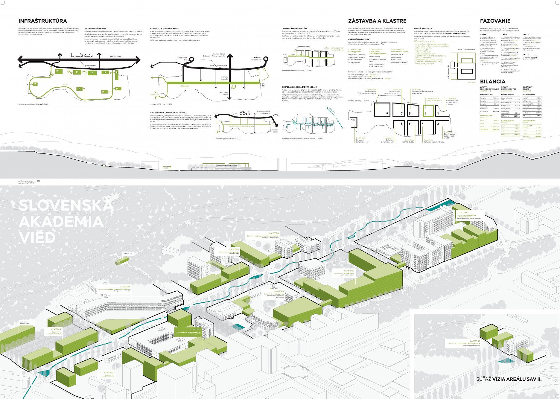 Celkové urbanistické riešenie je založené na silnom lineárnom prvku - osi, ktorá pretína areál SAV v pozdĺžnom smere a zároveň na rešpektovaní existujúcej hodnotnej architektúry a dopĺňaní urbanistickej štruktúry prevažne solitérnymi objektami - jednotlivými pavilónmi. Na os nadväzujú verejné priestory usporiadané v "mriežke". Jednotlivé časti mriežky ponúkajú rôzne typy náplne, pobytovej kvality či druhu vegetácie, zároveň sú predelené riadkovou výsadbou stromov. Silný lineárny koncept je výhodou aj nevýhodou zároveň, hlavne vo východnej časti zostáva nedopovedaný a necháva otvorené rôzne možnosti na jeho interpretáciu, podobne ako dopĺňanie štruktúry areálu solitérmi, ktorá môže mať aj zásadný vplyv na etapizáciu a výslednú transformáciu areálu. Rozvoj areálu je postavený na dopĺňaní jednotlivých objektov prevažne formou solitérov s výraznou a jasne čitateľnou geometriou reagujúcou na existujúcu zástavbu a navrhovaný verejný priestor. Porota oceňuje čitateľný pohľad na riešenie nástupných priestorov do jednotlivých objektov, ich nenáročnú aktivizáciu, prácu s existujúcimi, ale aj navrhovanými výtvarnými dielami, drobnou architektúrou, intervenciami vo verejnom priestore, či informačným systémom. Návrh sa ťažiskovo zameriava na centrálnu časť v rámci pozdĺžnej osi areálu, ale priestorové kvality na oboch jej koncoch sú otázne.