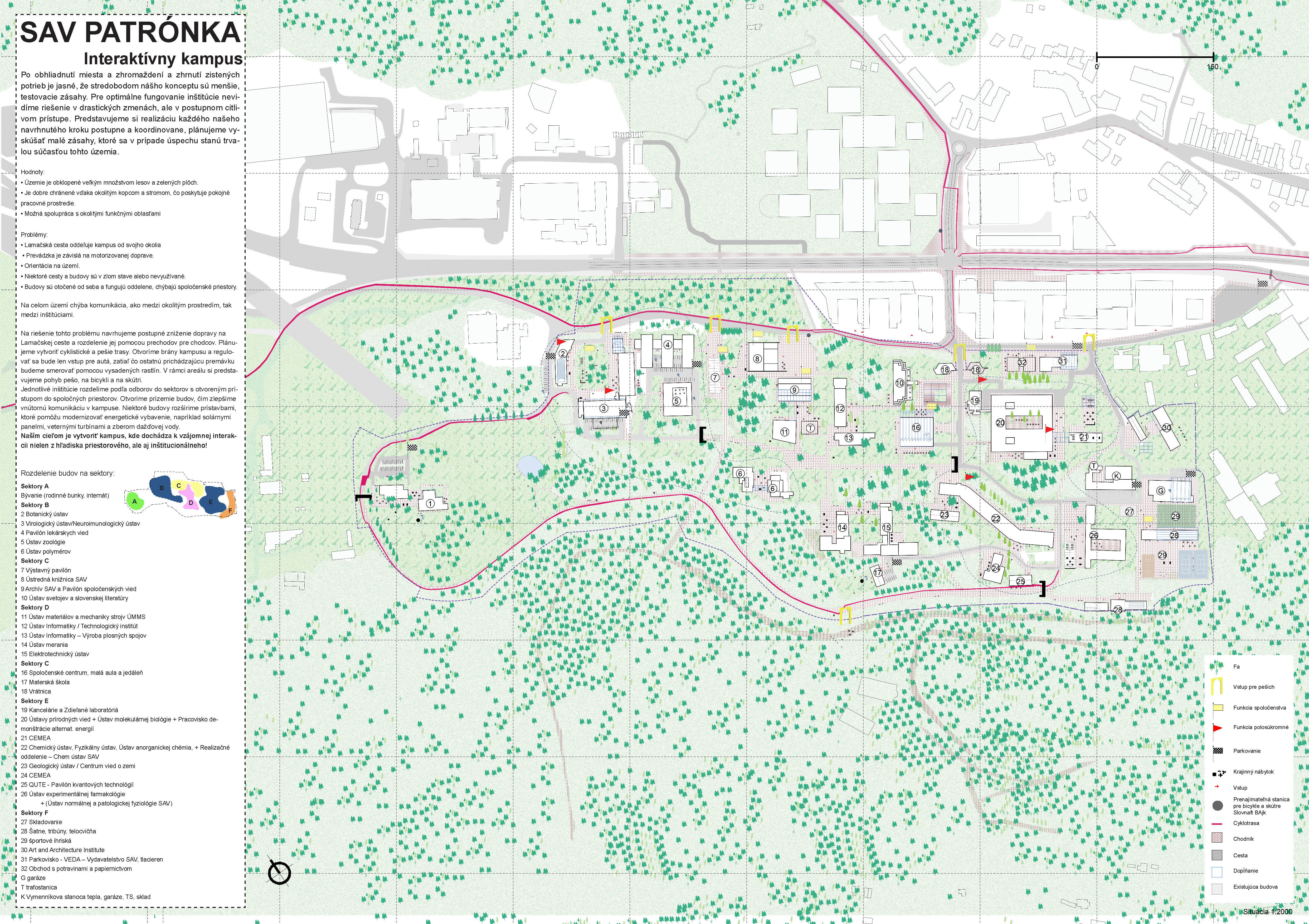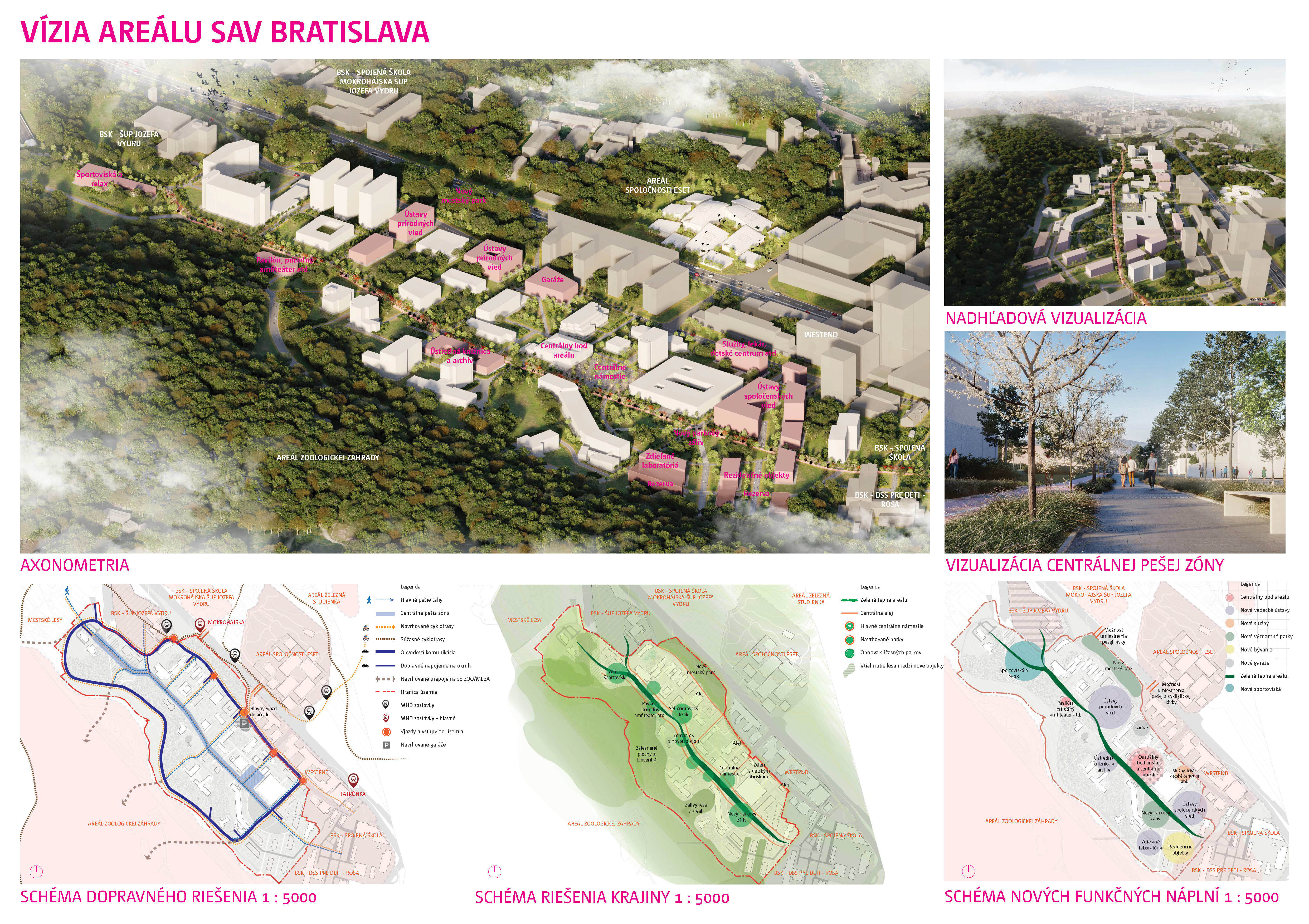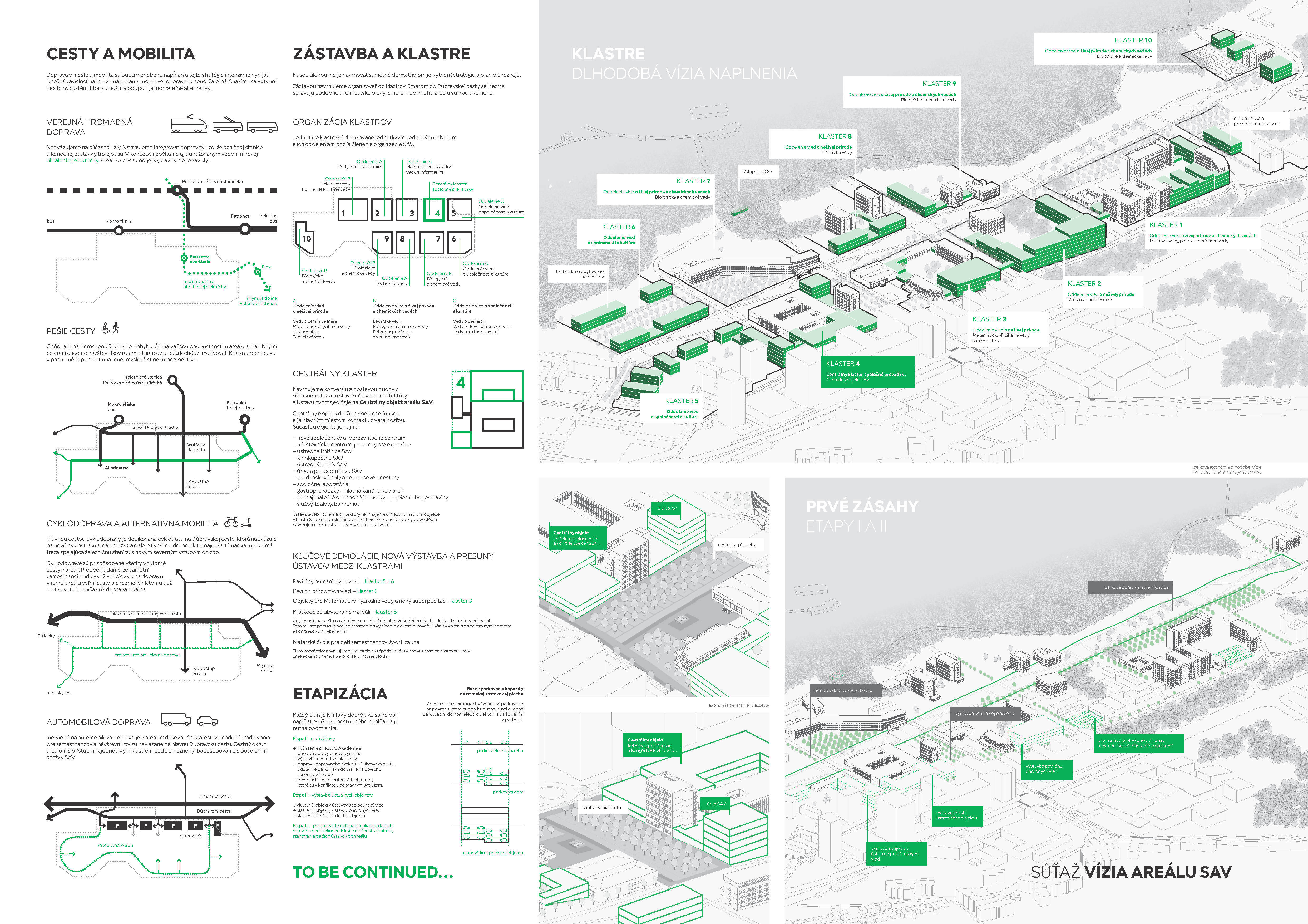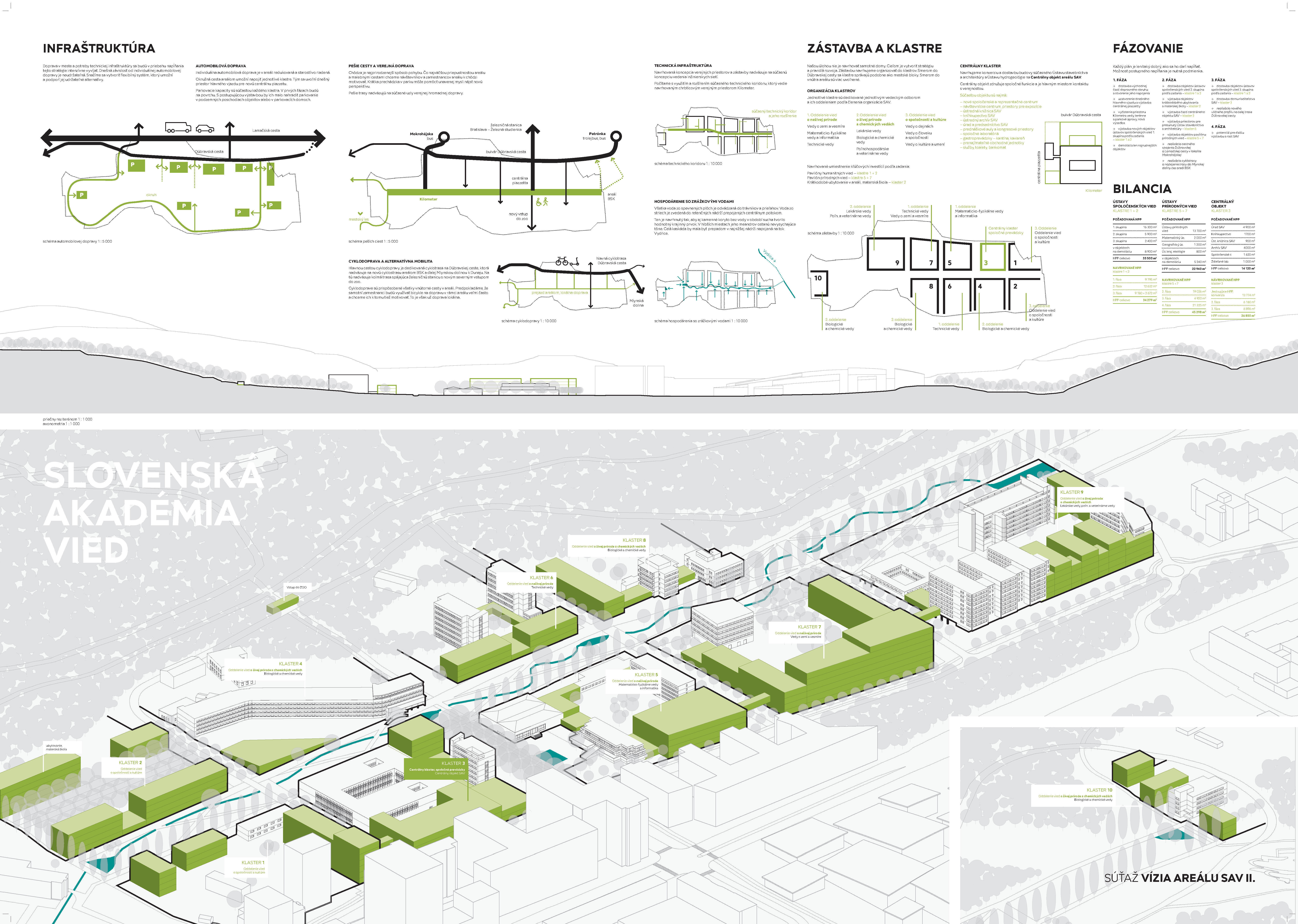 Celkové urbanistické riešenie je založené na silnom lineárnom prvku - osi, ktorá pretína areál SAV v pozdĺžnom smere a zároveň na rešpektovaní existujúcej hodnotnej architektúry a dopĺňaní urbanistickej štruktúry prevažne solitérnymi objektami - jednotlivými pavilónmi. Na os nadväzujú verejné priestory usporiadané v "mriežke". Jednotlivé časti mriežky ponúkajú rôzne typy náplne, pobytovej kvality či druhu vegetácie, zároveň sú predelené riadkovou výsadbou stromov. Silný lineárny koncept je výhodou aj nevýhodou zároveň, hlavne vo východnej časti zostáva nedopovedaný a necháva otvorené rôzne možnosti na jeho interpretáciu, podobne ako dopĺňanie štruktúry areálu solitérmi, ktorá môže mať aj zásadný vplyv na etapizáciu a výslednú transformáciu areálu. Rozvoj areálu je postavený na dopĺňaní jednotlivých objektov prevažne formou solitérov s výraznou a jasne čitateľnou geometriou reagujúcou na existujúcu zástavbu a navrhovaný verejný priestor. Porota oceňuje čitateľný pohľad na riešenie nástupných priestorov do jednotlivých objektov, ich nenáročnú aktivizáciu, prácu s existujúcimi, ale aj navrhovanými výtvarnými dielami, drobnou architektúrou, intervenciami vo verejnom priestore, či informačným systémom. Návrh sa ťažiskovo zameriava na centrálnu časť v rámci pozdĺžnej osi areálu, ale priestorové kvality na oboch jej koncoch sú otázne.
