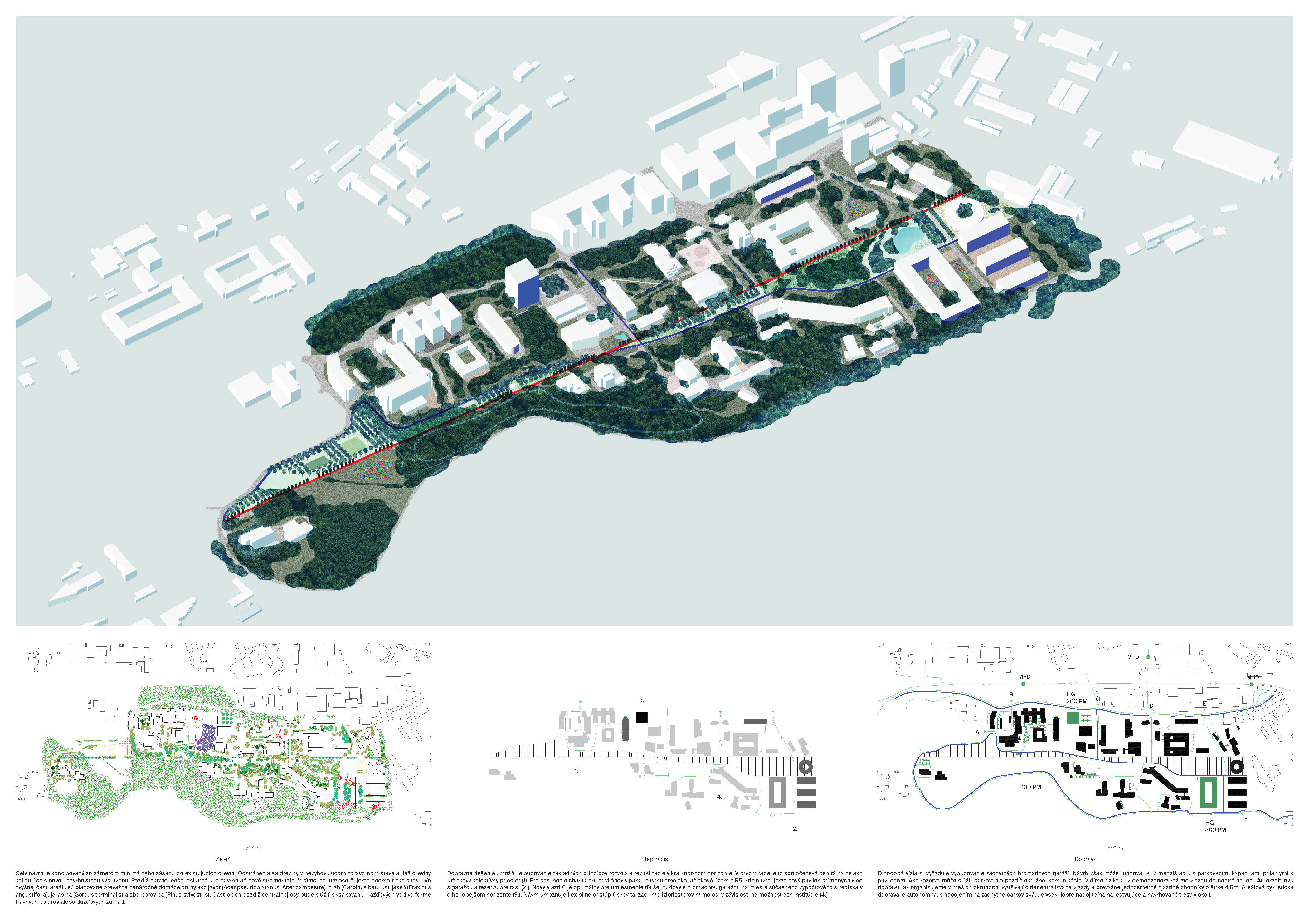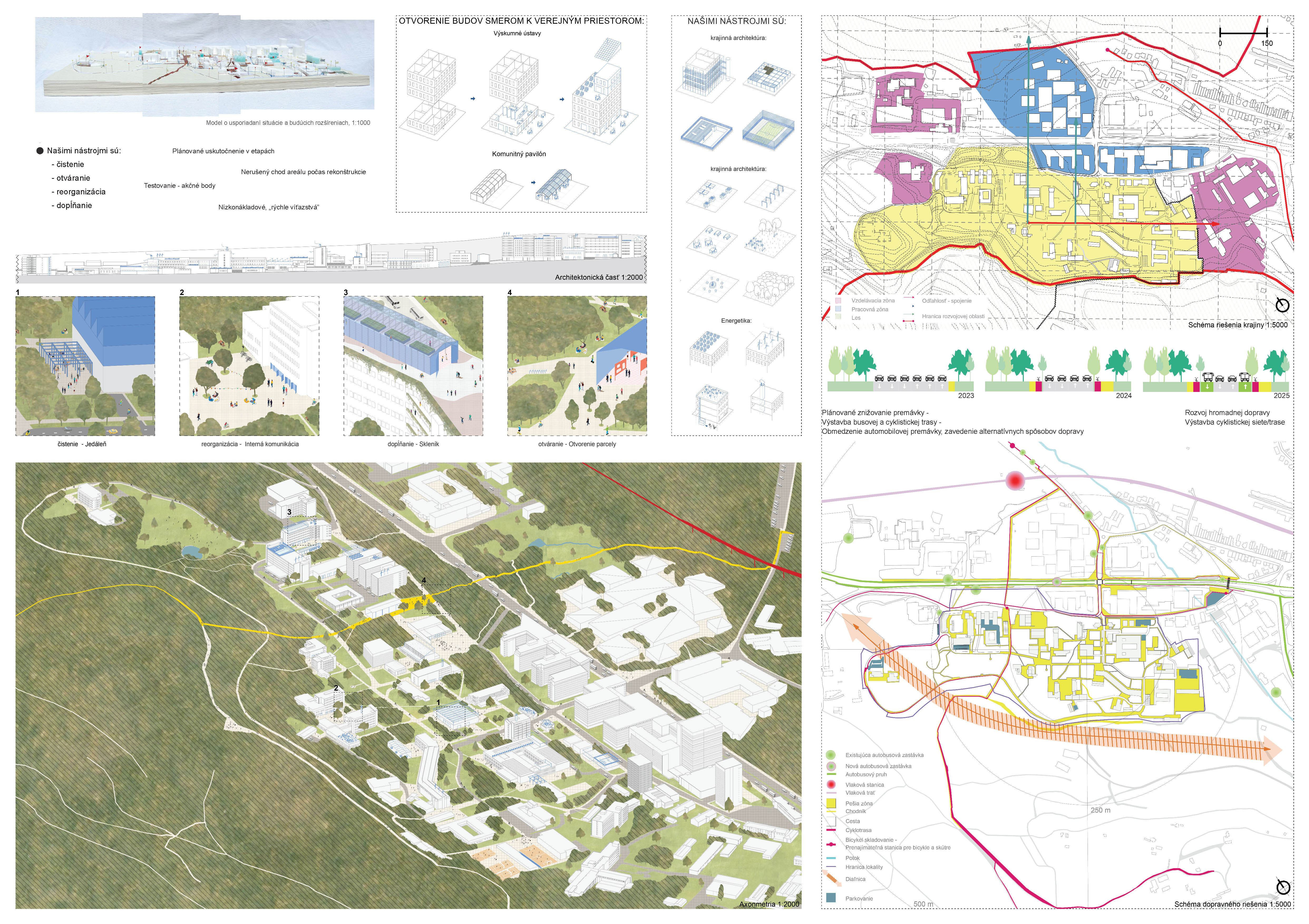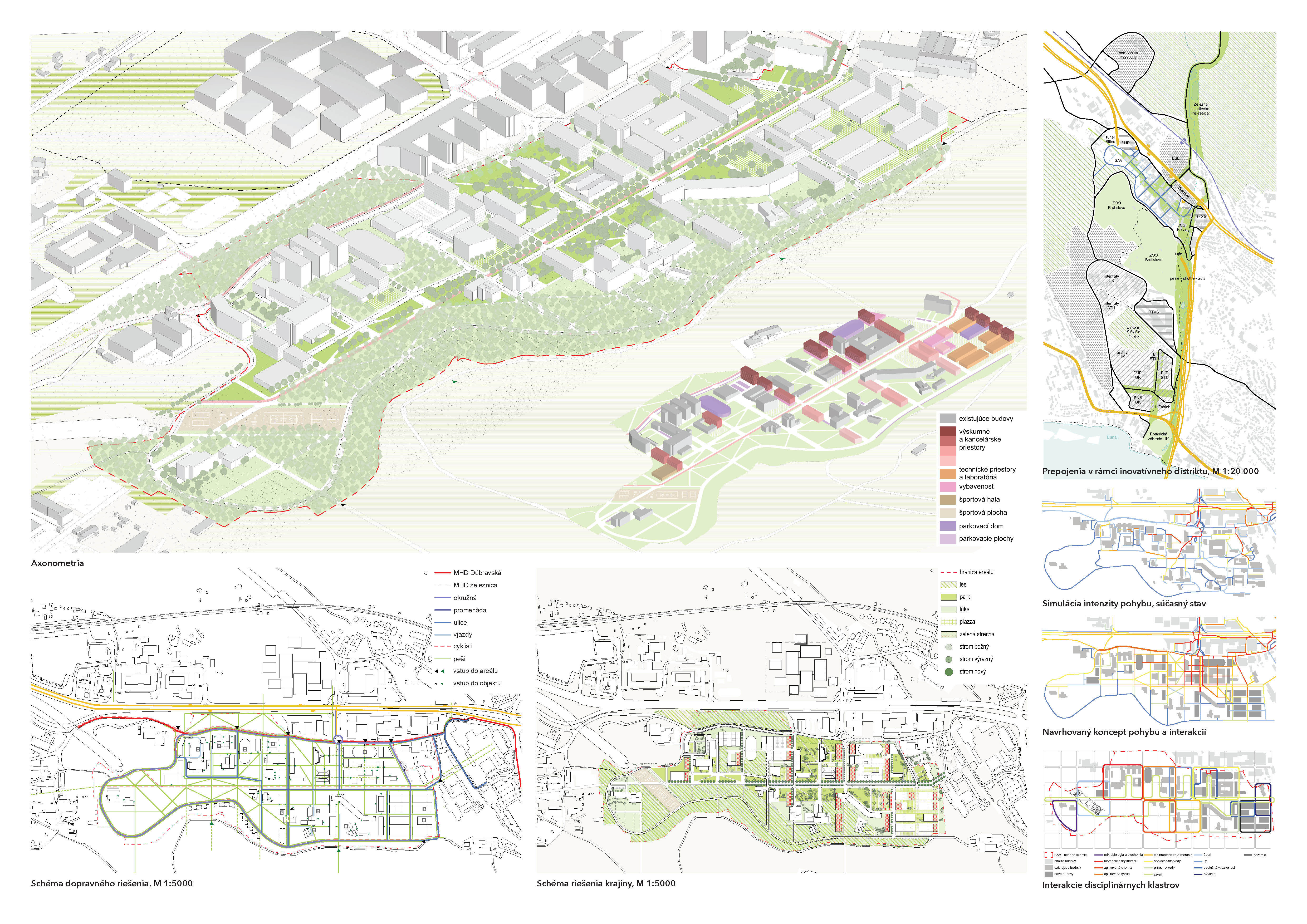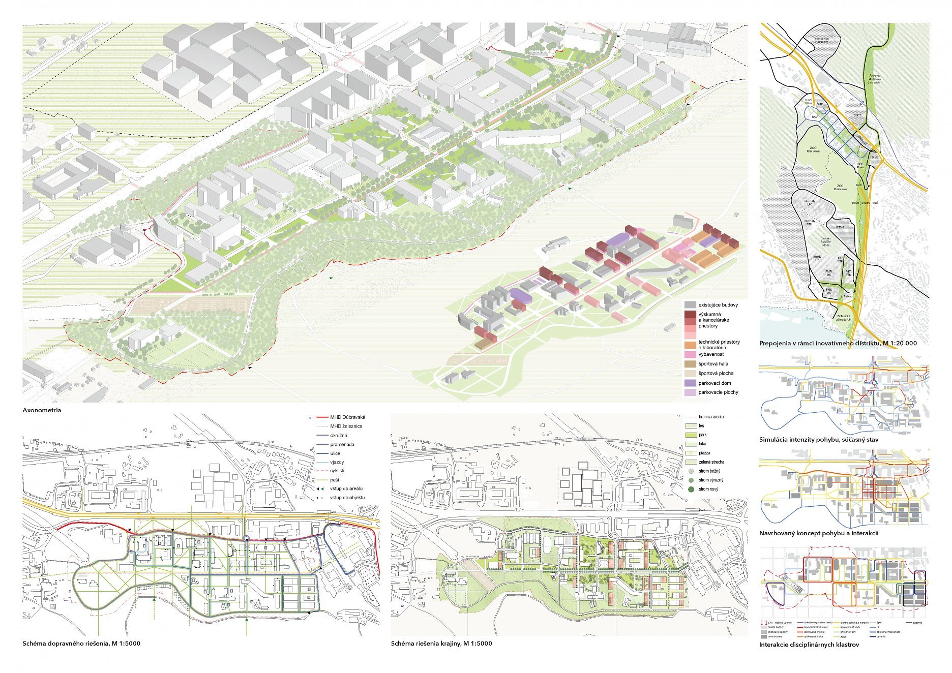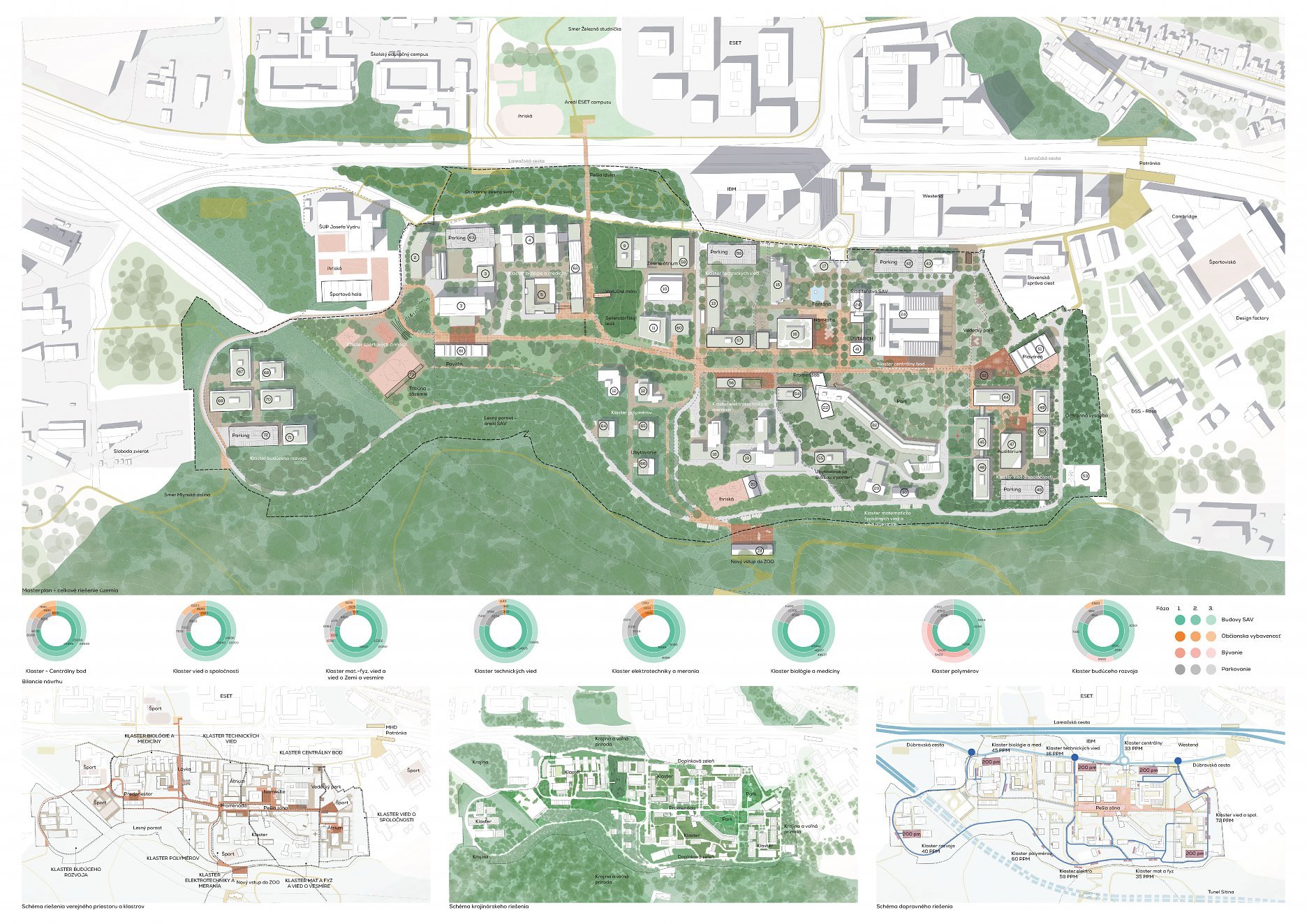 Celkové urbanistické riešenie je založené na silnom lineárnom prvku - osi, ktorá pretína areál SAV v pozdĺžnom smere a zároveň na rešpektovaní existujúcej hodnotnej architektúry a dopĺňaní urbanistickej štruktúry prevažne solitérnymi objektami - jednotlivými pavilónmi. Na os nadväzujú verejné priestory usporiadané v "mriežke". Jednotlivé časti mriežky ponúkajú rôzne typy náplne, pobytovej kvality či druhu vegetácie, zároveň sú predelené riadkovou výsadbou stromov. Silný lineárny koncept je výhodou aj nevýhodou zároveň, hlavne vo východnej časti zostáva nedopovedaný a necháva otvorené rôzne možnosti na jeho interpretáciu, podobne ako dopĺňanie štruktúry areálu solitérmi, ktorá môže mať aj zásadný vplyv na etapizáciu a výslednú transformáciu areálu. Rozvoj areálu je postavený na dopĺňaní jednotlivých objektov prevažne formou solitérov s výraznou a jasne čitateľnou geometriou reagujúcou na existujúcu zástavbu a navrhovaný verejný priestor. Porota oceňuje čitateľný pohľad na riešenie nástupných priestorov do jednotlivých objektov, ich nenáročnú aktivizáciu, prácu s existujúcimi, ale aj navrhovanými výtvarnými dielami, drobnou architektúrou, intervenciami vo verejnom priestore, či informačným systémom. Návrh sa ťažiskovo zameriava na centrálnu časť v rámci pozdĺžnej osi areálu, ale priestorové kvality na oboch jej koncoch sú otázne.