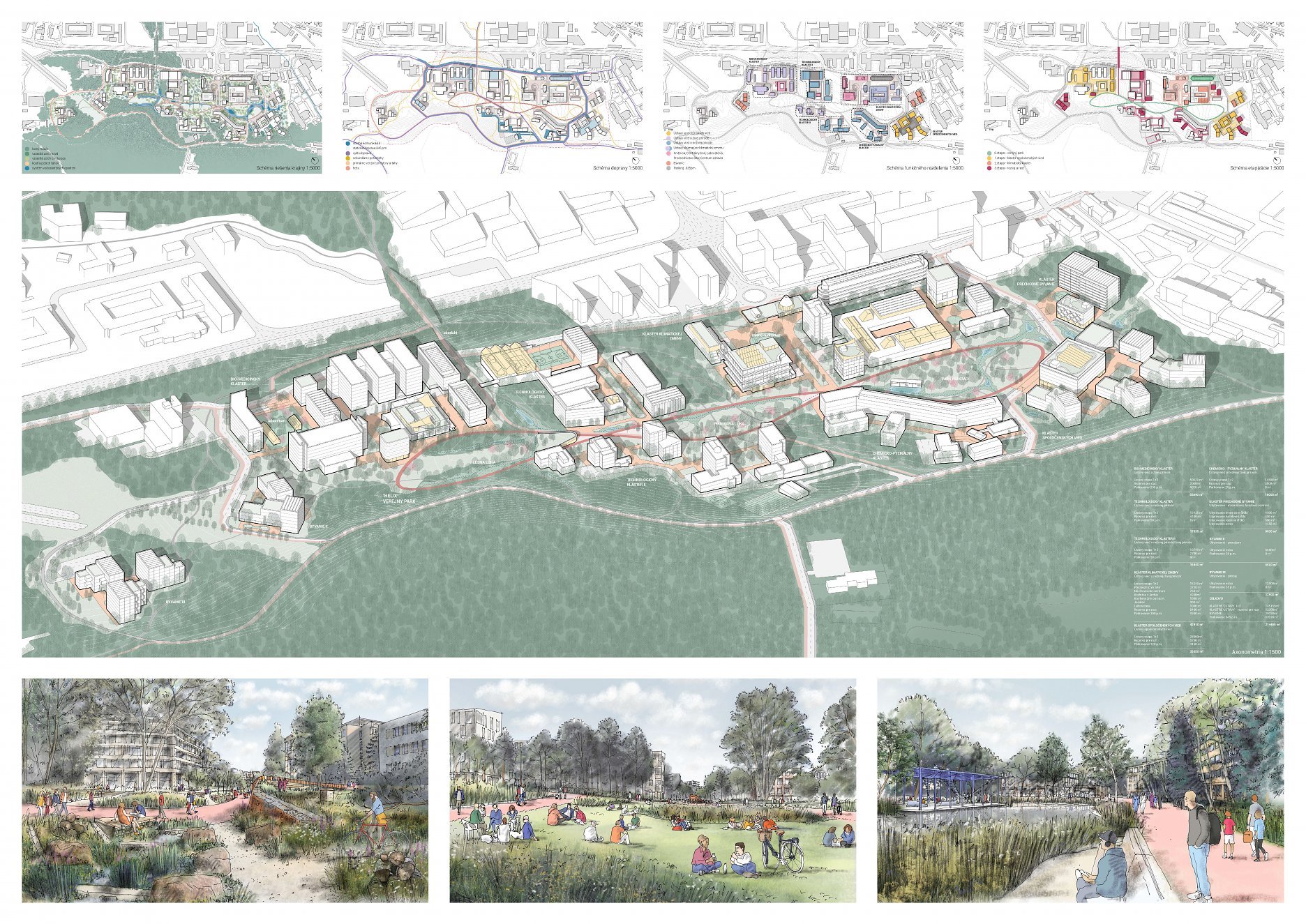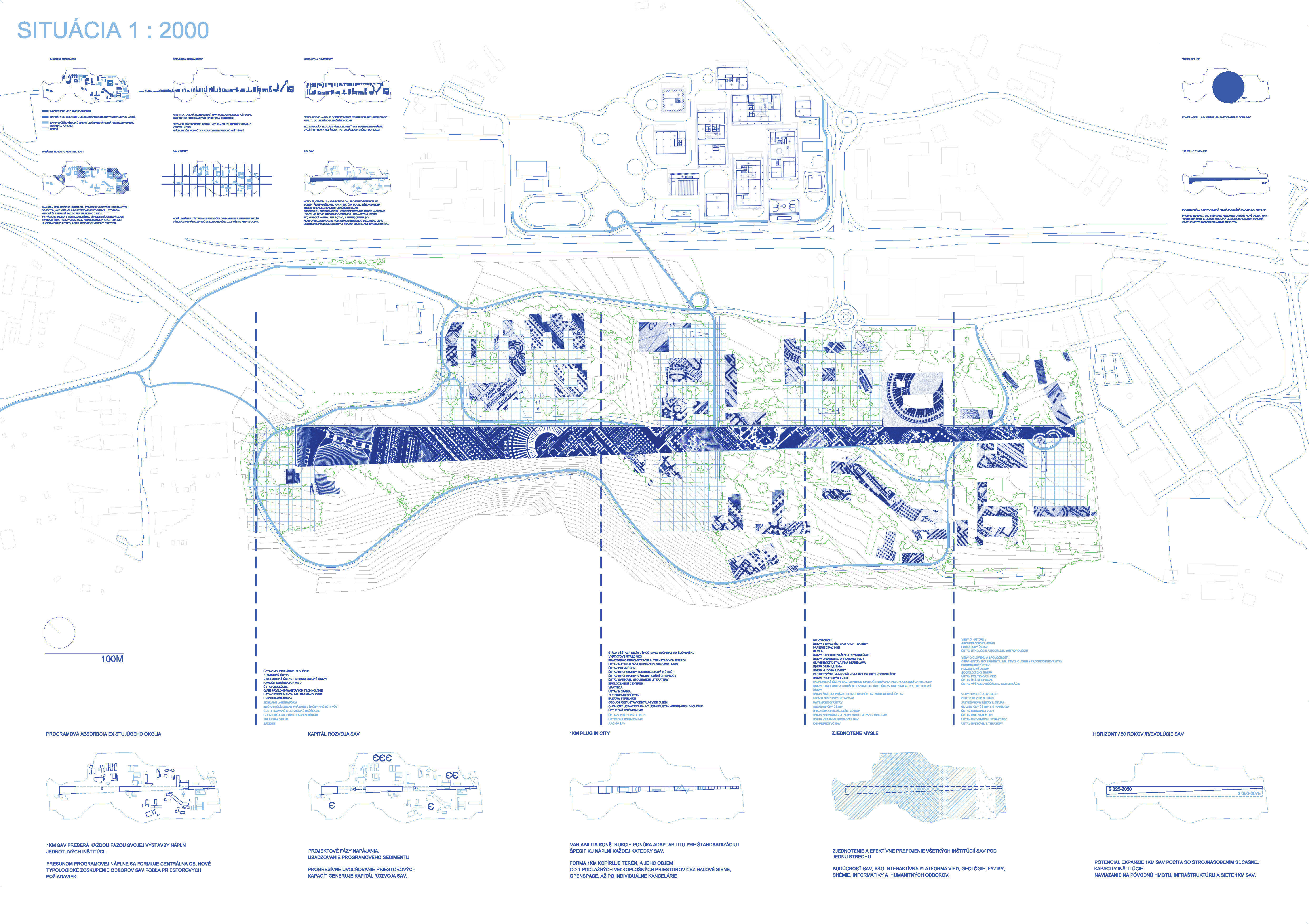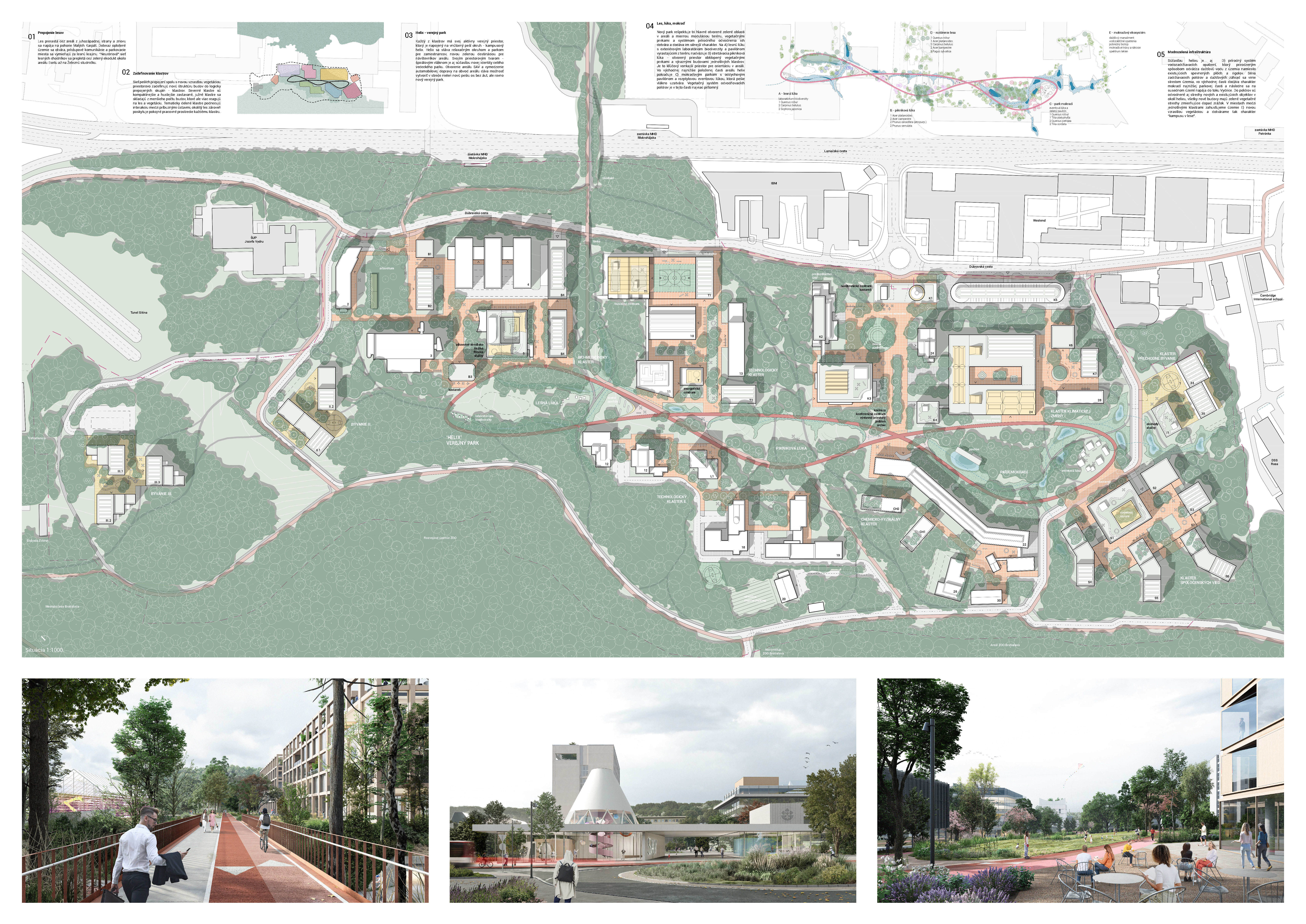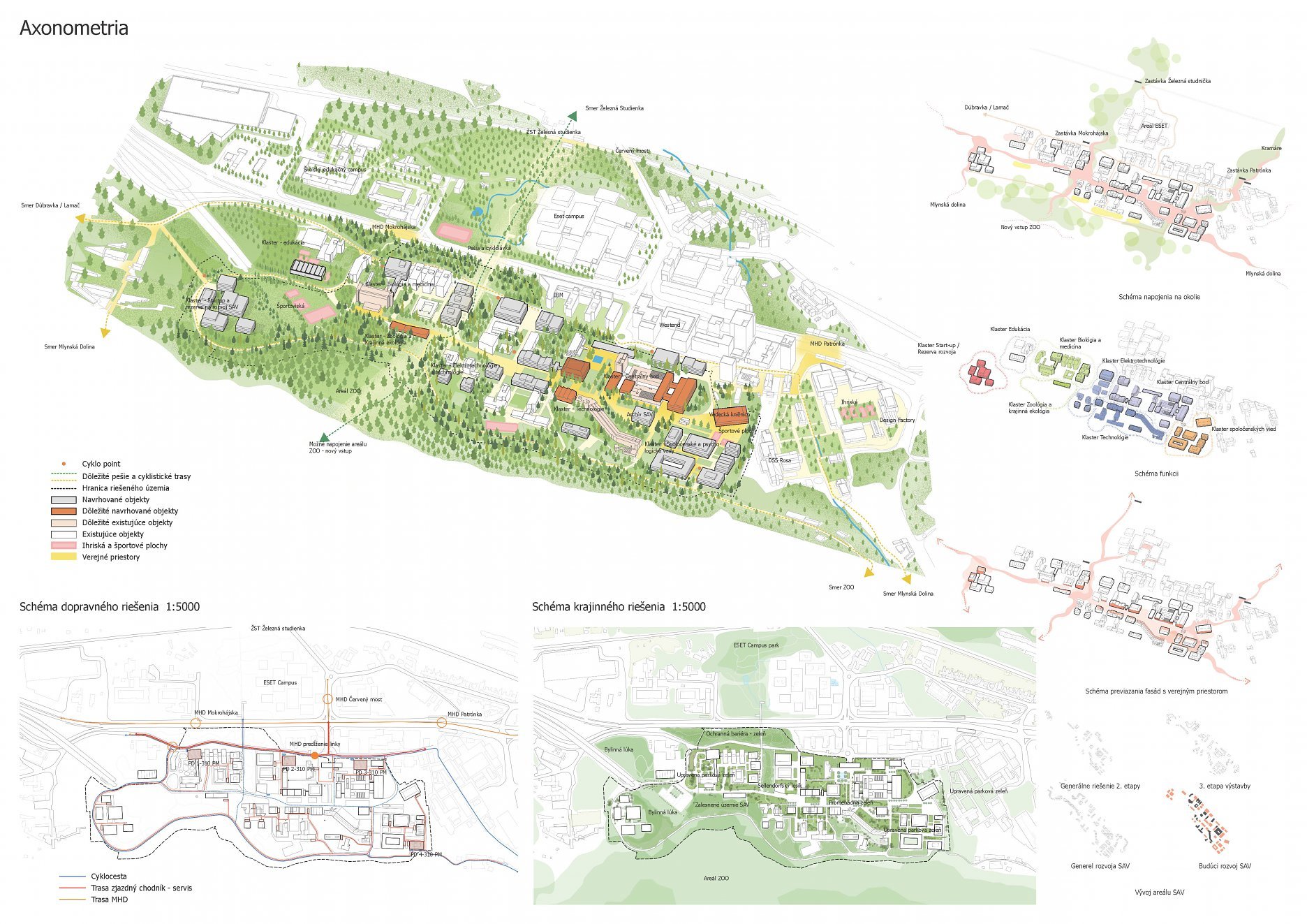 Celkové urbanistické riešenie je založené na silnom lineárnom prvku - osi, ktorá pretína areál SAV v pozdĺžnom smere a zároveň na rešpektovaní existujúcej hodnotnej architektúry a dopĺňaní urbanistickej štruktúry prevažne solitérnymi objektami - jednotlivými pavilónmi. Na os nadväzujú verejné priestory usporiadané v "mriežke". Jednotlivé časti mriežky ponúkajú rôzne typy náplne, pobytovej kvality či druhu vegetácie, zároveň sú predelené riadkovou výsadbou stromov. Silný lineárny koncept je výhodou aj nevýhodou zároveň, hlavne vo východnej časti zostáva nedopovedaný a necháva otvorené rôzne možnosti na jeho interpretáciu, podobne ako dopĺňanie štruktúry areálu solitérmi, ktorá môže mať aj zásadný vplyv na etapizáciu a výslednú transformáciu areálu. Rozvoj areálu je postavený na dopĺňaní jednotlivých objektov prevažne formou solitérov s výraznou a jasne čitateľnou geometriou reagujúcou na existujúcu zástavbu a navrhovaný verejný priestor. Porota oceňuje čitateľný pohľad na riešenie nástupných priestorov do jednotlivých objektov, ich nenáročnú aktivizáciu, prácu s existujúcimi, ale aj navrhovanými výtvarnými dielami, drobnou architektúrou, intervenciami vo verejnom priestore, či informačným systémom. Návrh sa ťažiskovo zameriava na centrálnu časť v rámci pozdĺžnej osi areálu, ale priestorové kvality na oboch jej koncoch sú otázne.