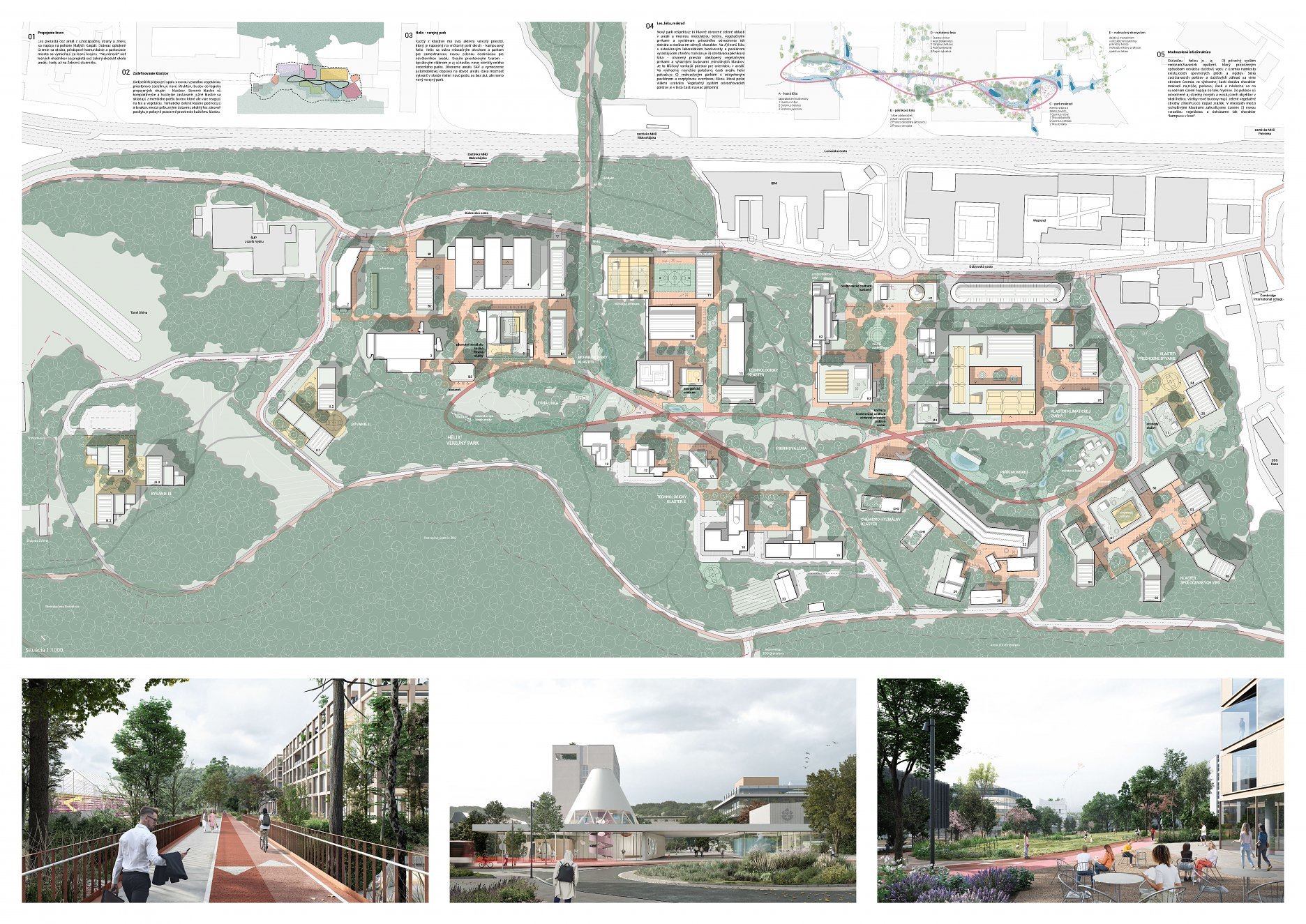 Usporiadanie stavieb do klastrov podľa vedných odborov je vhodné, čo platí aj pre ich formovanie do podoby mestských blokov pozdĺž Dúbravskej cesty, ktoré zakladá jej mestskú podobu. Vznik ulice charakteru mestskej triedy tu však nie je pre priestorové limity realistický. Elegantný je návrh vstupnej piazzetty, naopak nepresvedčivé je podanie "vnútroblokov" klastrov.