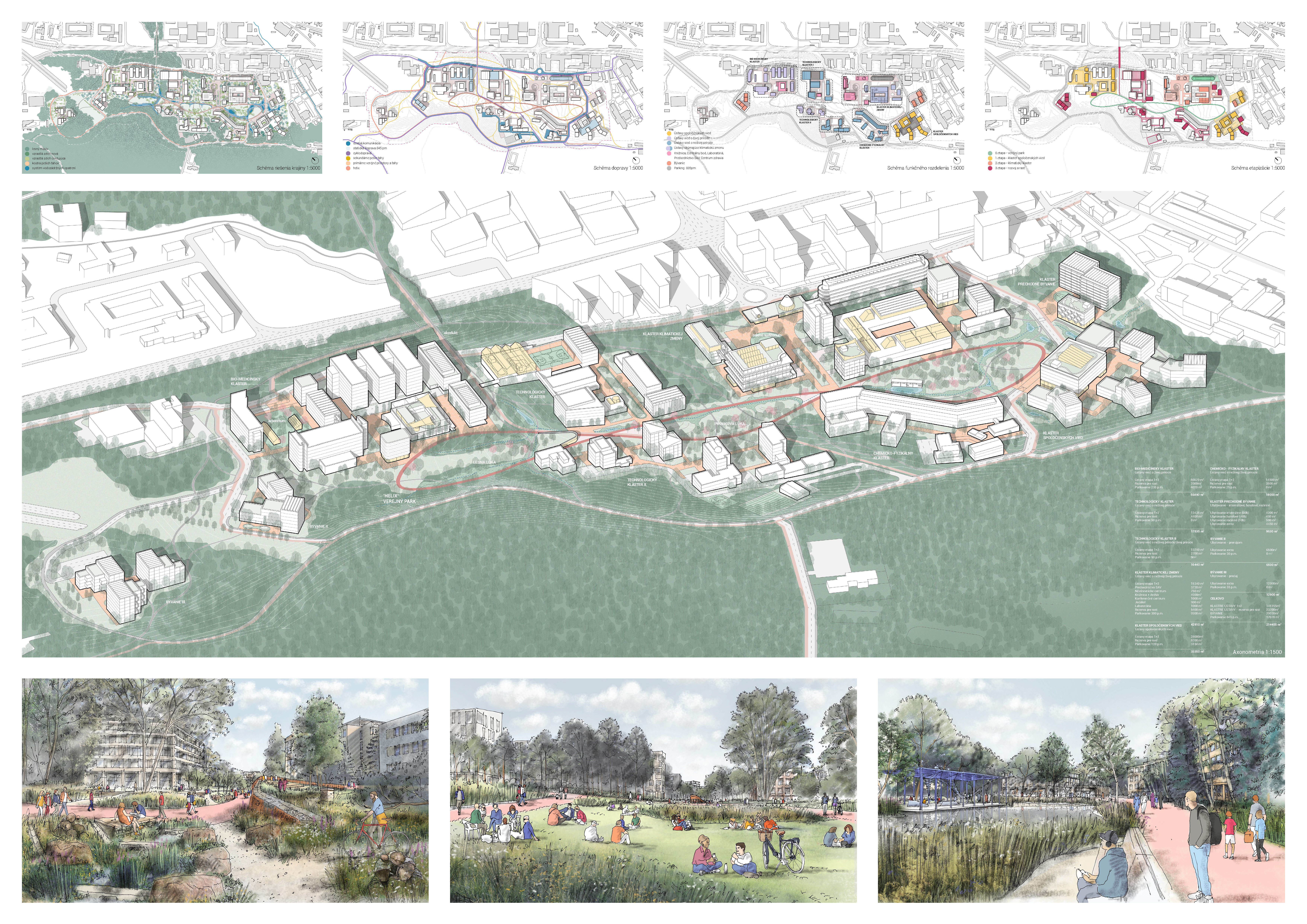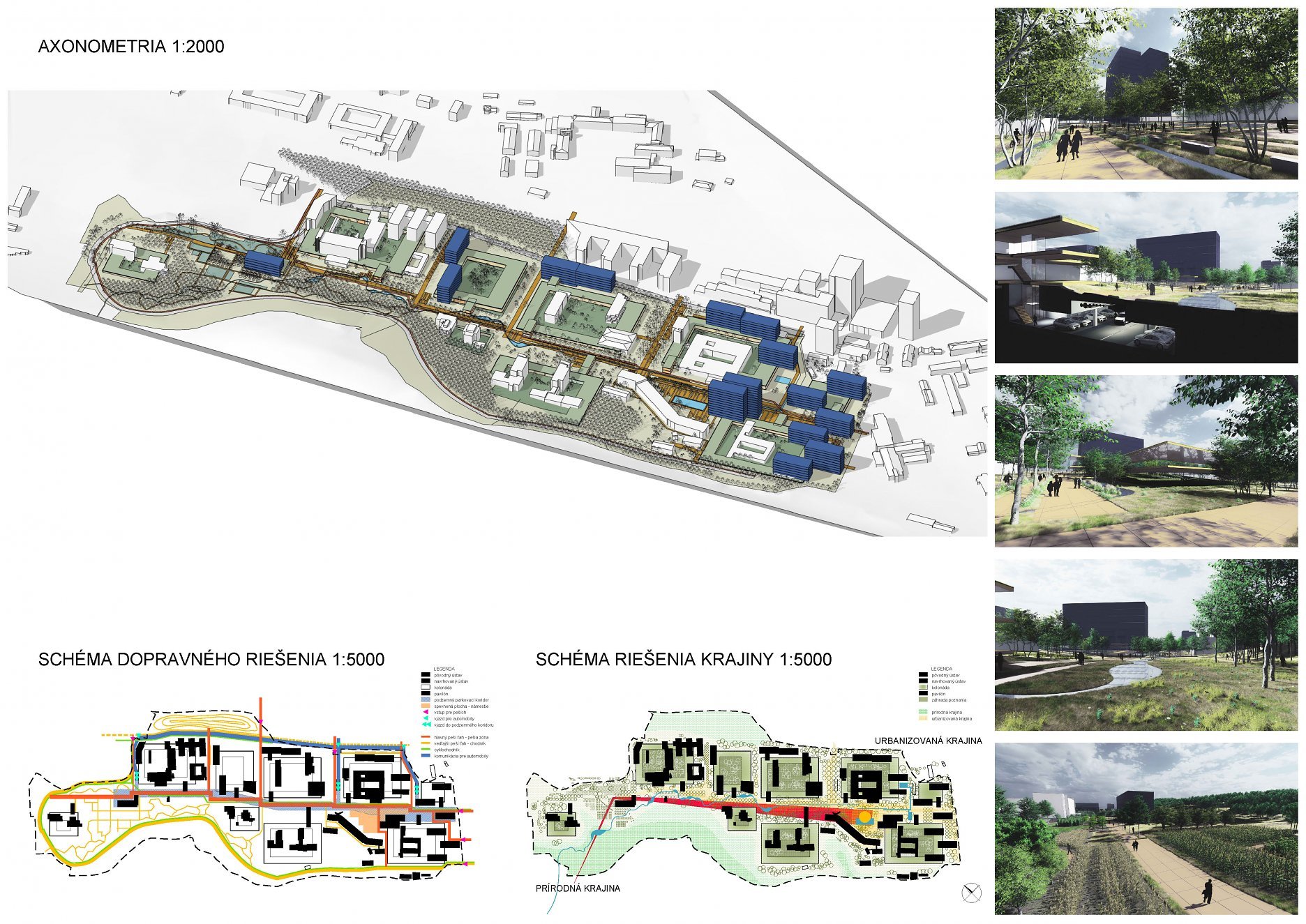 Z krajinárskeho pohľadu sa návrh koncentruje primárne na centrálnu os. To otvorilo viacero otázok. Spomínaná os reaguje na kontext širšieho okolia kontrastným charakterom mestskej krajiny. Ponúka flexibilitu, ale vzťah s jednotlivými klastrami ako potenciálom a pridanou hodnotou tejto silnej myšlienky zostal v nedopovedanej rovine. Dopravná obsluha je vhodne riešená. Porota oceňuje zrozumiteľnosť, jednoduchosť a pádnosť myšlienky návrhu aj jeho vyjadrenia, jeho realizáciu však pokladá za komplikovanú.