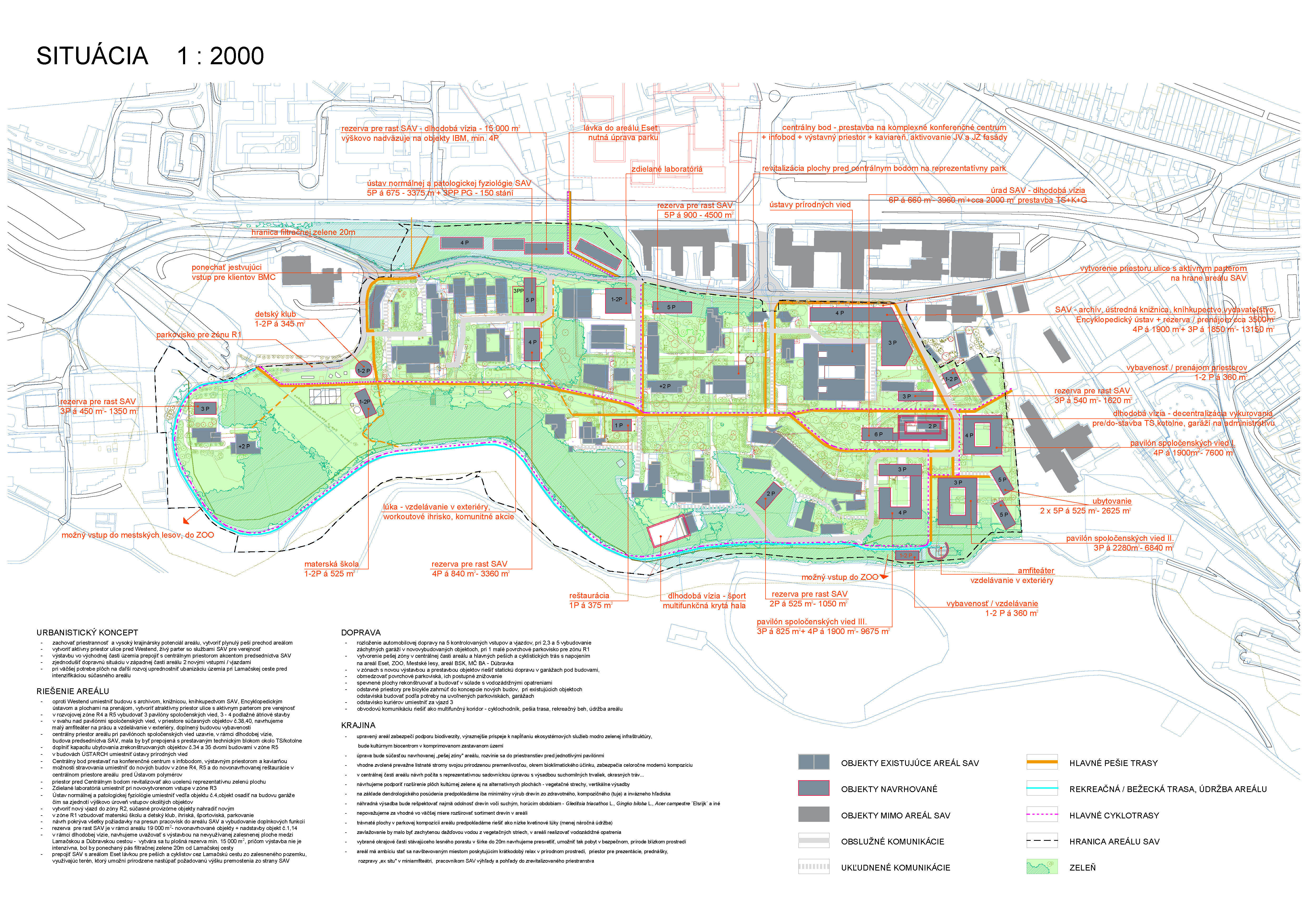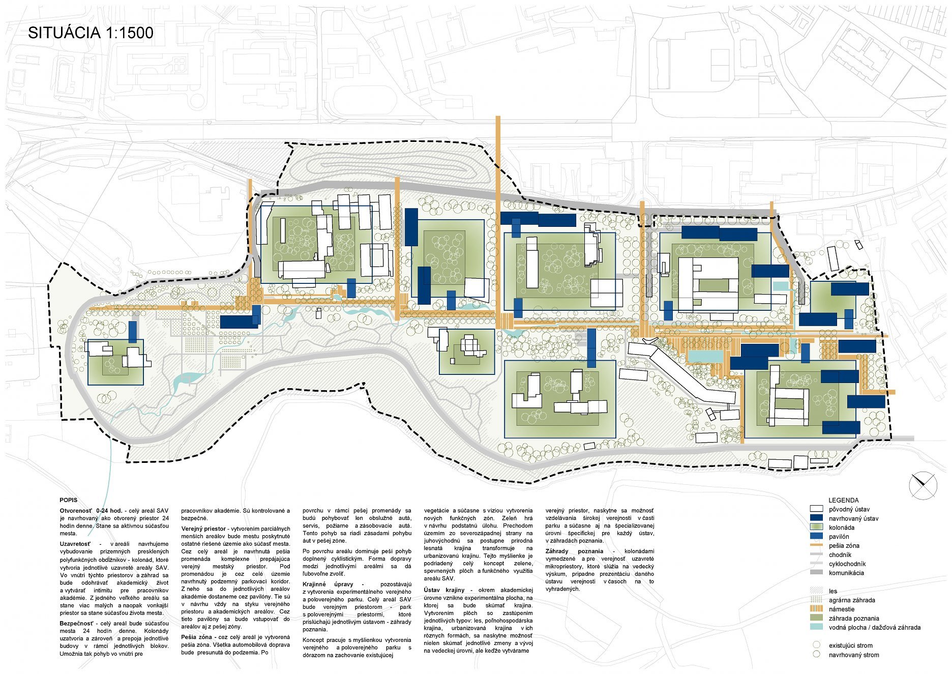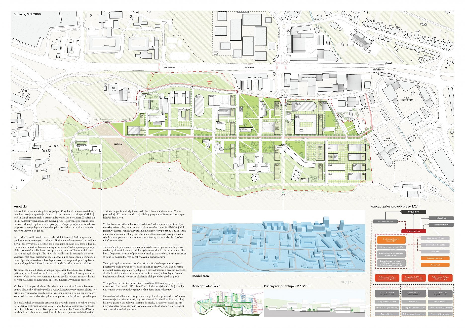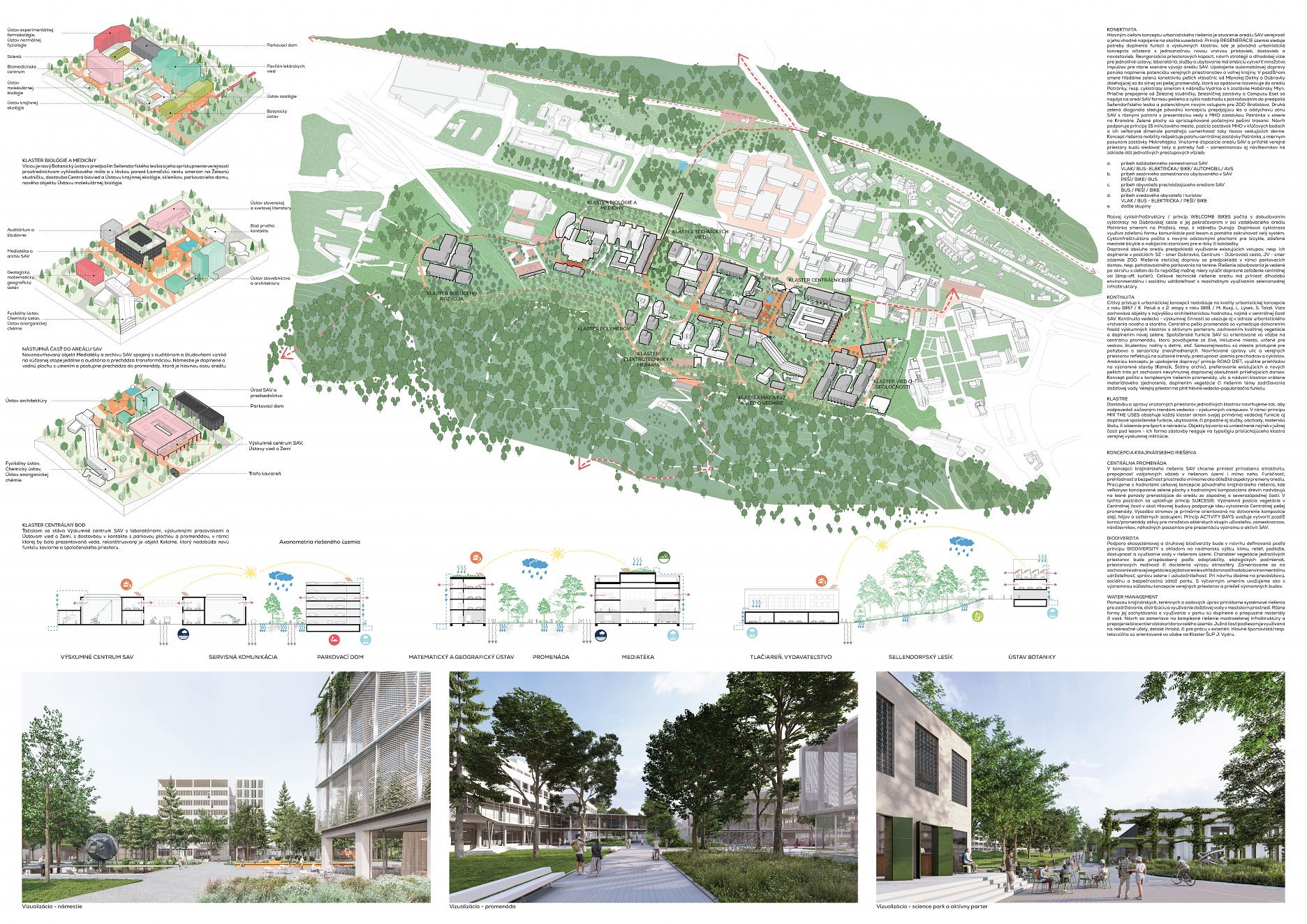 Návrh správne identifikuje význam polohy areálu v údolí medzi dvoma vyvýšeninami - úpätia Malých Karpát a masívu Sitiny. Porota vysoko oceňuje kontextuálnosť návrhu, ktorý vychádza z dôkladnej analýzy charakteristík a hodnôt pôvodného riešenia areálu, tj. solitérnych objektov voľne rozmiestnených v parku. Toto riešenie však úspešne transformuje do súčasnejšej formy, racionalizuje ho a zahusťuje pri primeranom zachovaní pôvodných kvalít. Prevádzka SAV je vhodne organizovaná do jednotlivých tematických klastrov, situovaných okolo centrálneho parku. Pri vstupe do areálu je umiestnený Centrálny bod s hlavnými spoločenskými funkciami - konferenčným centrom, jedálňou a vedením akadémie. Bývanie je čiastočne rozptýlené a pričlenené k jednotlivým klastrom, pričom sa uvažuje s jeho zvýšenou koncentráciou pozdĺž južného okraja areálu.