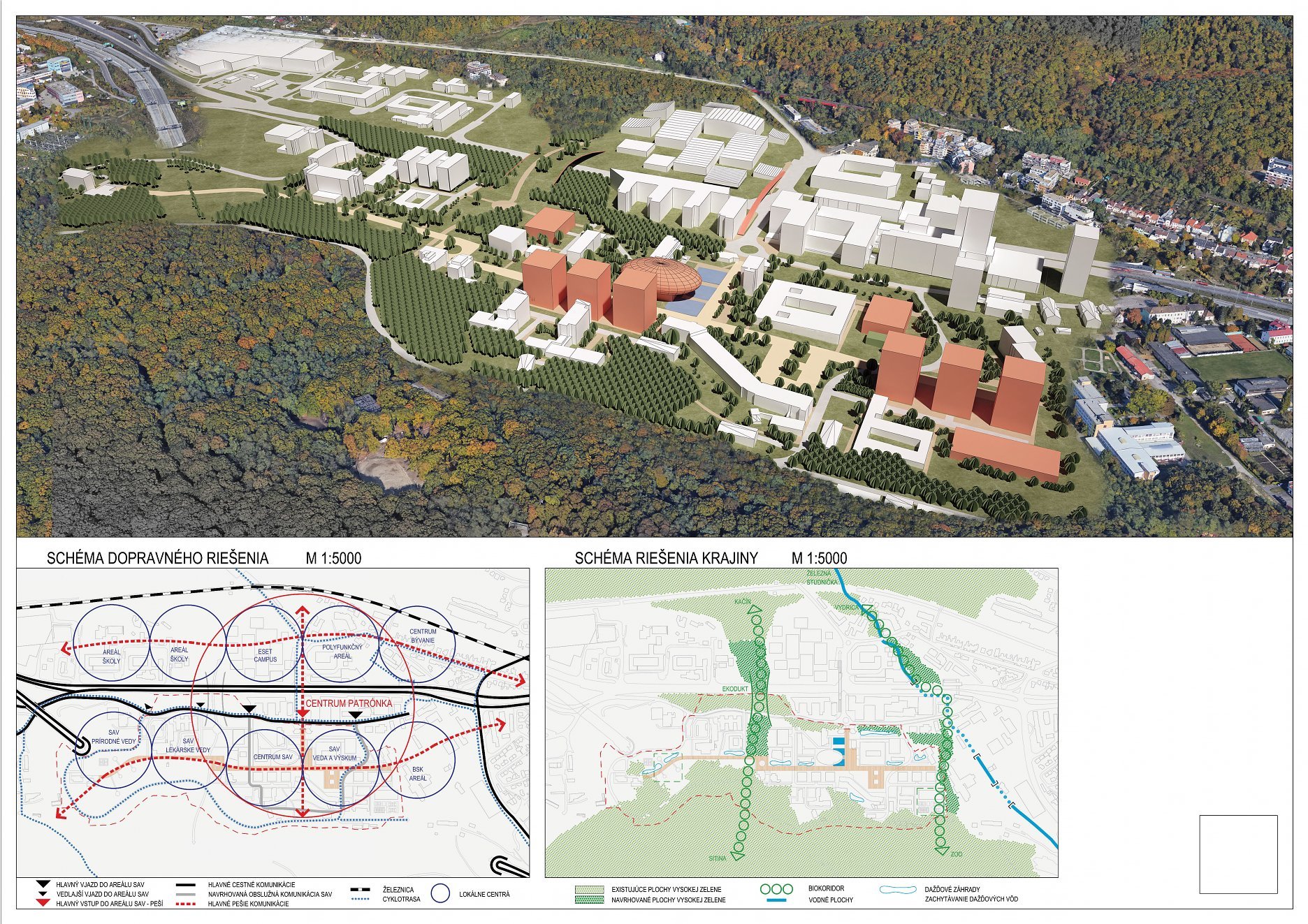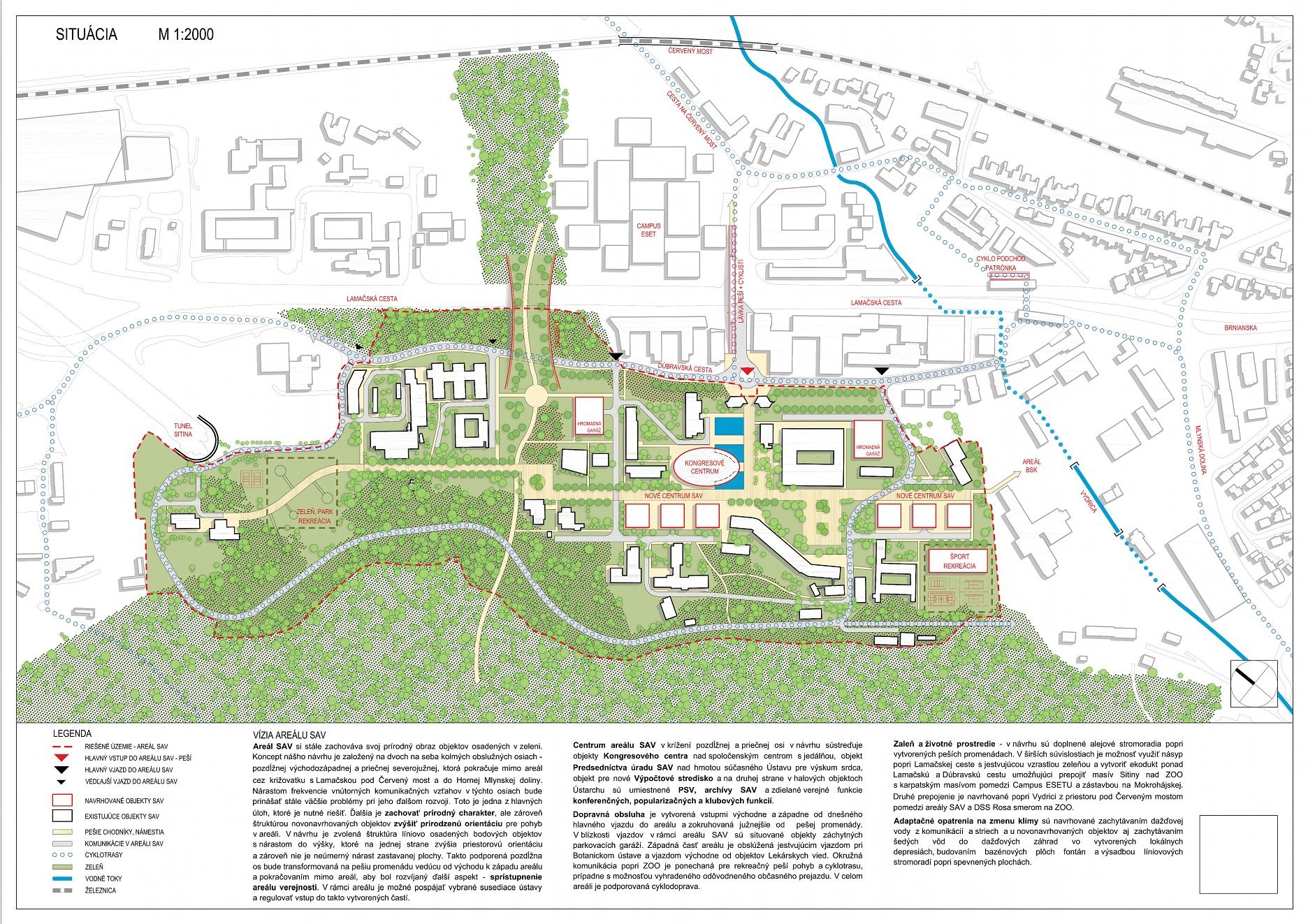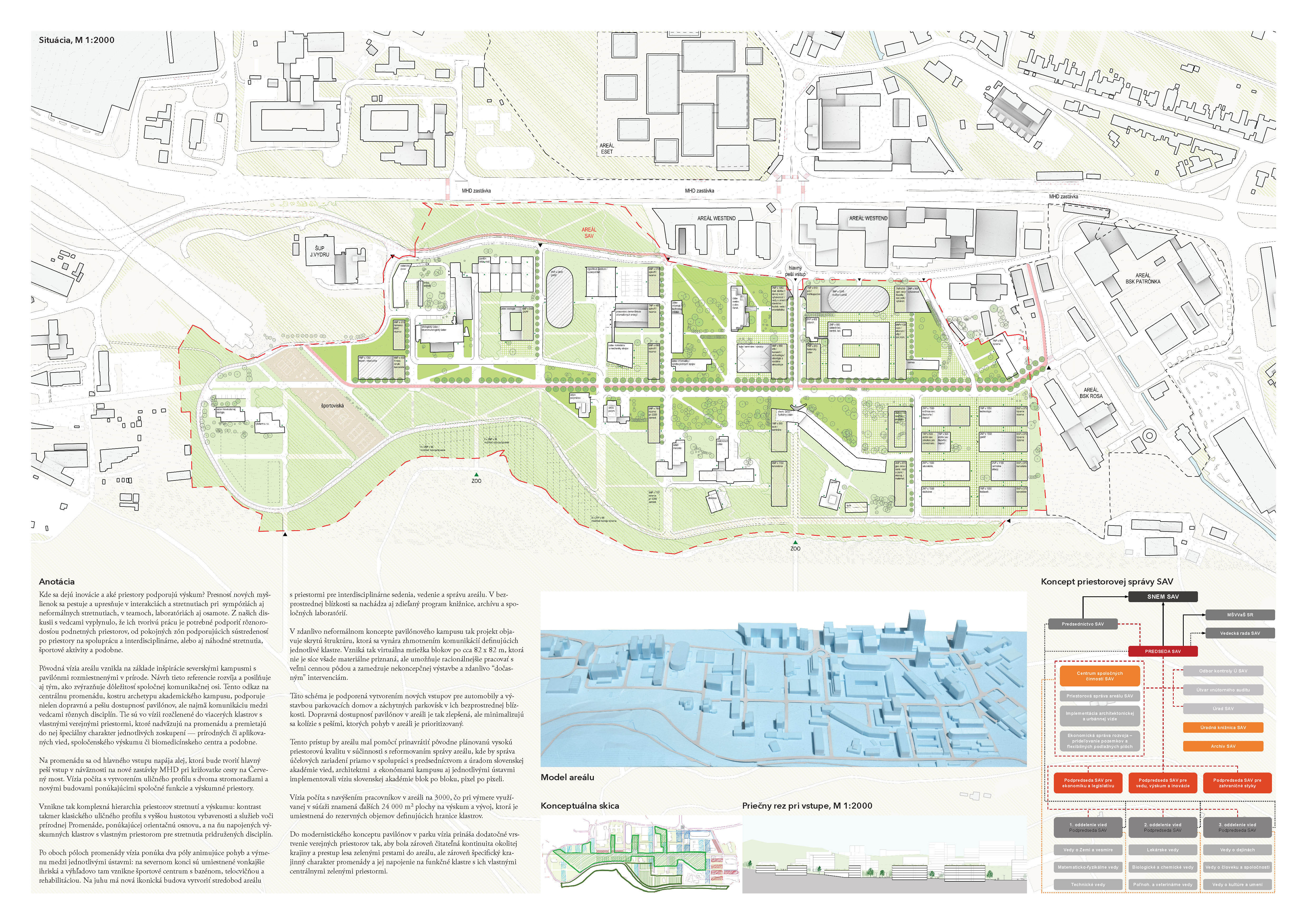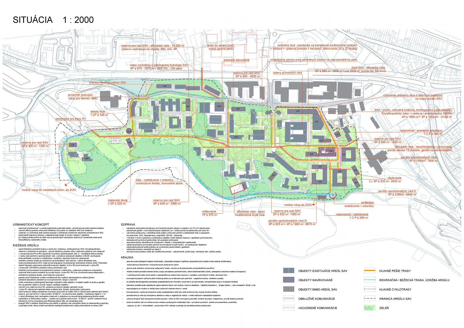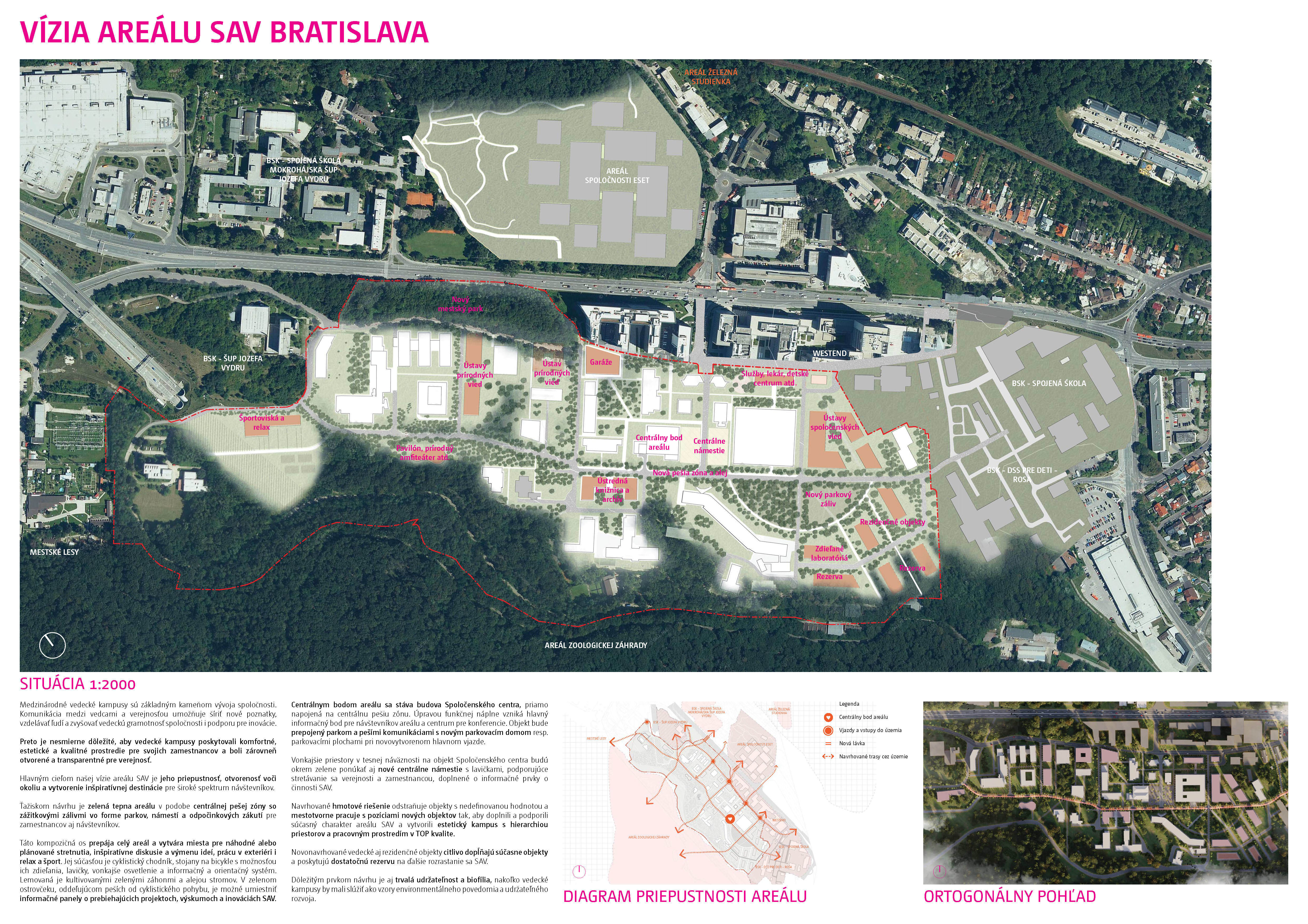 Návrh správne identifikuje význam polohy areálu v údolí medzi dvoma vyvýšeninami - úpätia Malých Karpát a masívu Sitiny. Porota vysoko oceňuje kontextuálnosť návrhu, ktorý vychádza z dôkladnej analýzy charakteristík a hodnôt pôvodného riešenia areálu, tj. solitérnych objektov voľne rozmiestnených v parku. Toto riešenie však úspešne transformuje do súčasnejšej formy, racionalizuje ho a zahusťuje pri primeranom zachovaní pôvodných kvalít. Prevádzka SAV je vhodne organizovaná do jednotlivých tematických klastrov, situovaných okolo centrálneho parku. Pri vstupe do areálu je umiestnený Centrálny bod s hlavnými spoločenskými funkciami - konferenčným centrom, jedálňou a vedením akadémie. Bývanie je čiastočne rozptýlené a pričlenené k jednotlivým klastrom, pričom sa uvažuje s jeho zvýšenou koncentráciou pozdĺž južného okraja areálu.