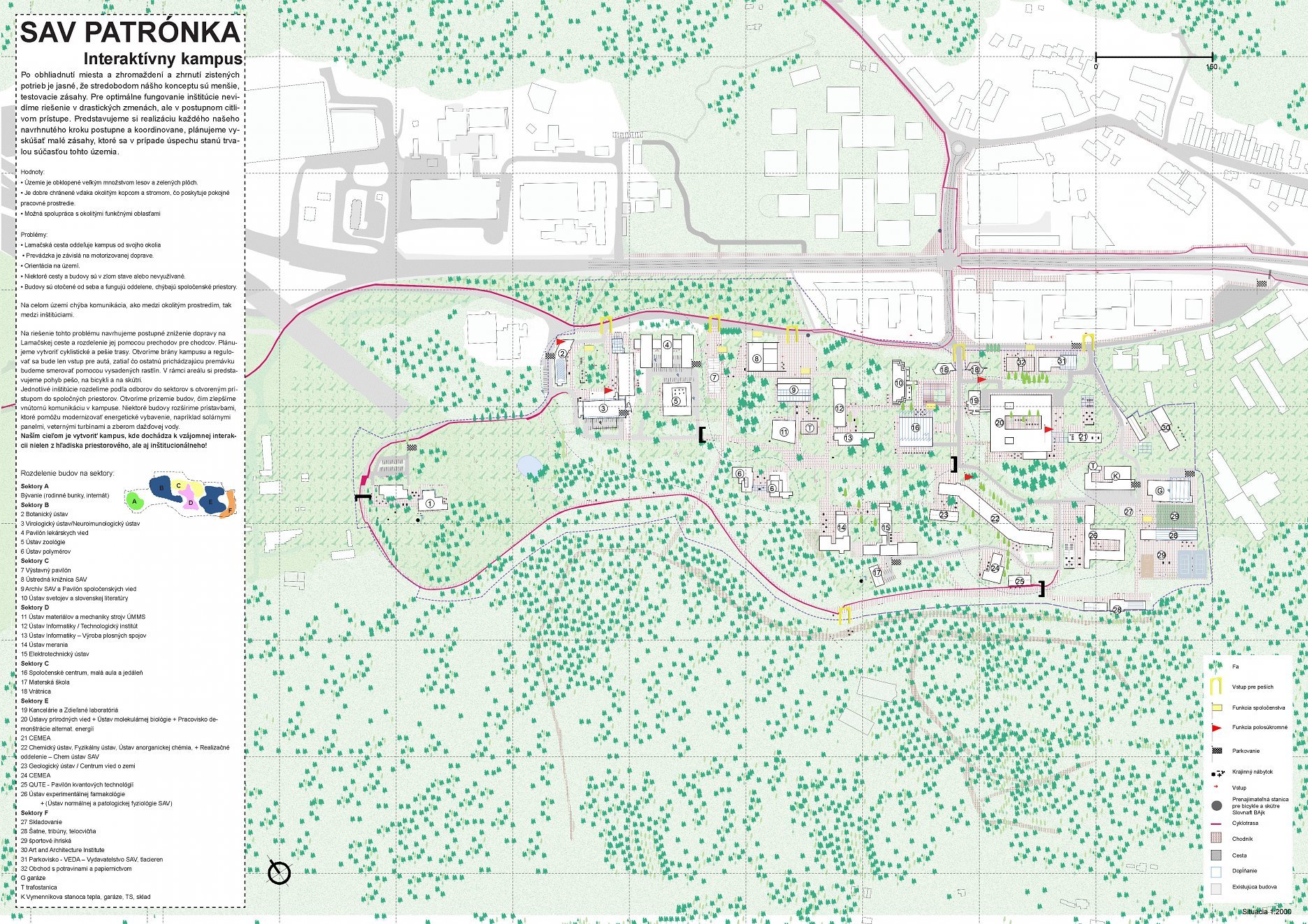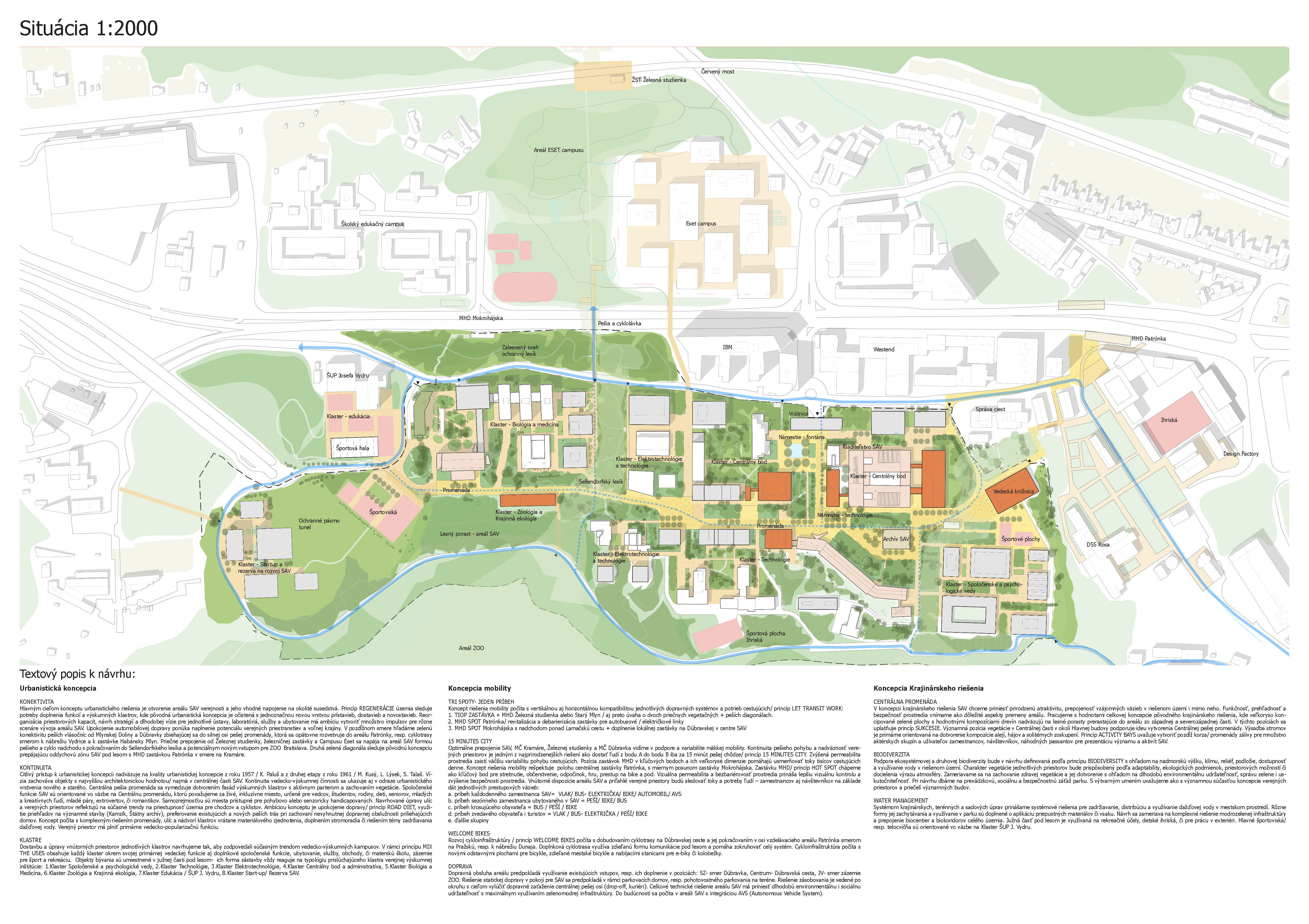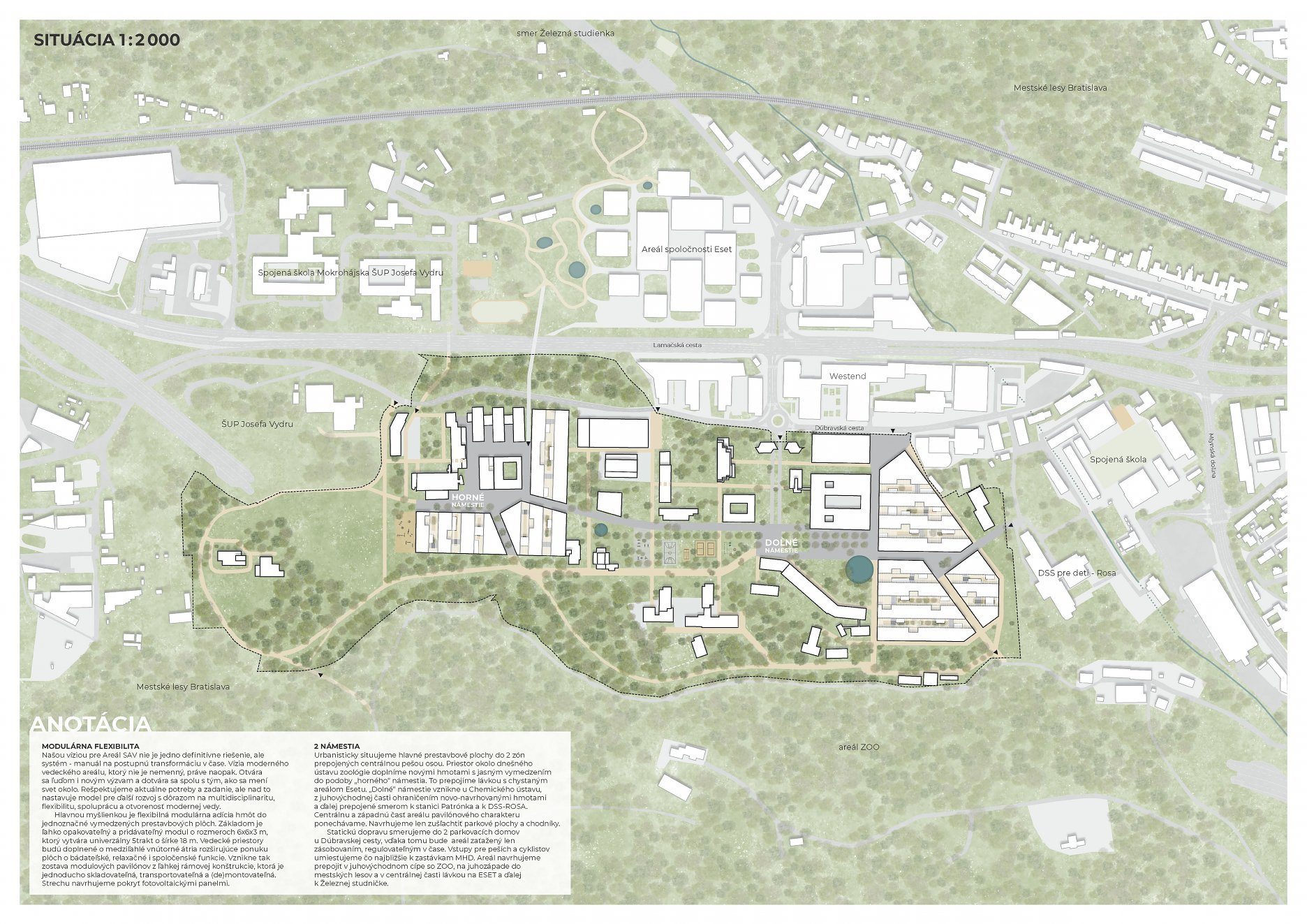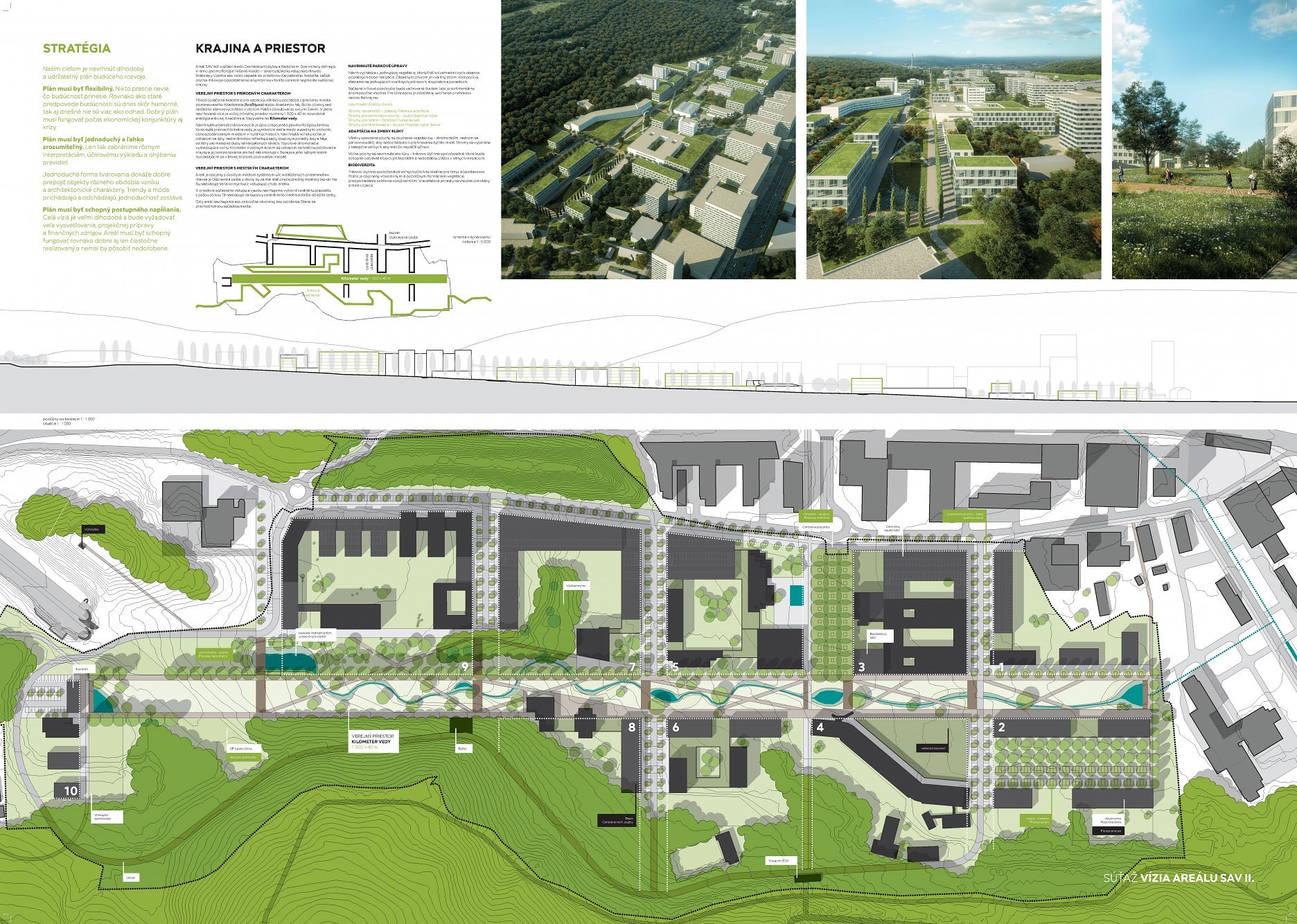 Návrh správne identifikuje význam polohy areálu v údolí medzi dvoma vyvýšeninami - úpätia Malých Karpát a masívu Sitiny. Porota vysoko oceňuje kontextuálnosť návrhu, ktorý vychádza z dôkladnej analýzy charakteristík a hodnôt pôvodného riešenia areálu, tj. solitérnych objektov voľne rozmiestnených v parku. Toto riešenie však úspešne transformuje do súčasnejšej formy, racionalizuje ho a zahusťuje pri primeranom zachovaní pôvodných kvalít. Prevádzka SAV je vhodne organizovaná do jednotlivých tematických klastrov, situovaných okolo centrálneho parku. Pri vstupe do areálu je umiestnený Centrálny bod s hlavnými spoločenskými funkciami - konferenčným centrom, jedálňou a vedením akadémie. Bývanie je čiastočne rozptýlené a pričlenené k jednotlivým klastrom, pričom sa uvažuje s jeho zvýšenou koncentráciou pozdĺž južného okraja areálu.