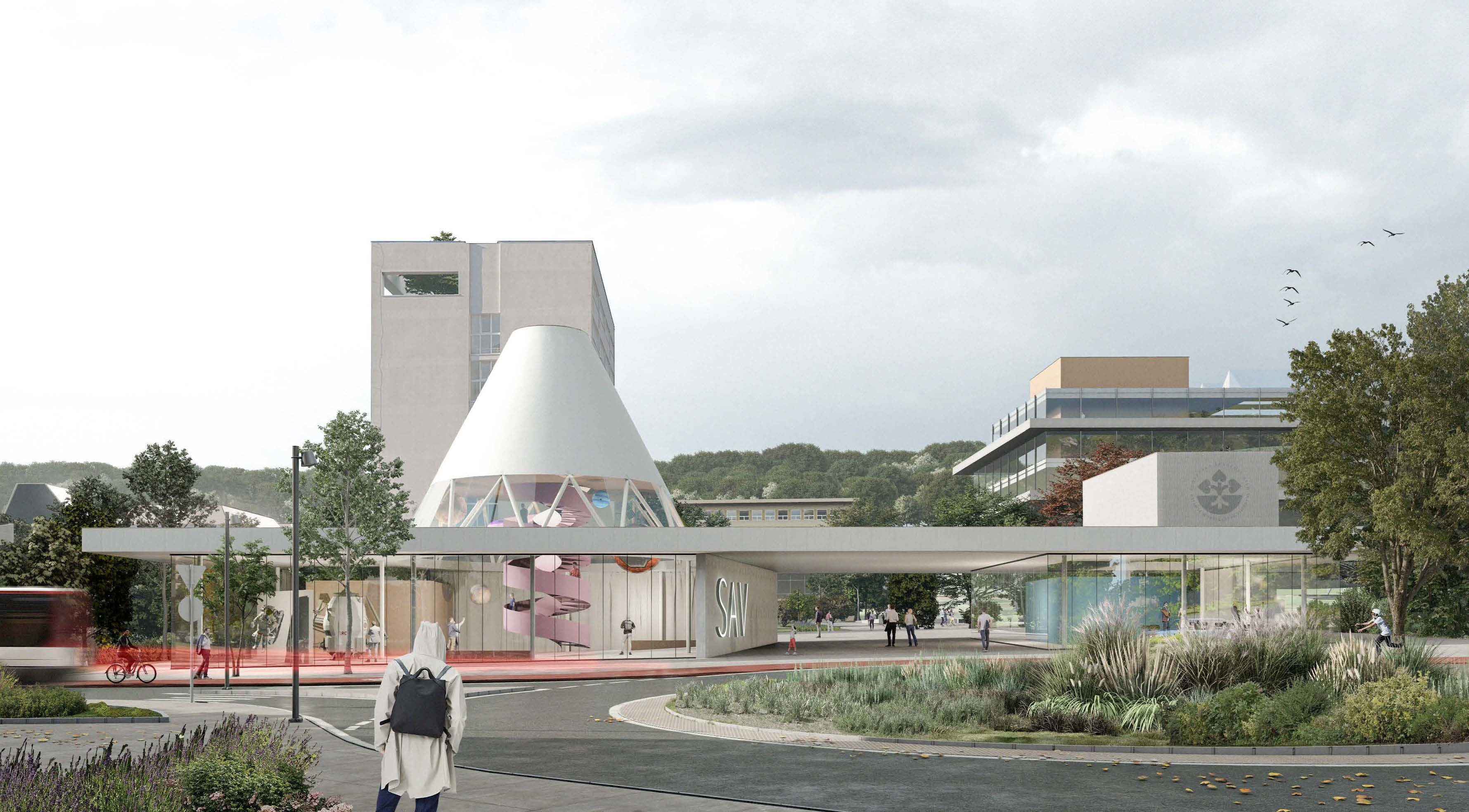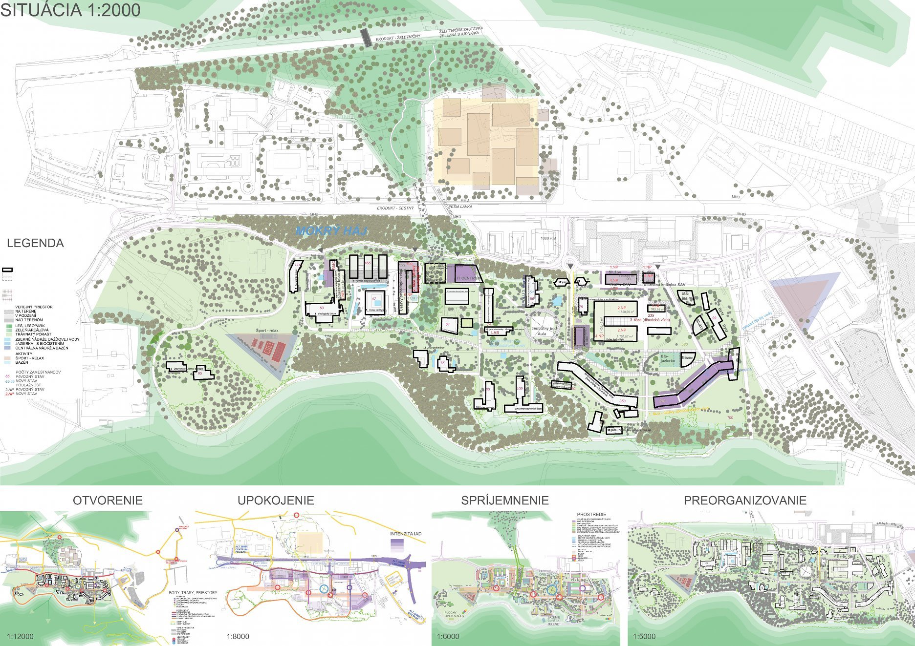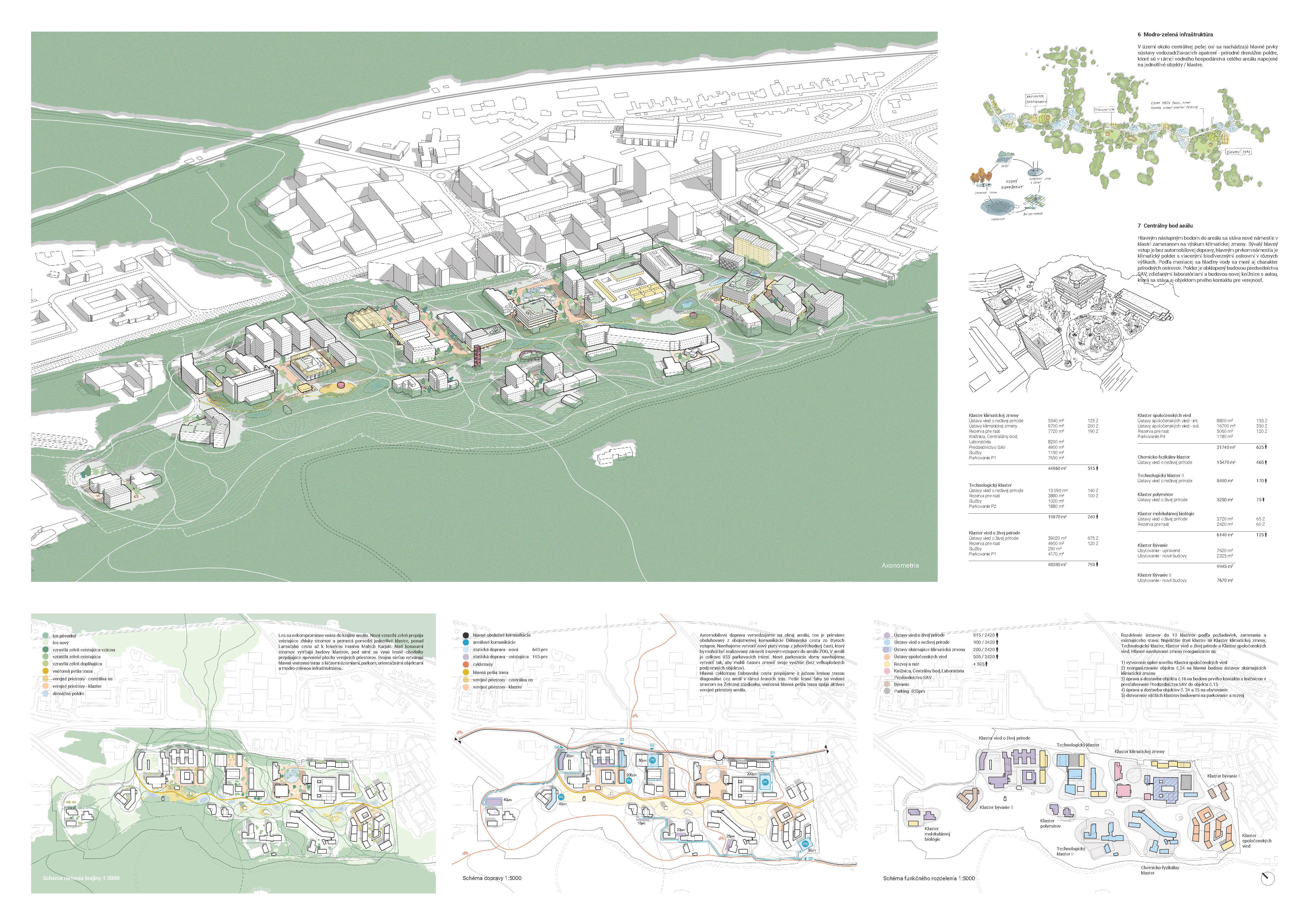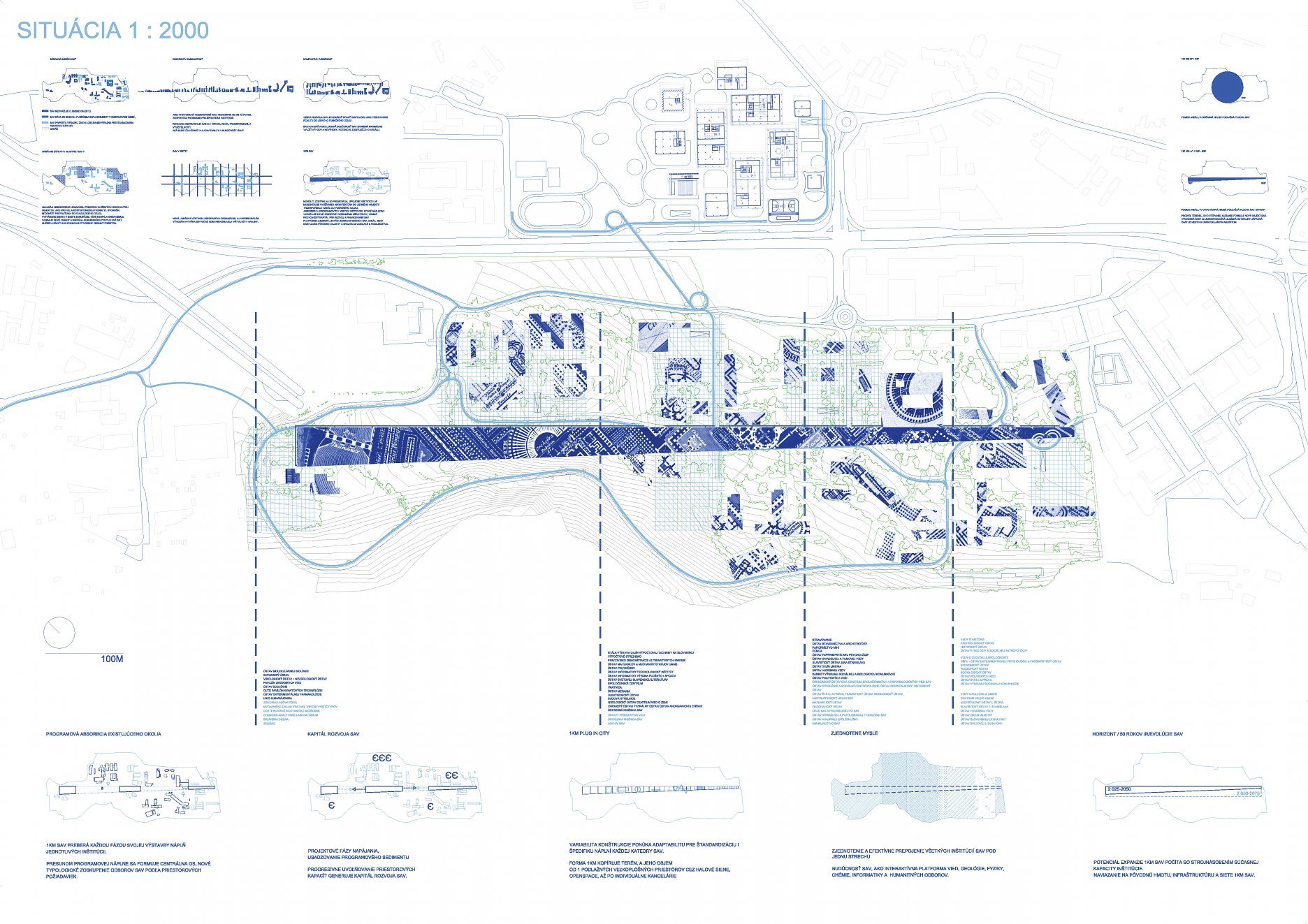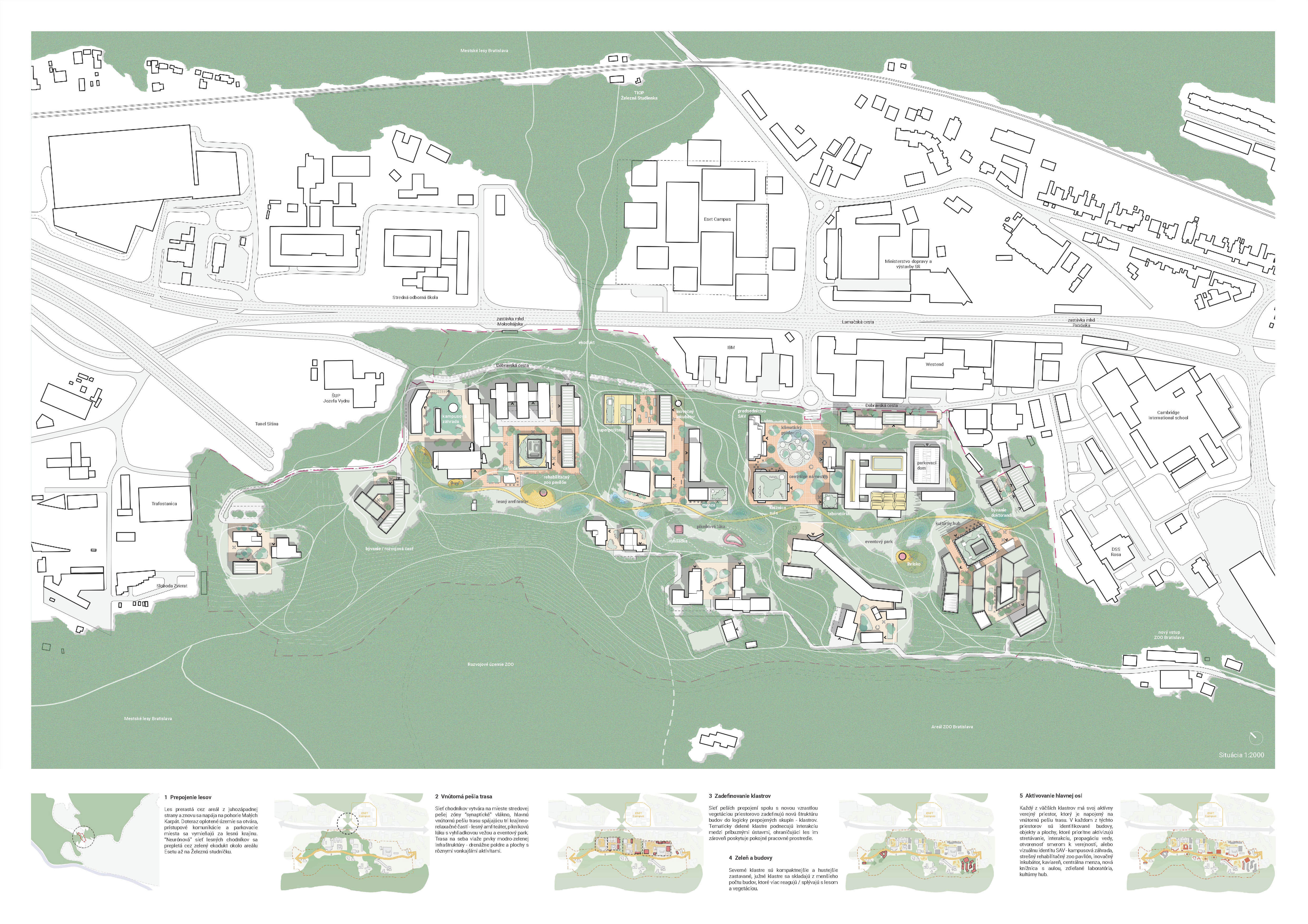 Návrh správne identifikuje význam polohy areálu v údolí medzi dvoma vyvýšeninami - úpätia Malých Karpát a masívu Sitiny. Porota vysoko oceňuje kontextuálnosť návrhu, ktorý vychádza z dôkladnej analýzy charakteristík a hodnôt pôvodného riešenia areálu, tj. solitérnych objektov voľne rozmiestnených v parku. Toto riešenie však úspešne transformuje do súčasnejšej formy, racionalizuje ho a zahusťuje pri primeranom zachovaní pôvodných kvalít. Prevádzka SAV je vhodne organizovaná do jednotlivých tematických klastrov, situovaných okolo centrálneho parku. Pri vstupe do areálu je umiestnený Centrálny bod s hlavnými spoločenskými funkciami - konferenčným centrom, jedálňou a vedením akadémie. Bývanie je čiastočne rozptýlené a pričlenené k jednotlivým klastrom, pričom sa uvažuje s jeho zvýšenou koncentráciou pozdĺž južného okraja areálu.