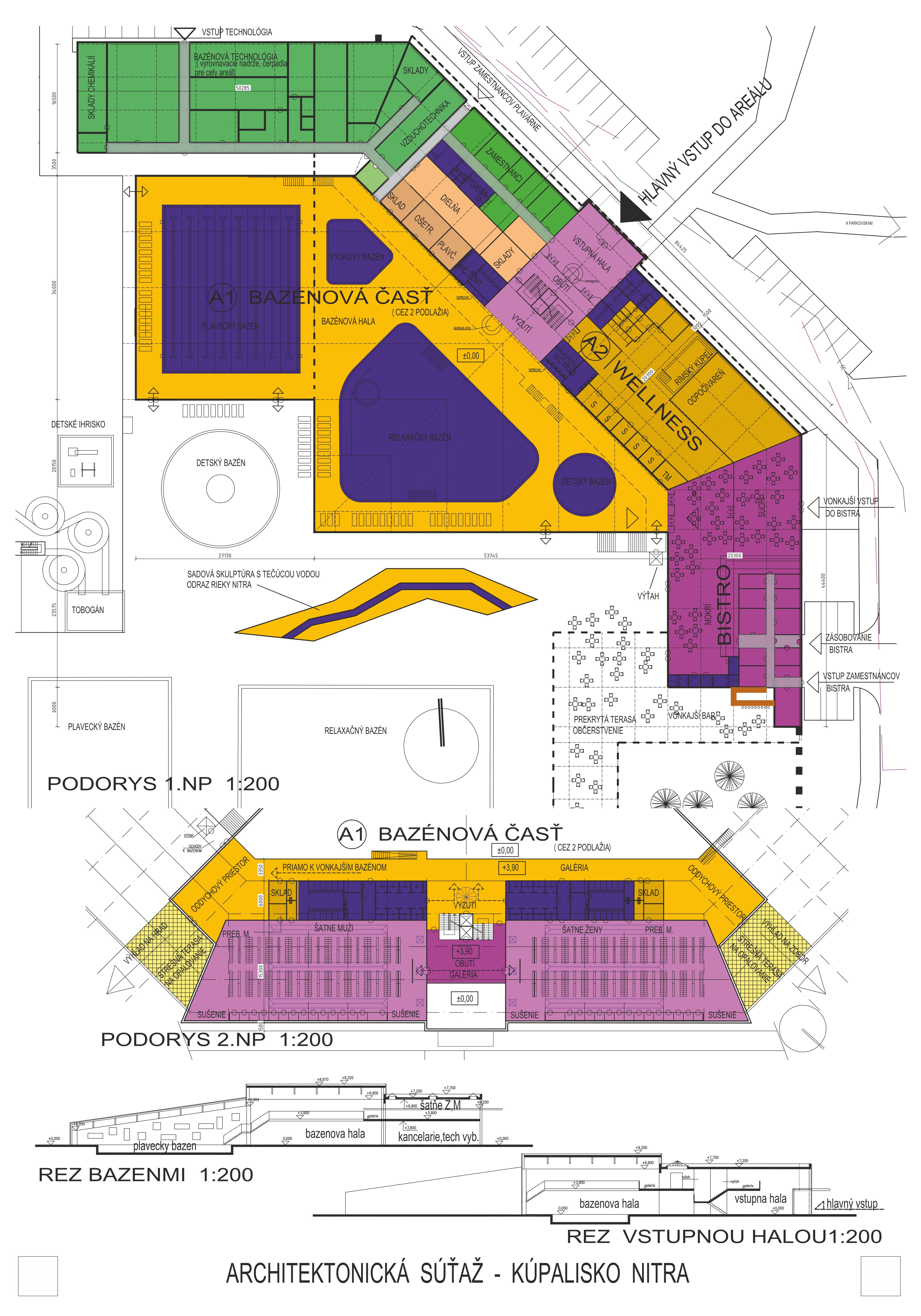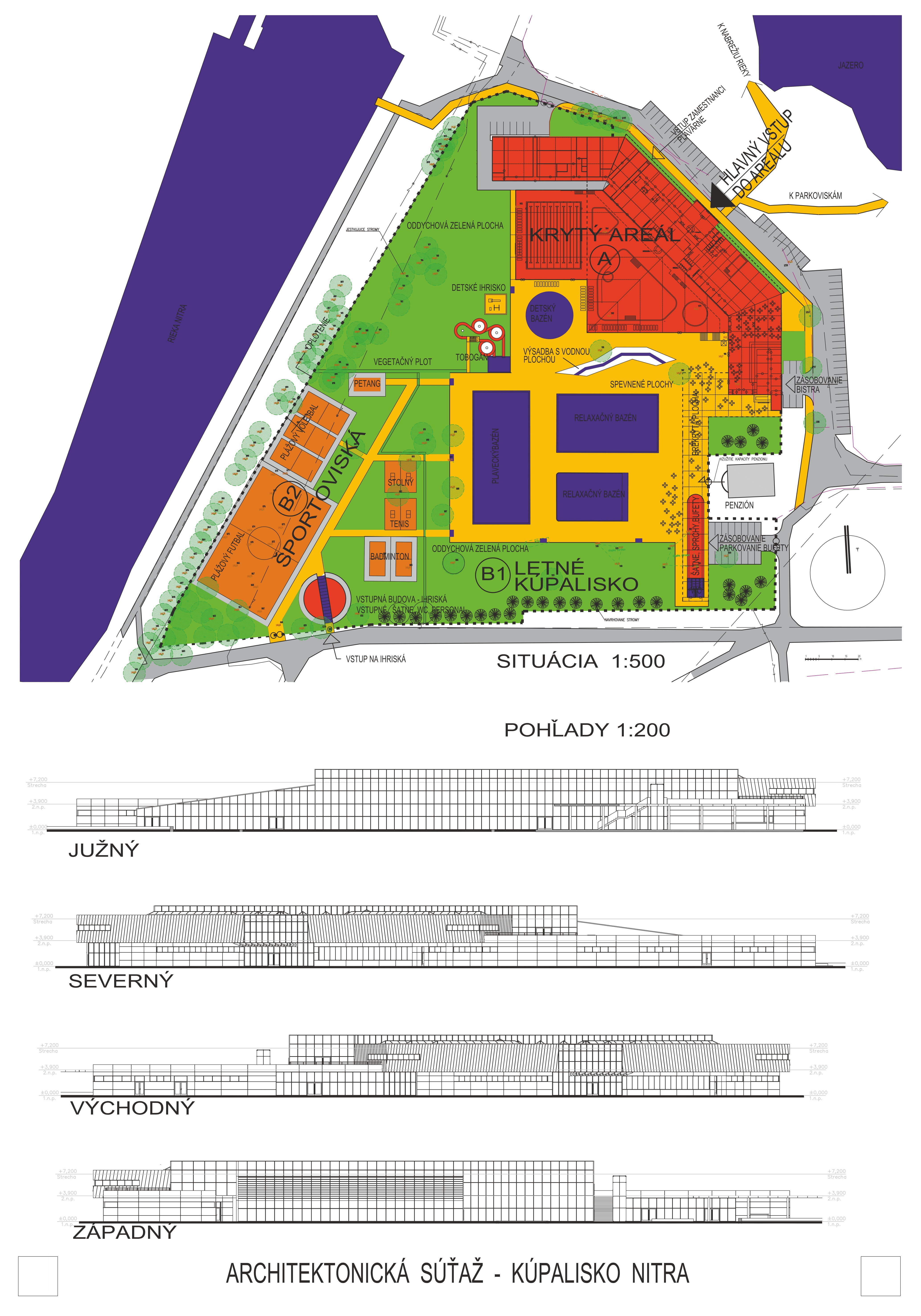 Autorský tím osadil na pozemok 2 hmoty – jednu celoročnú, druhú letnú – s možnosťou odelenia vstupov. Hmota celoročnej budovy je umiestnená v mieste súčasného objektu šatní a obsluhy areálu. Urbanisticky tak vznikol veľmi sympaticky zovretý priestor nasmerovaný k rieke v smere východ /západ. Slabá optická priepustnosť letného objektu vytvára vnemový tieň tým sa veľká časť územia / športové plochy dostáva do akoby vonkajšej oddelenej hrany areálu. Jednoznačná architektonická akcentácia celoročného objemu je v rozpore s dvoma vstupmi a v pomerne nešťastným osadením reštaurácie, ktorá je v návrhu síce spojená s hrádzou a riekou / k nim je aj orientovaná / , ale zároveň akoby nepatrila k areálu kúpaliska – dostáva sa mimo ohniska diania. tento fakt, podporuje aj jej umiestnenie na úroveň 2.np, nehovoriac o jej slabšej možnosti celoročného využívania, nakoľko je na opačnej strane parkovacích možností. Celkovo projekt pôsobí veľmi kultivovane, jeho štylizácia je vyrovnaná vytvára veľmi osobitý charakter návrhu.