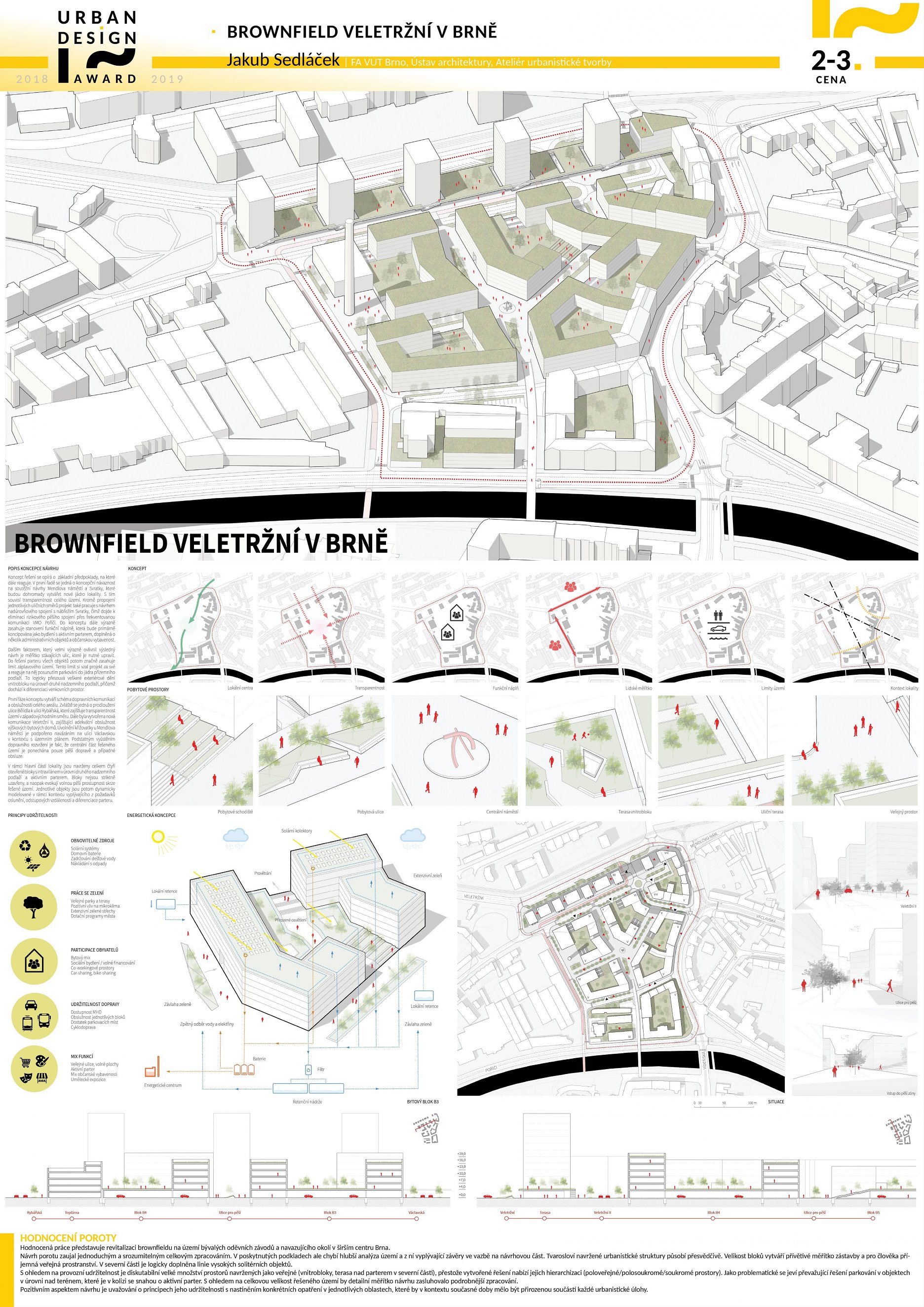 Jakub Sedláček sa vo svojom projekte Brownfield Veletržní v Brně zaoberá revitalizáciou území bývalých odevných závodov a nadväzujúceho okolia v širšom centre Brna. Jeho návrh, spracovaný v Ateliéri urbanistickej tvorby Ústavu architektúry Stavebnej fakulty VUT v Brne zaujal porotu jednoduchým a zrozumiteľným spracovaním a presvedčivosťou navrhnutej urbanistickej štruktúry. Porote sa páčilo jeho uvažovanie o princípoch udržateľnosti a konkrétnych opatreniach, ktoré by v kontexte súčasnej doby malo byť prirodzenou súčasťou každého urbanistického návrhu.
