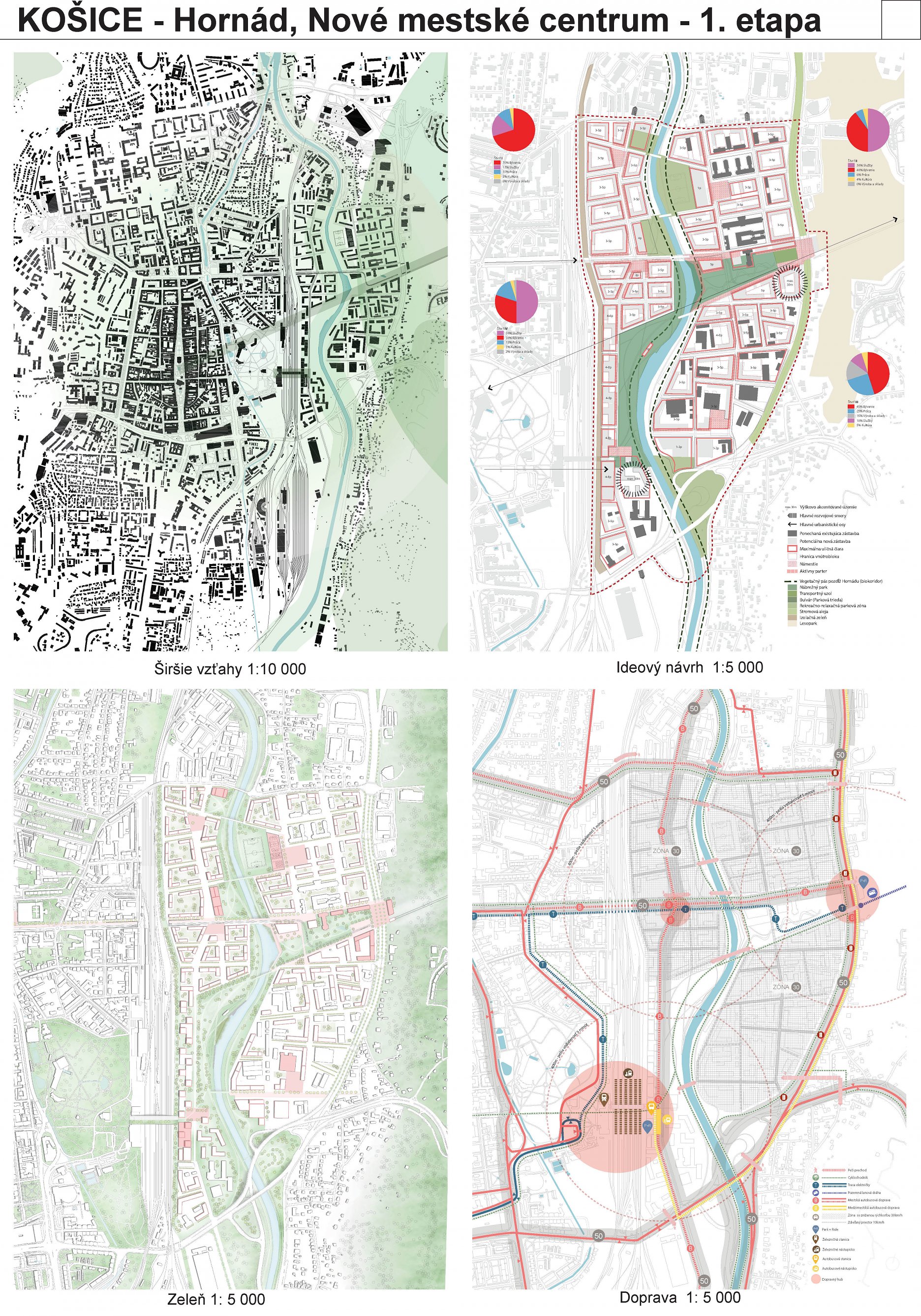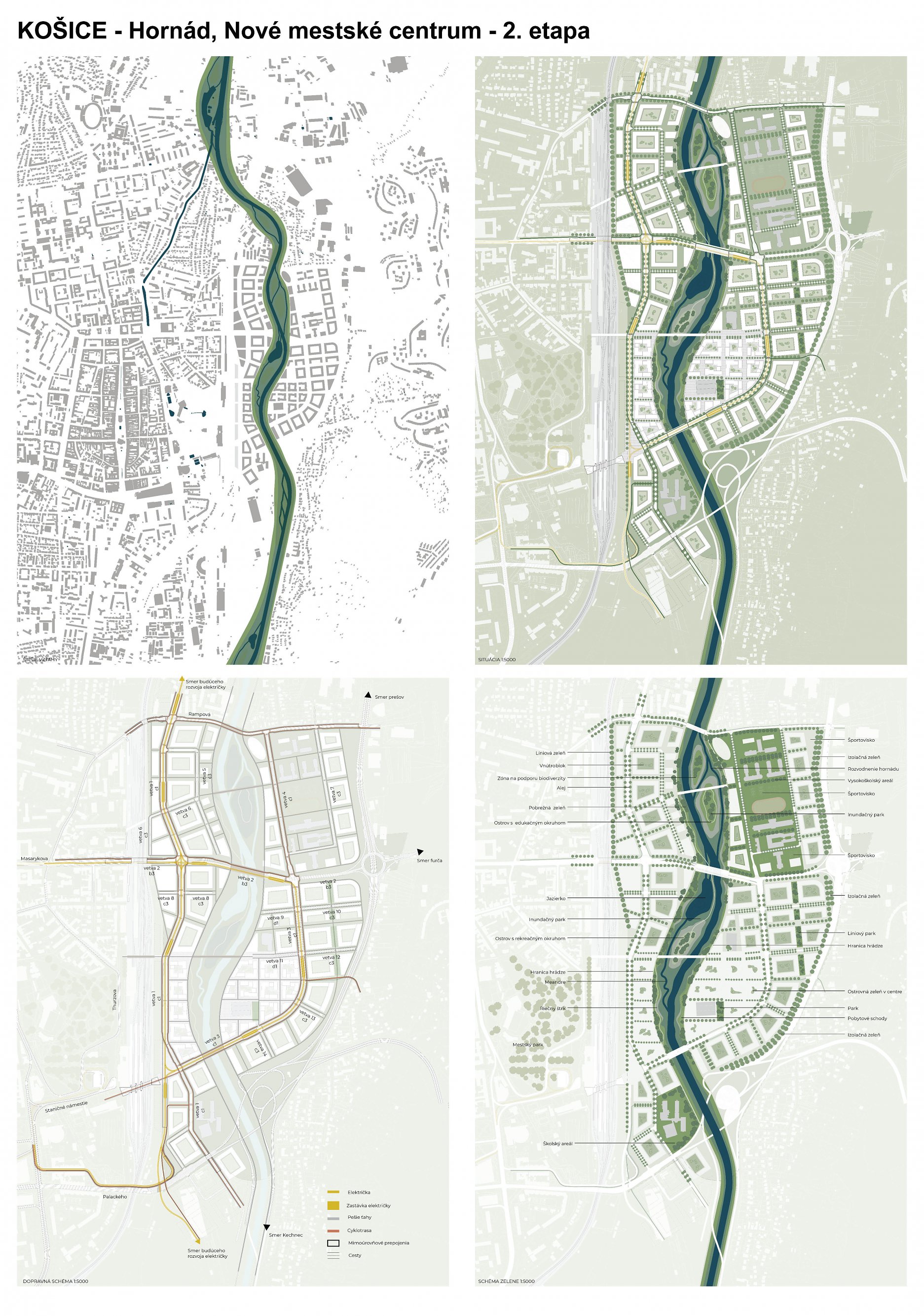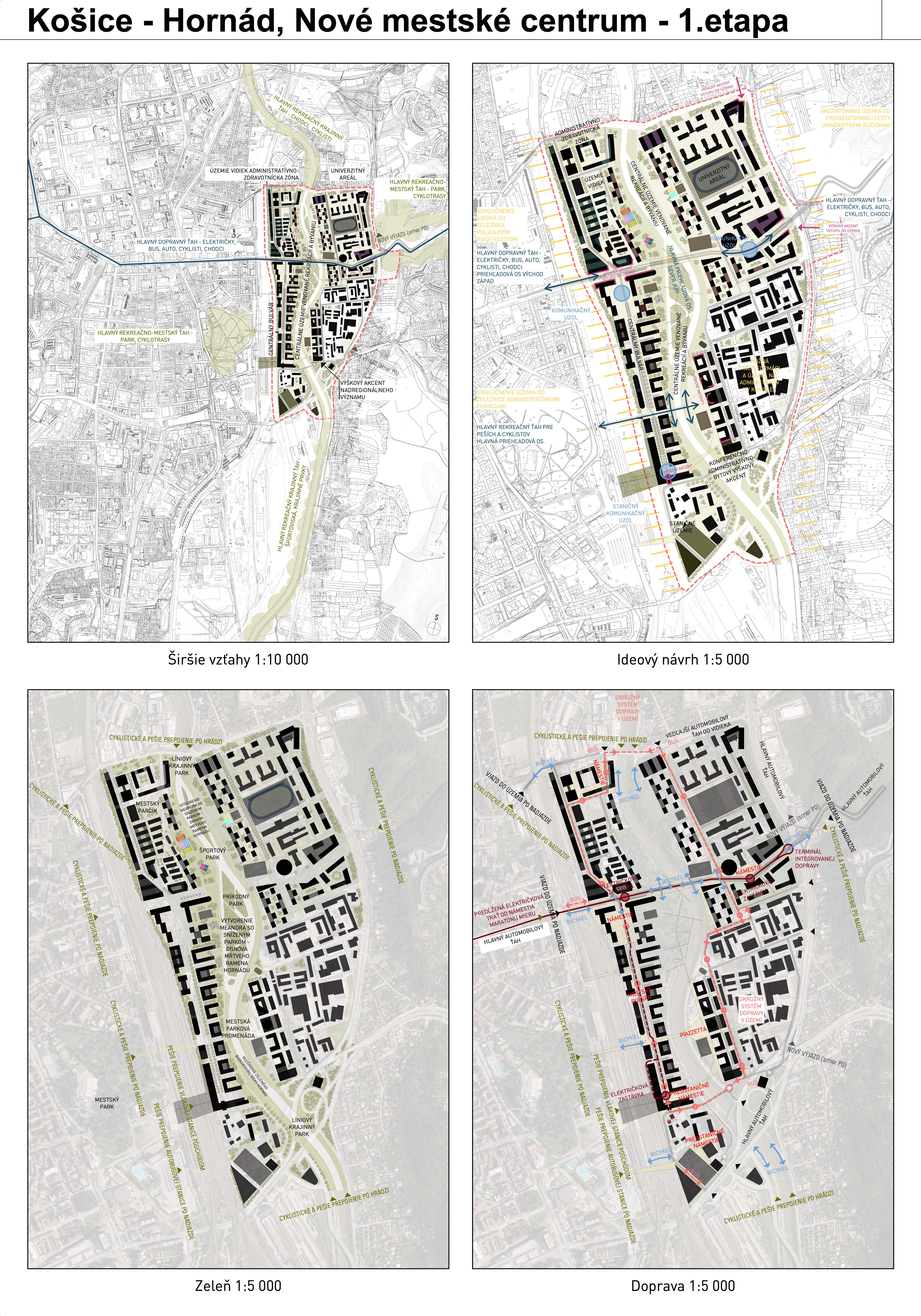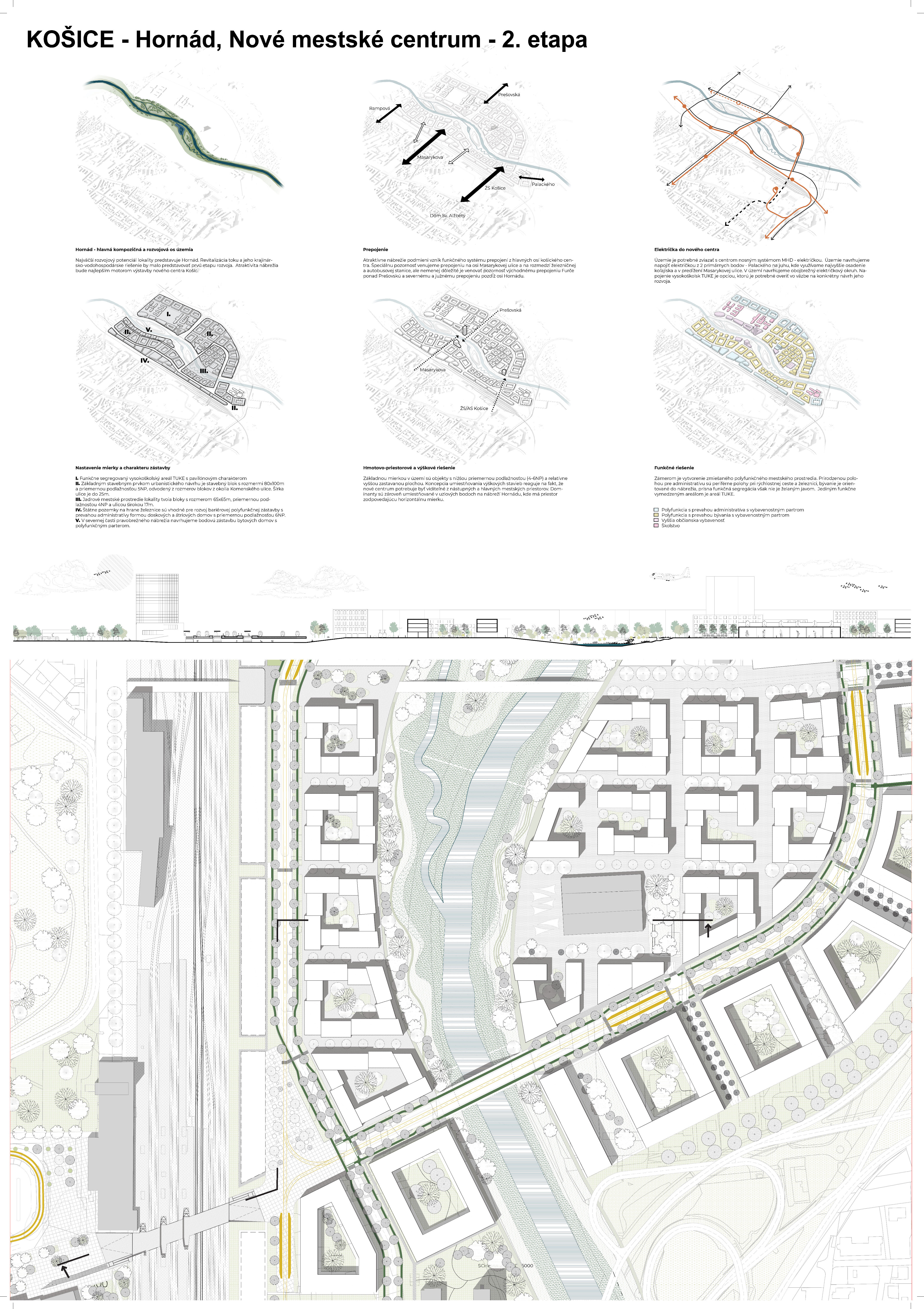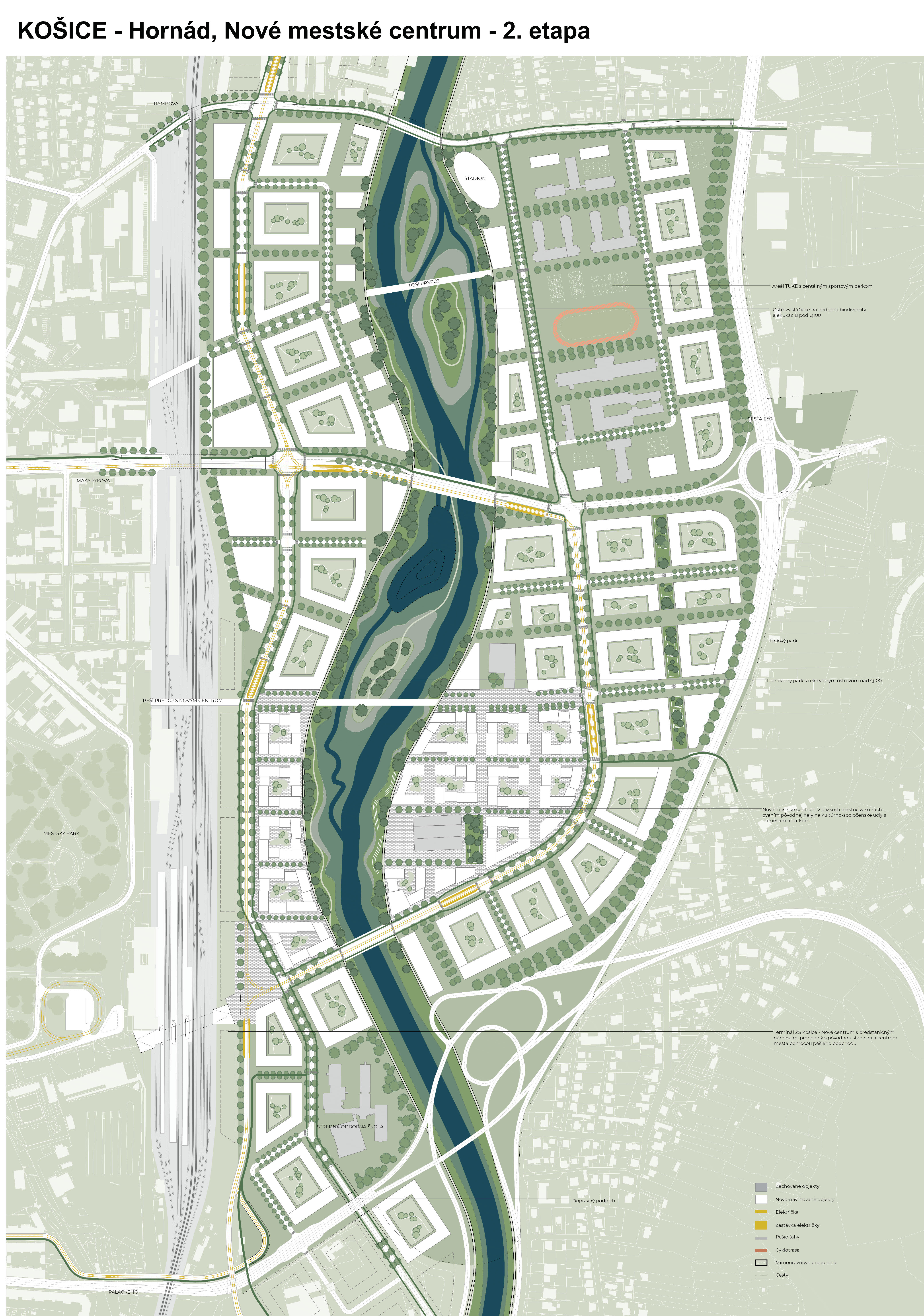 - návrh štruktúru vhodným spôsobom napája na historické štruktúry mesta a zároveň zhodnocuje územie okolia Hornádu v riešenom území