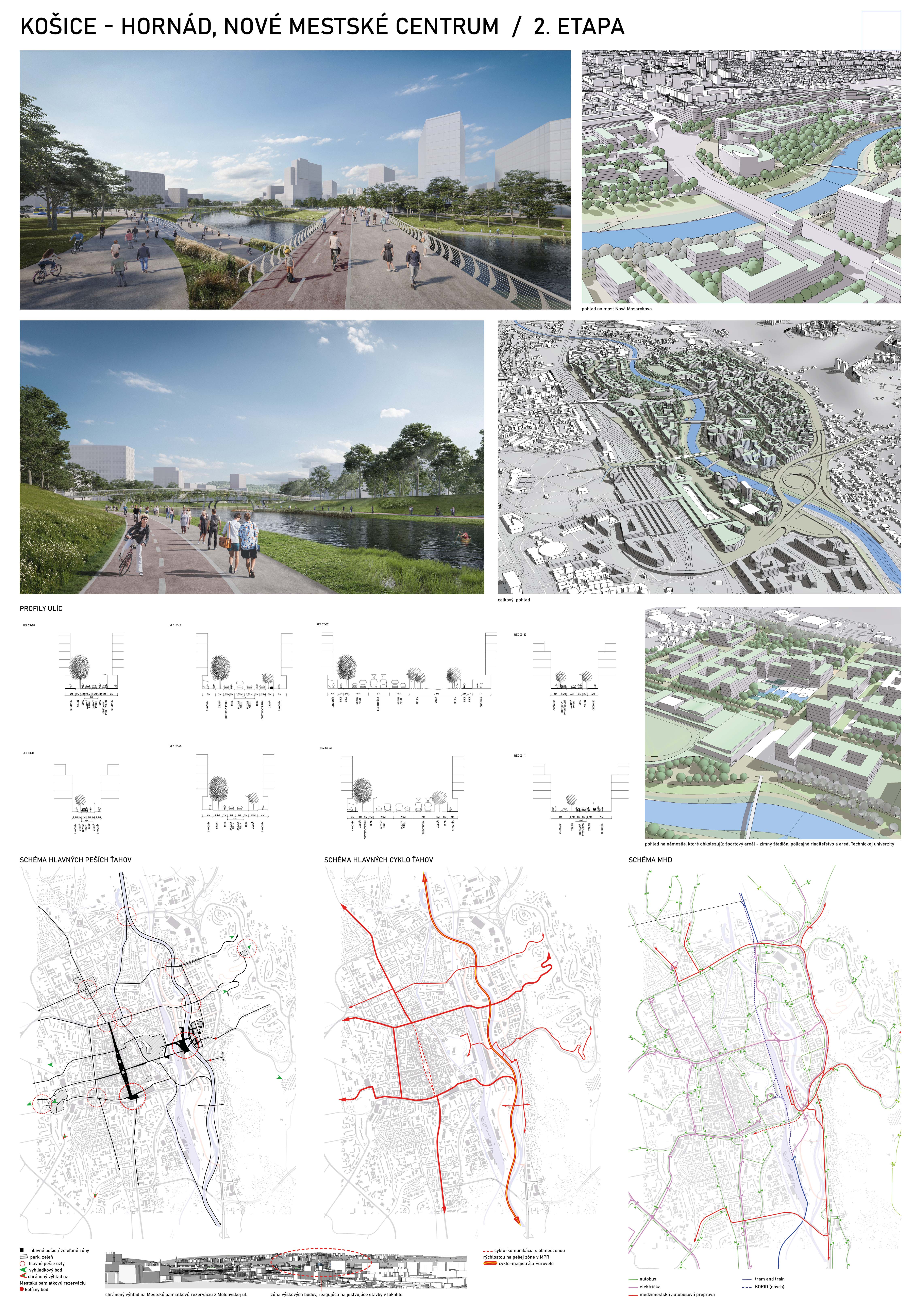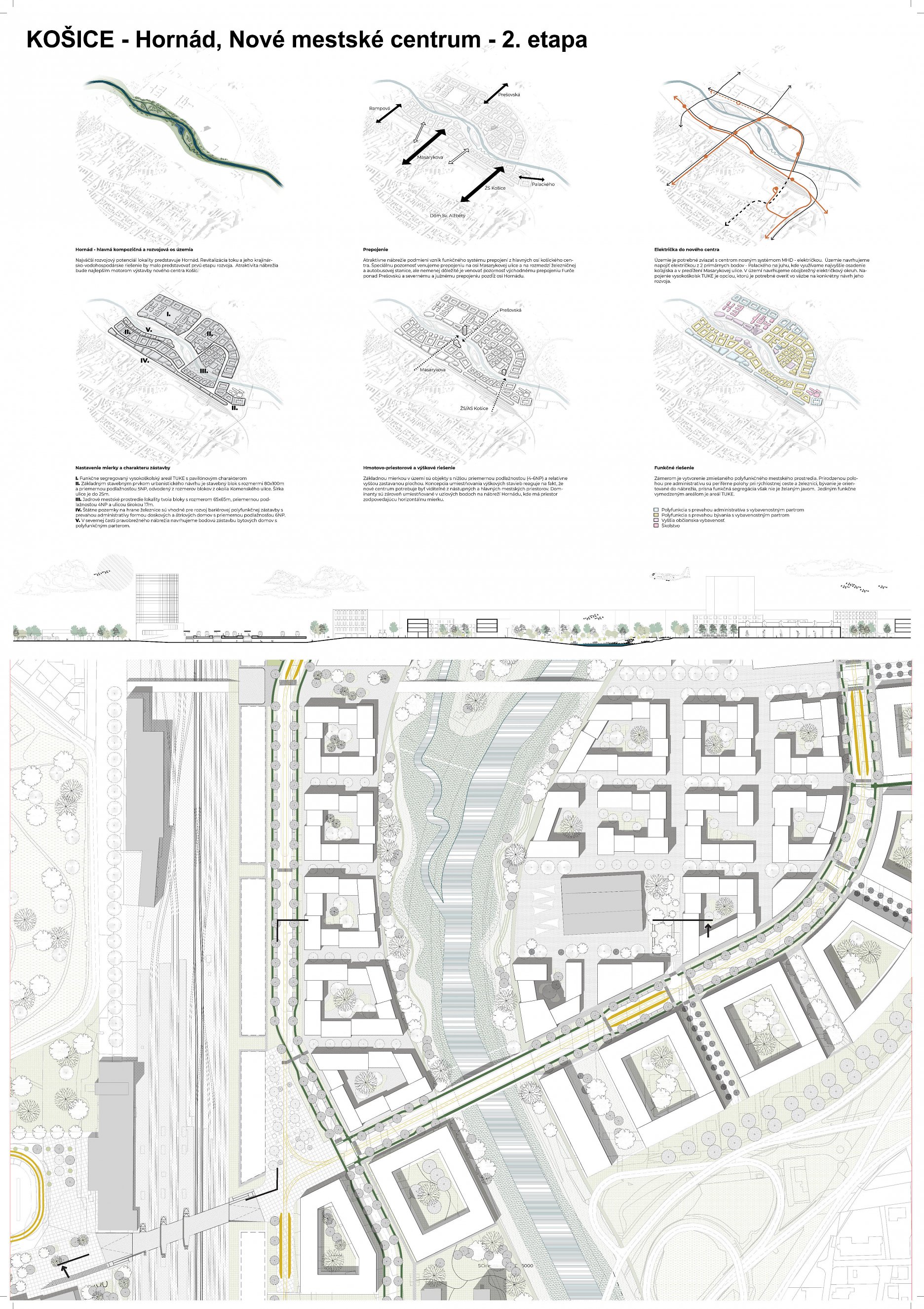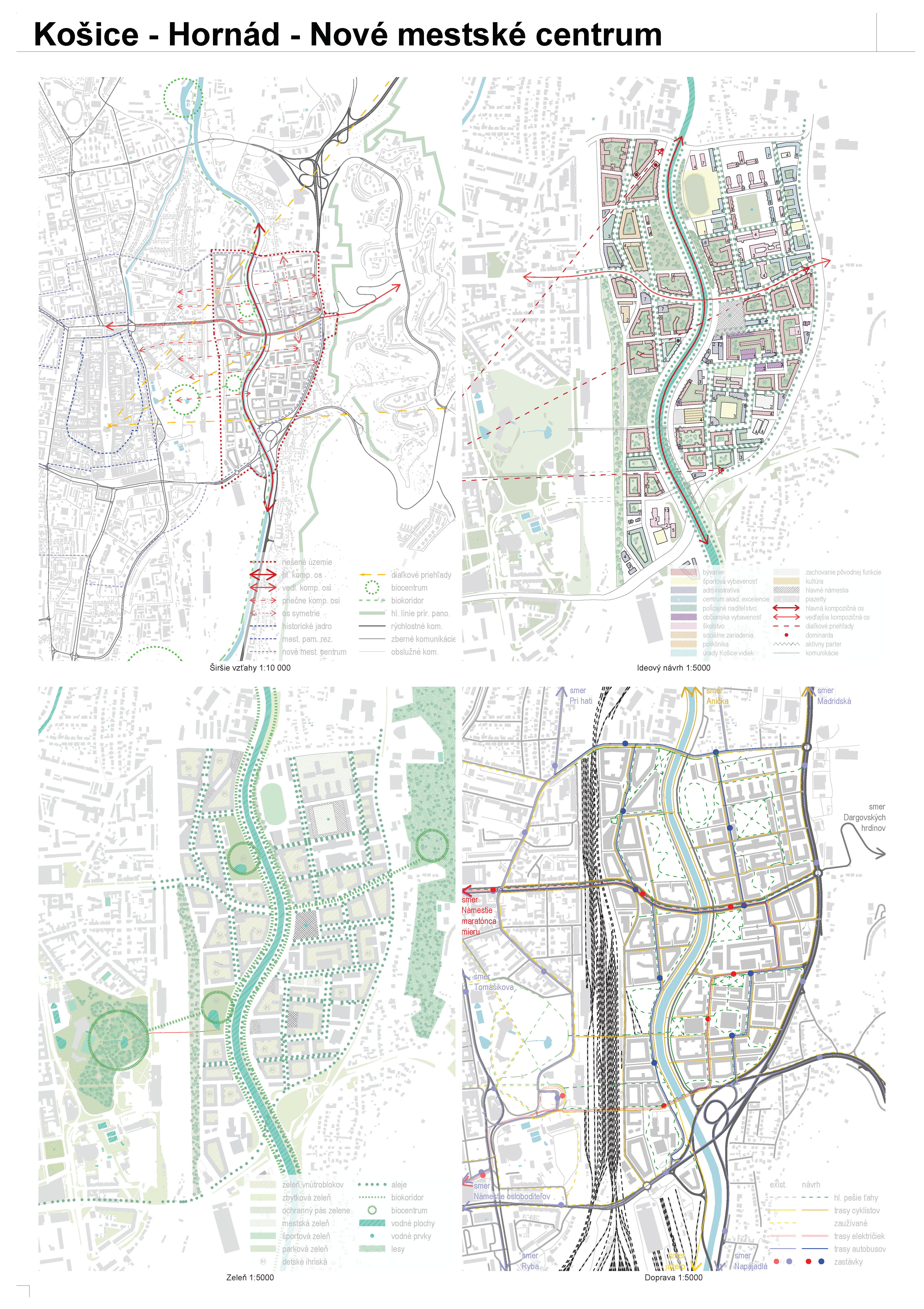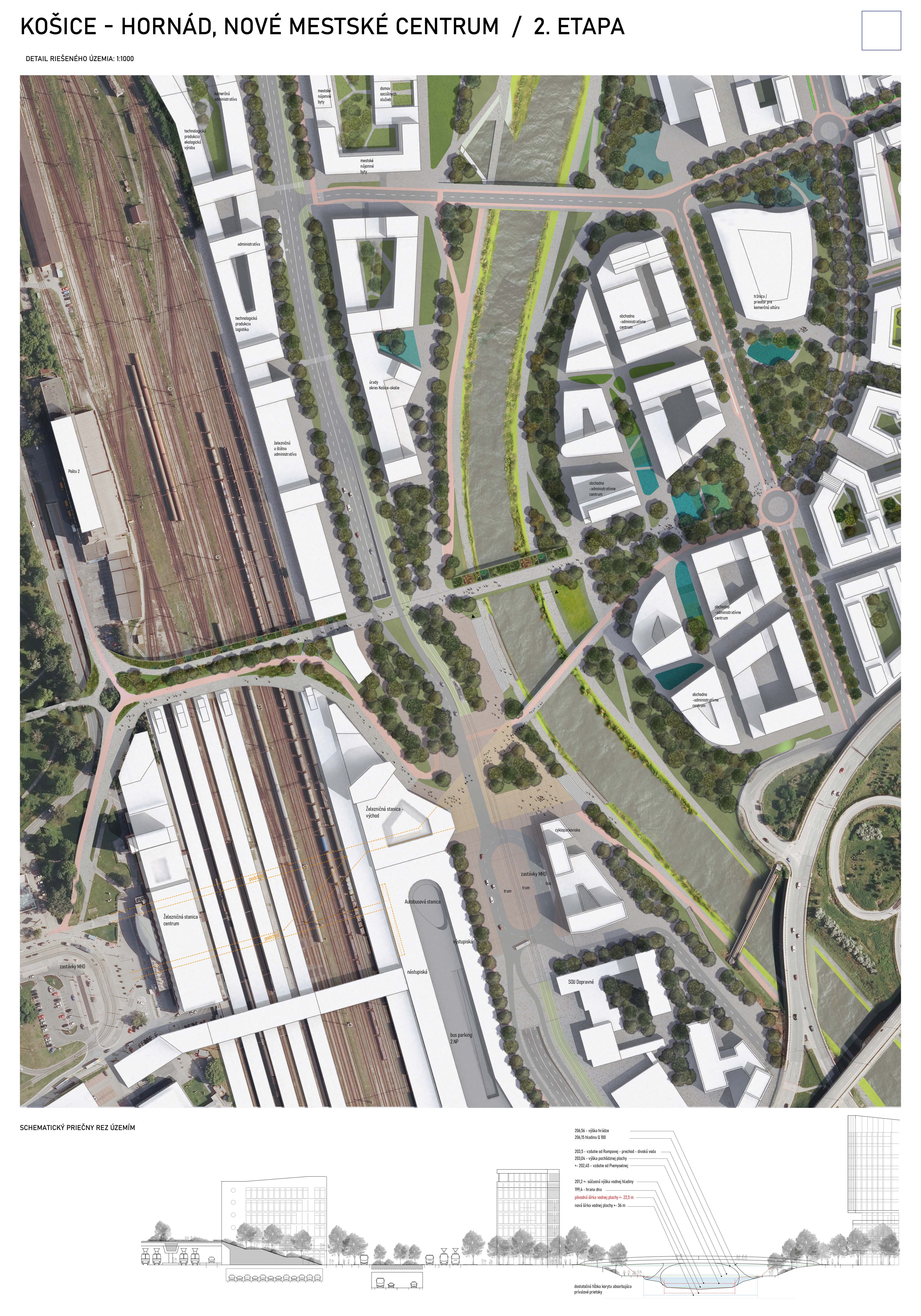 - návrh štruktúru vhodným spôsobom napája na historické štruktúry mesta a zároveň zhodnocuje územie okolia Hornádu v riešenom území