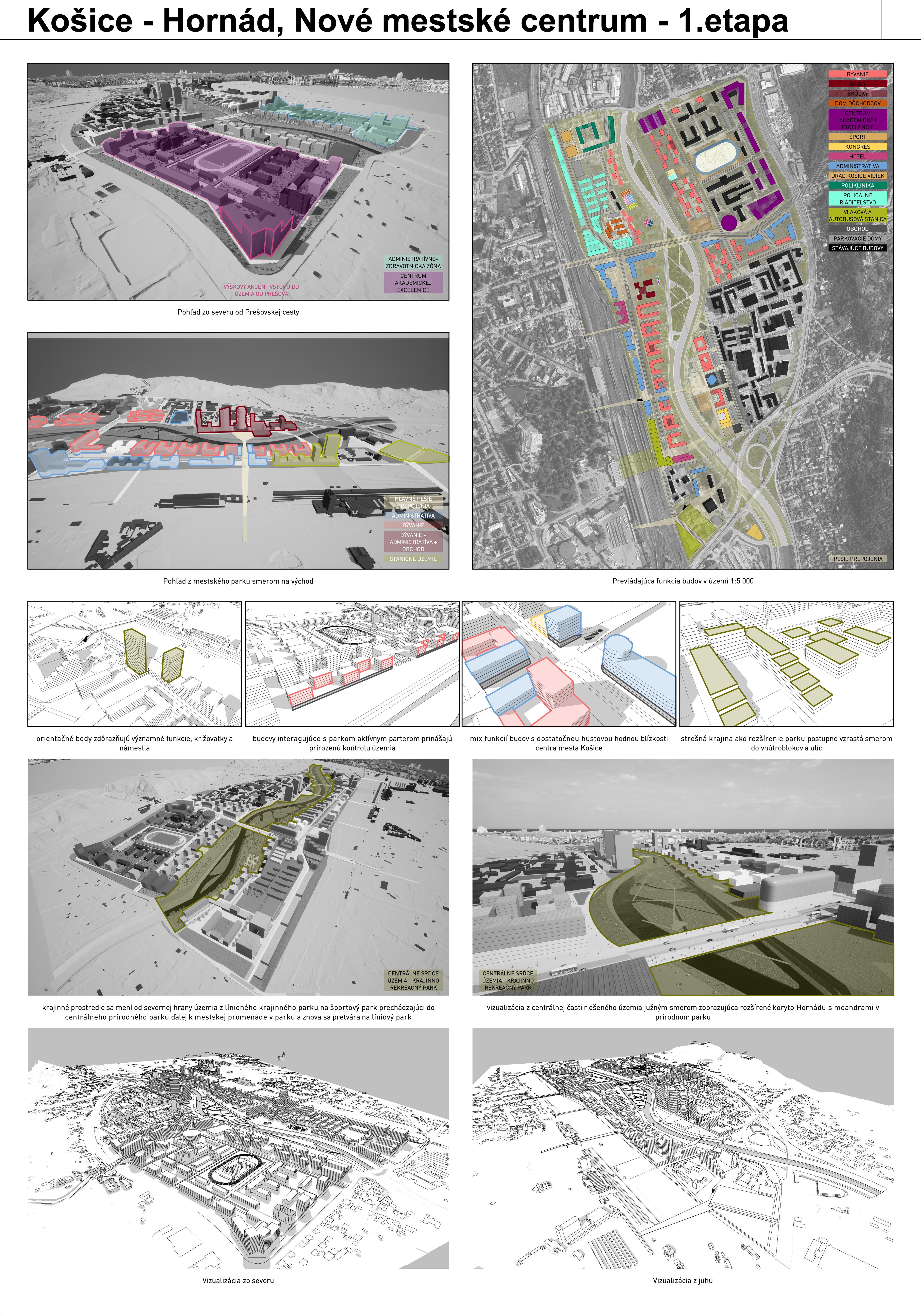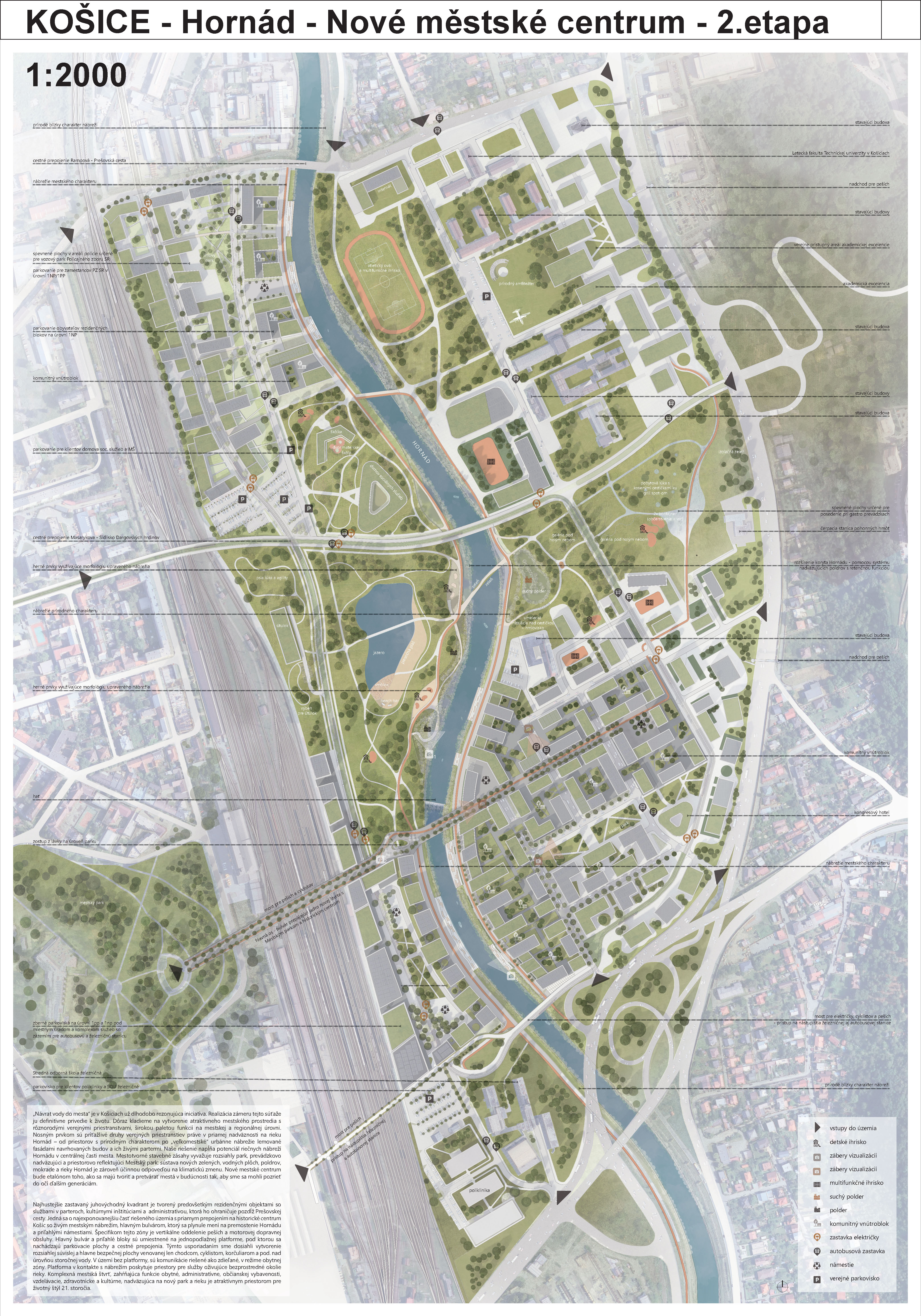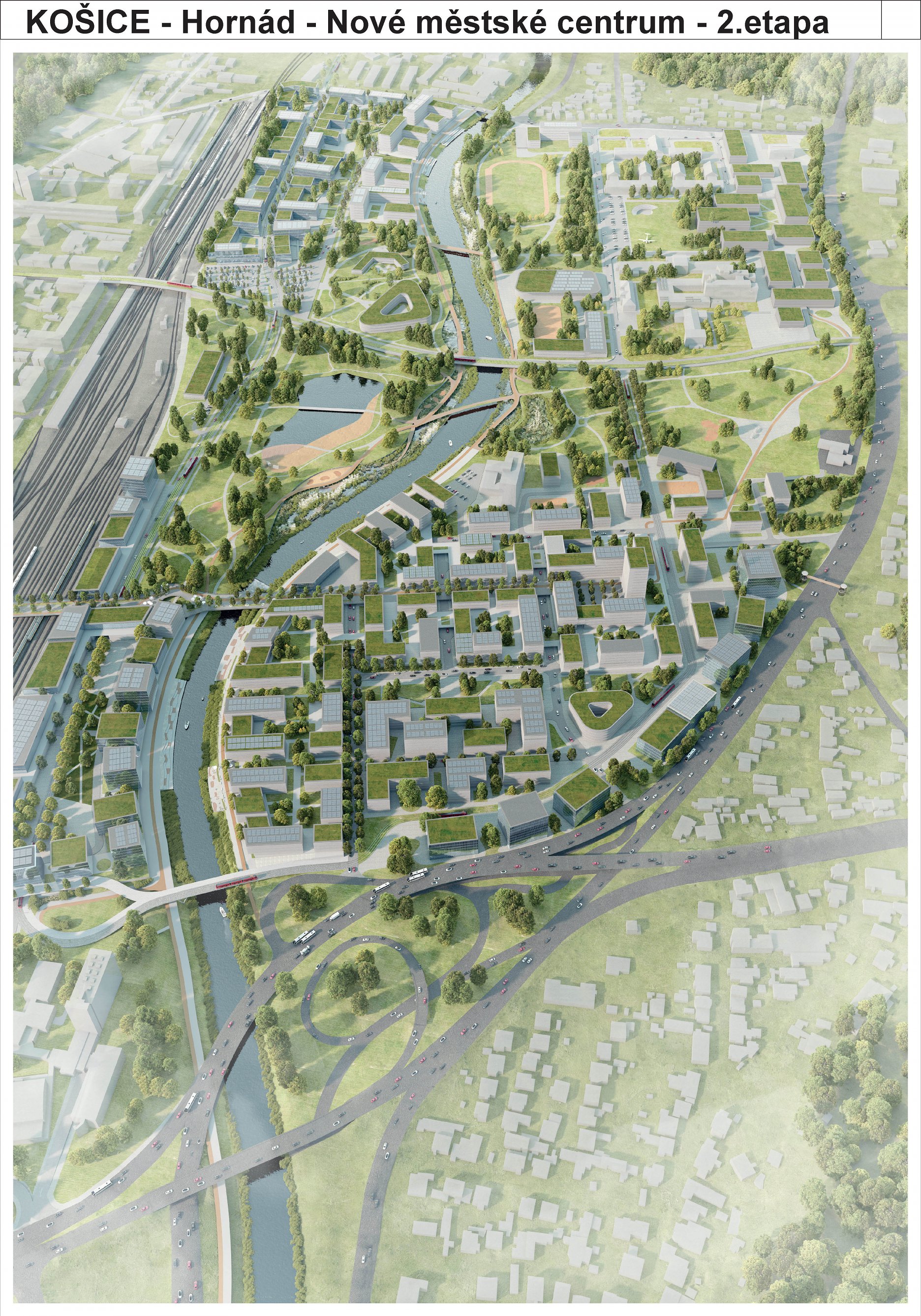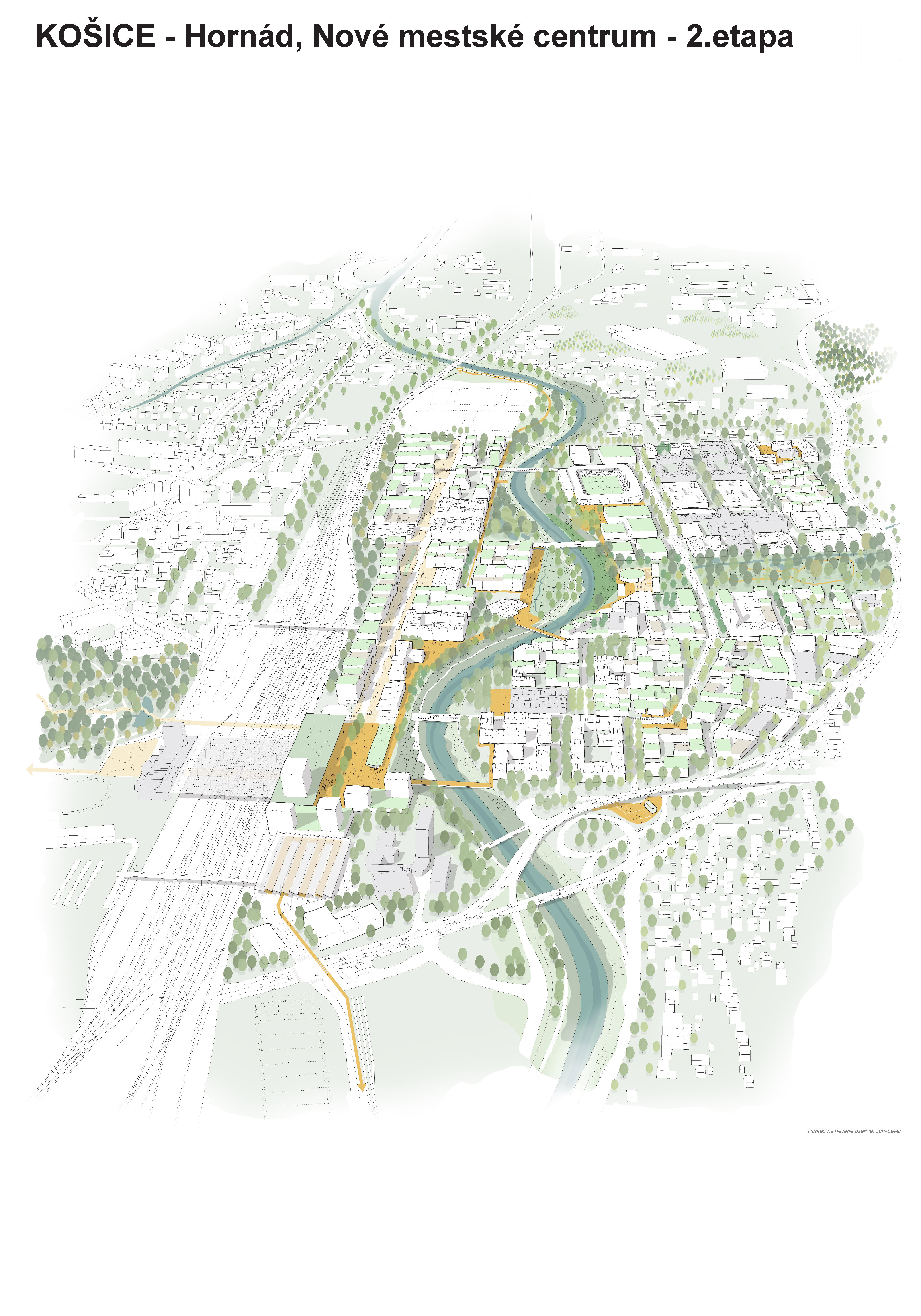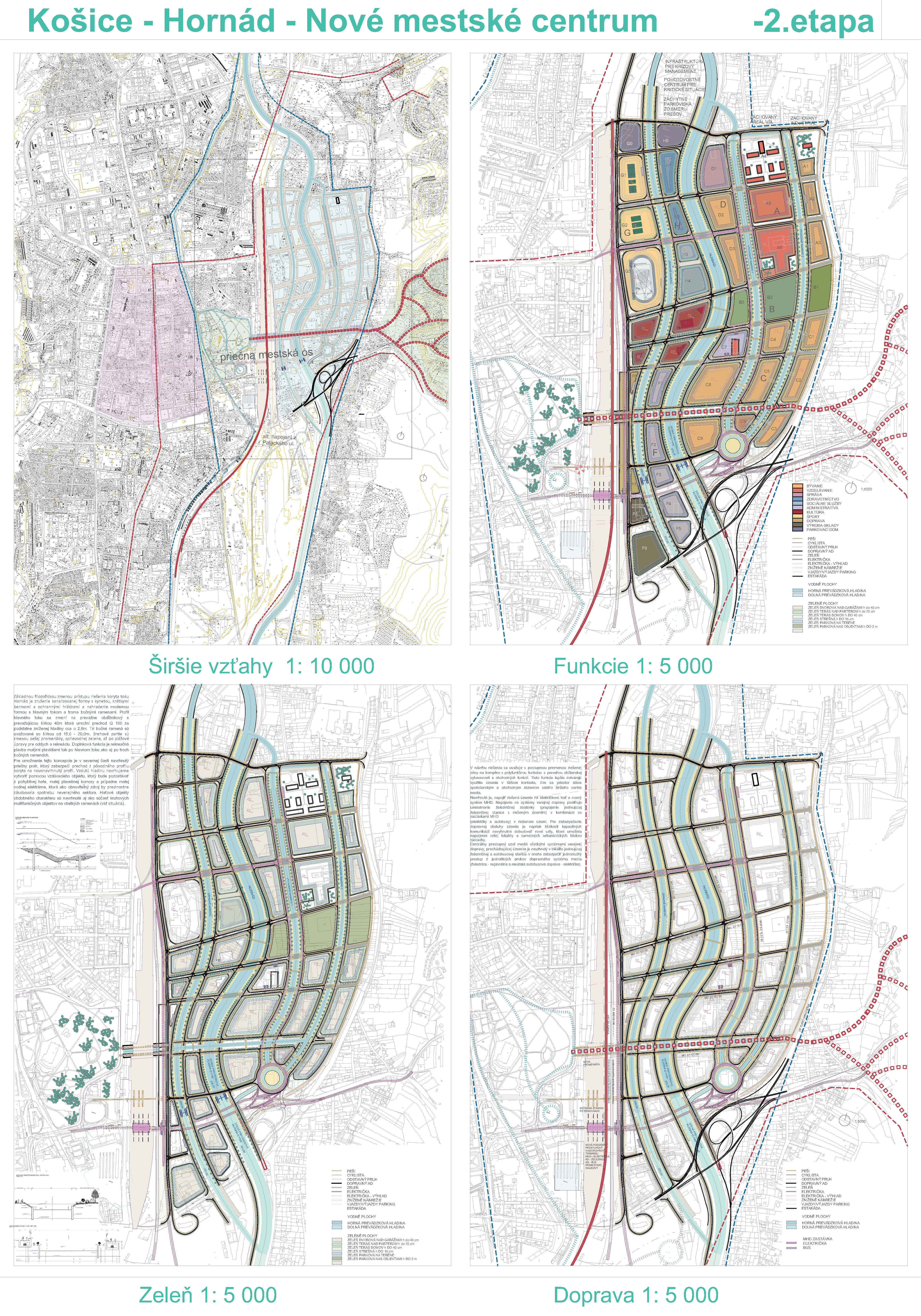 - návrh štruktúru vhodným spôsobom napája na historické štruktúry mesta a zároveň zhodnocuje územie okolia Hornádu v riešenom území