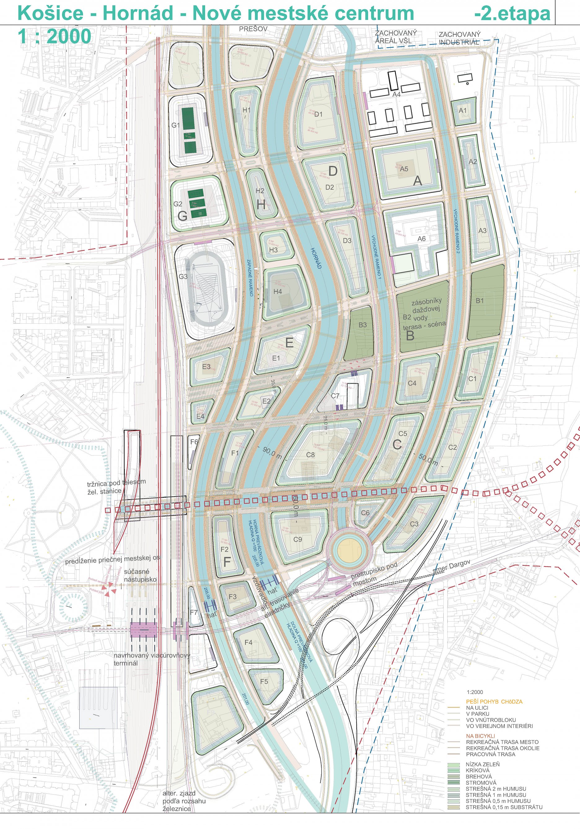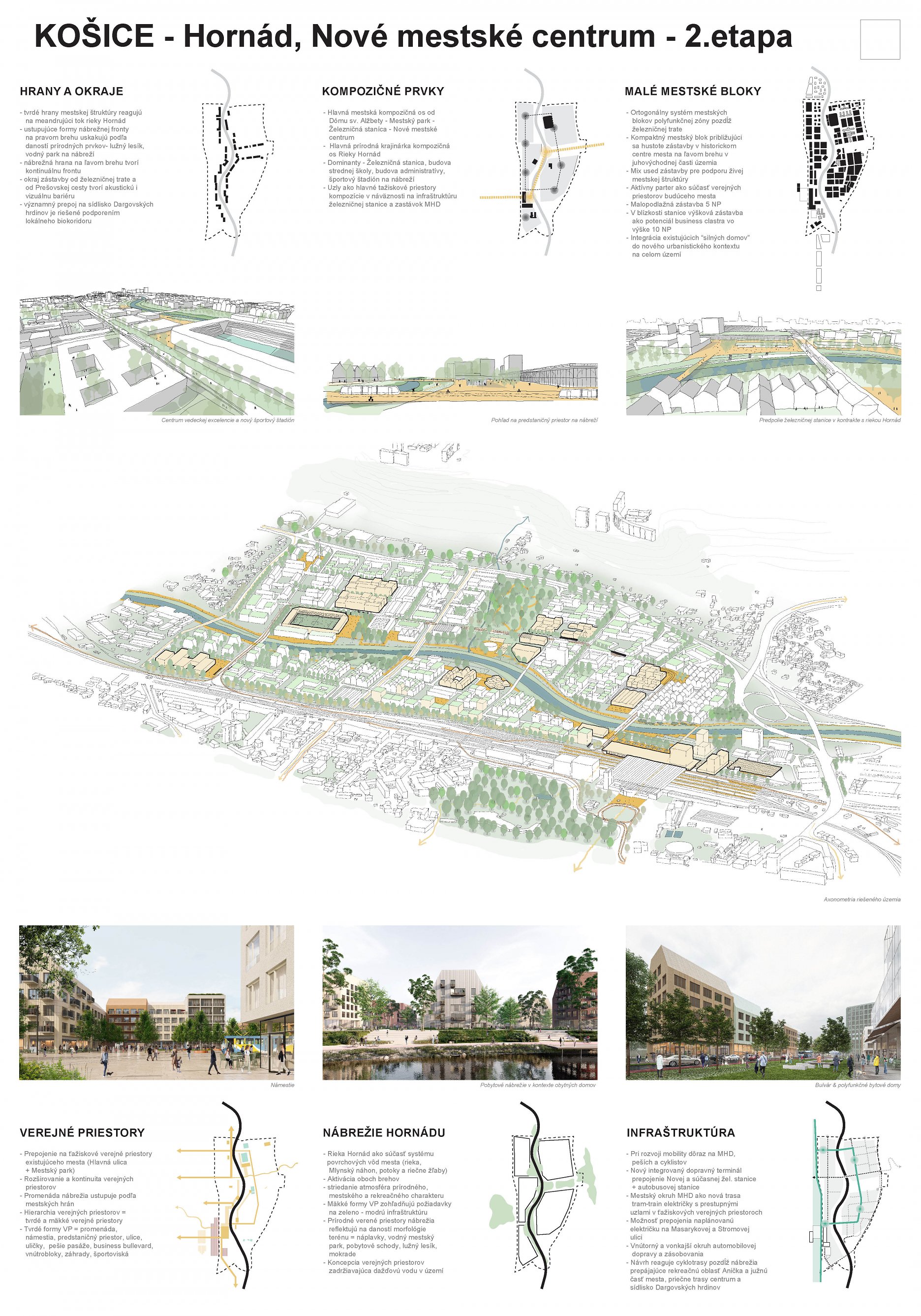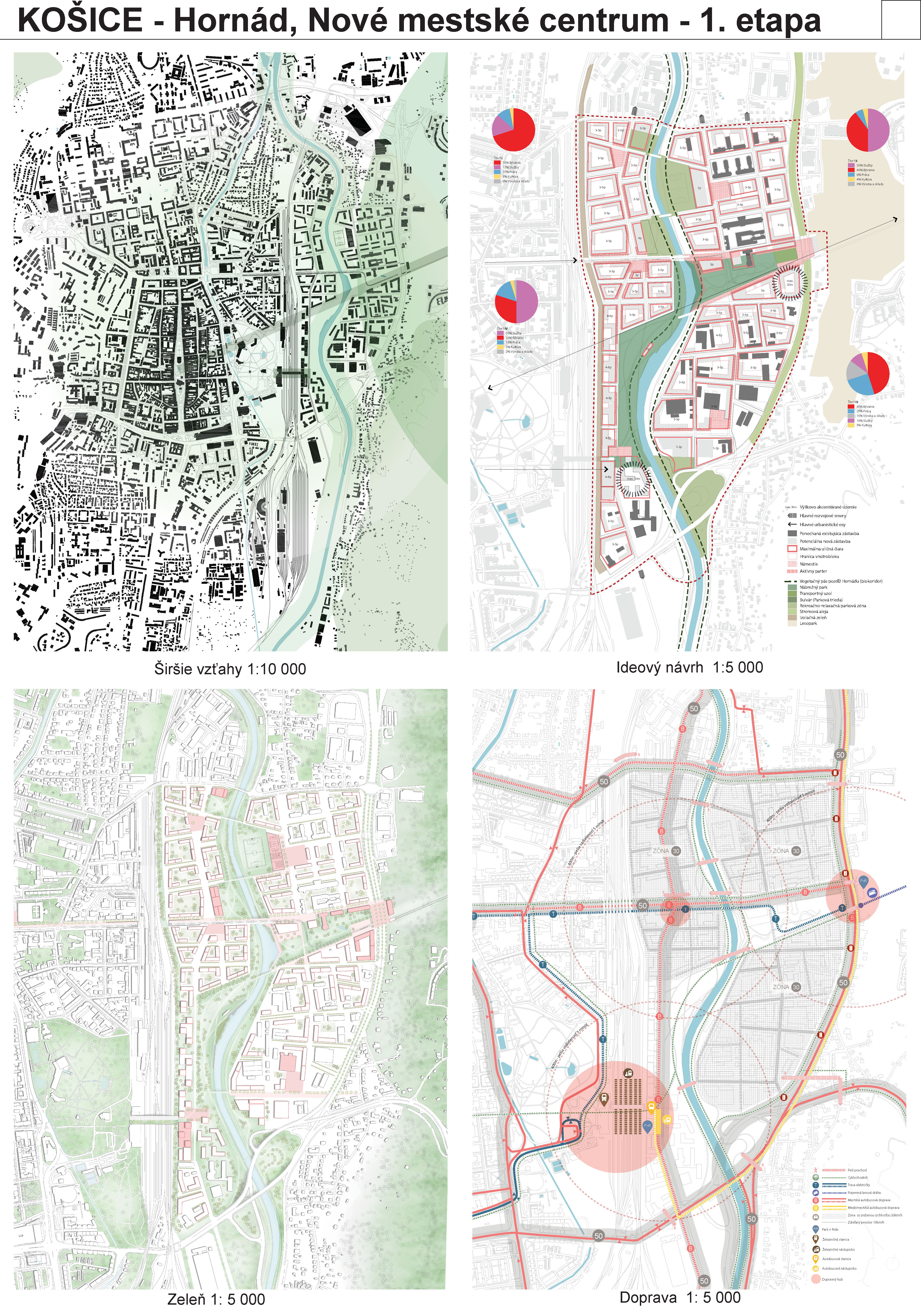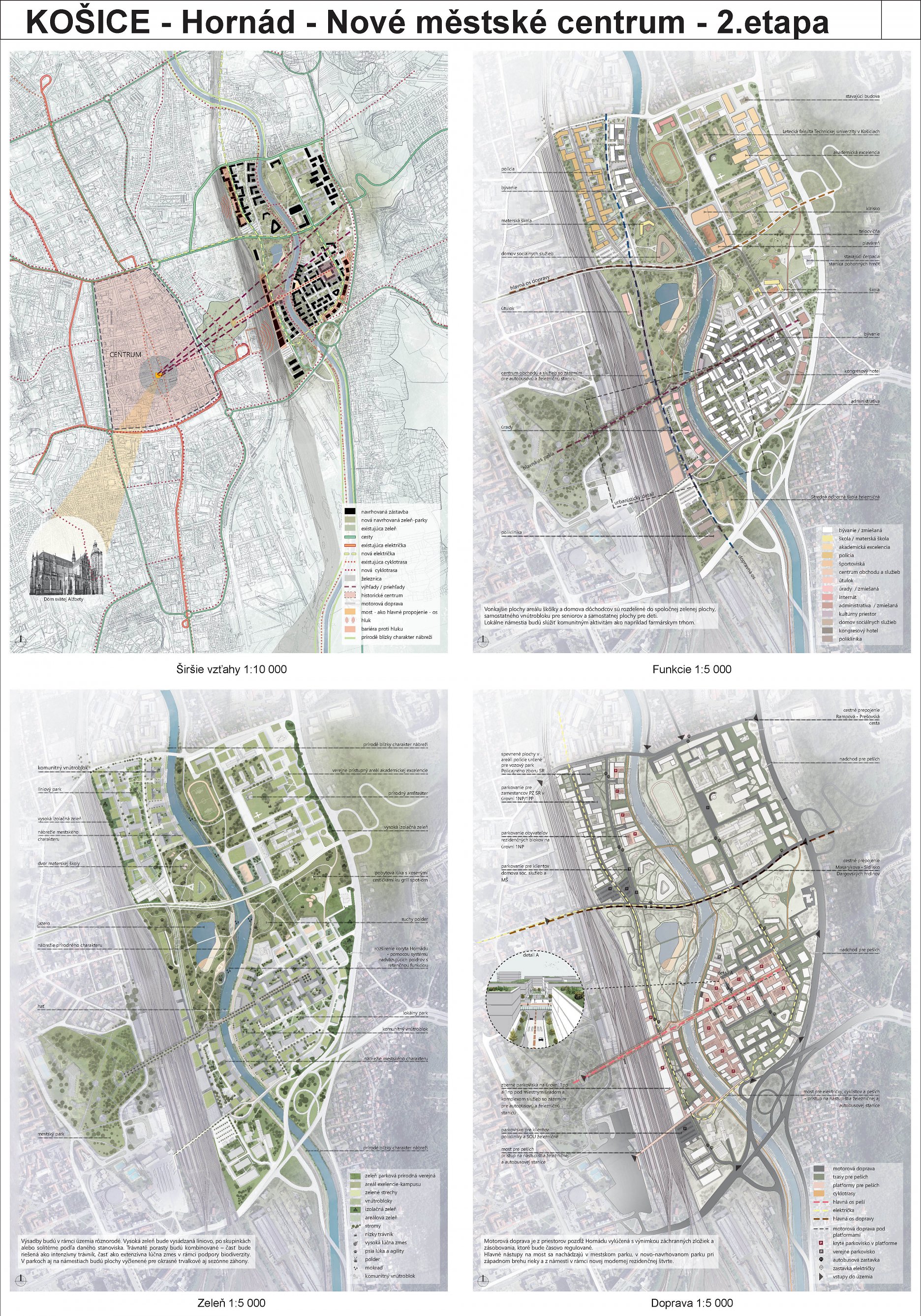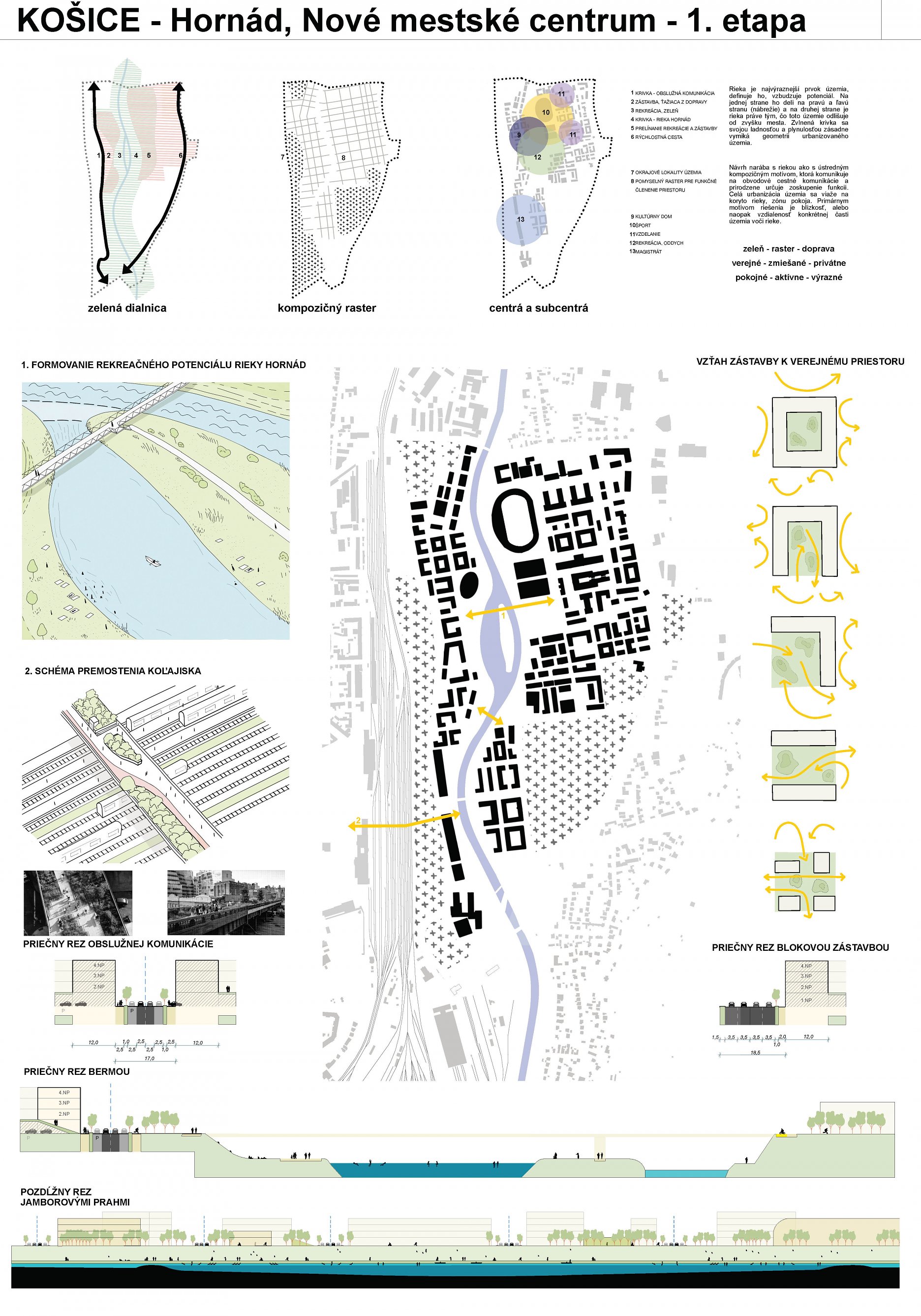 - návrh štruktúru vhodným spôsobom napája na historické štruktúry mesta a zároveň zhodnocuje územie okolia Hornádu v riešenom území