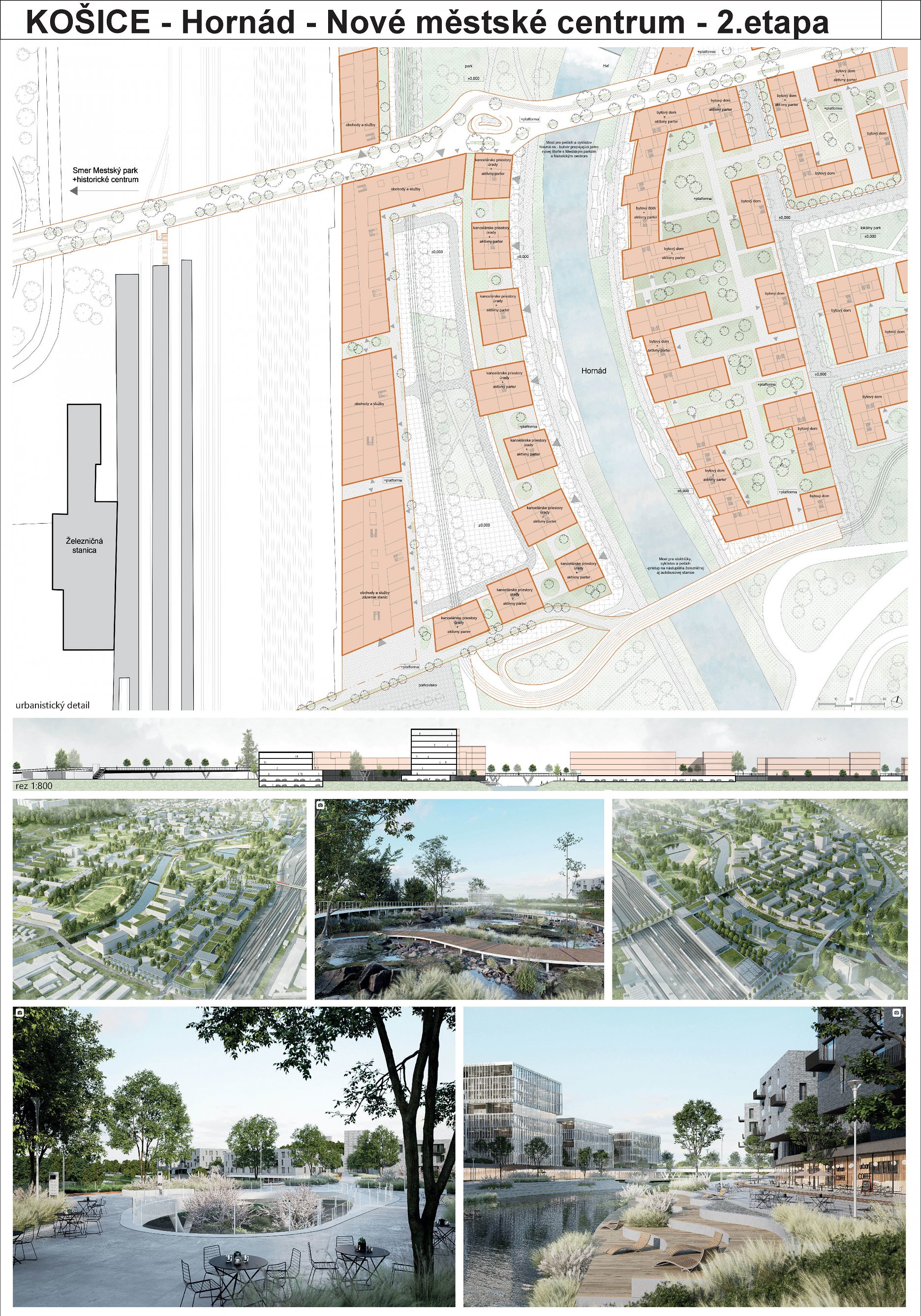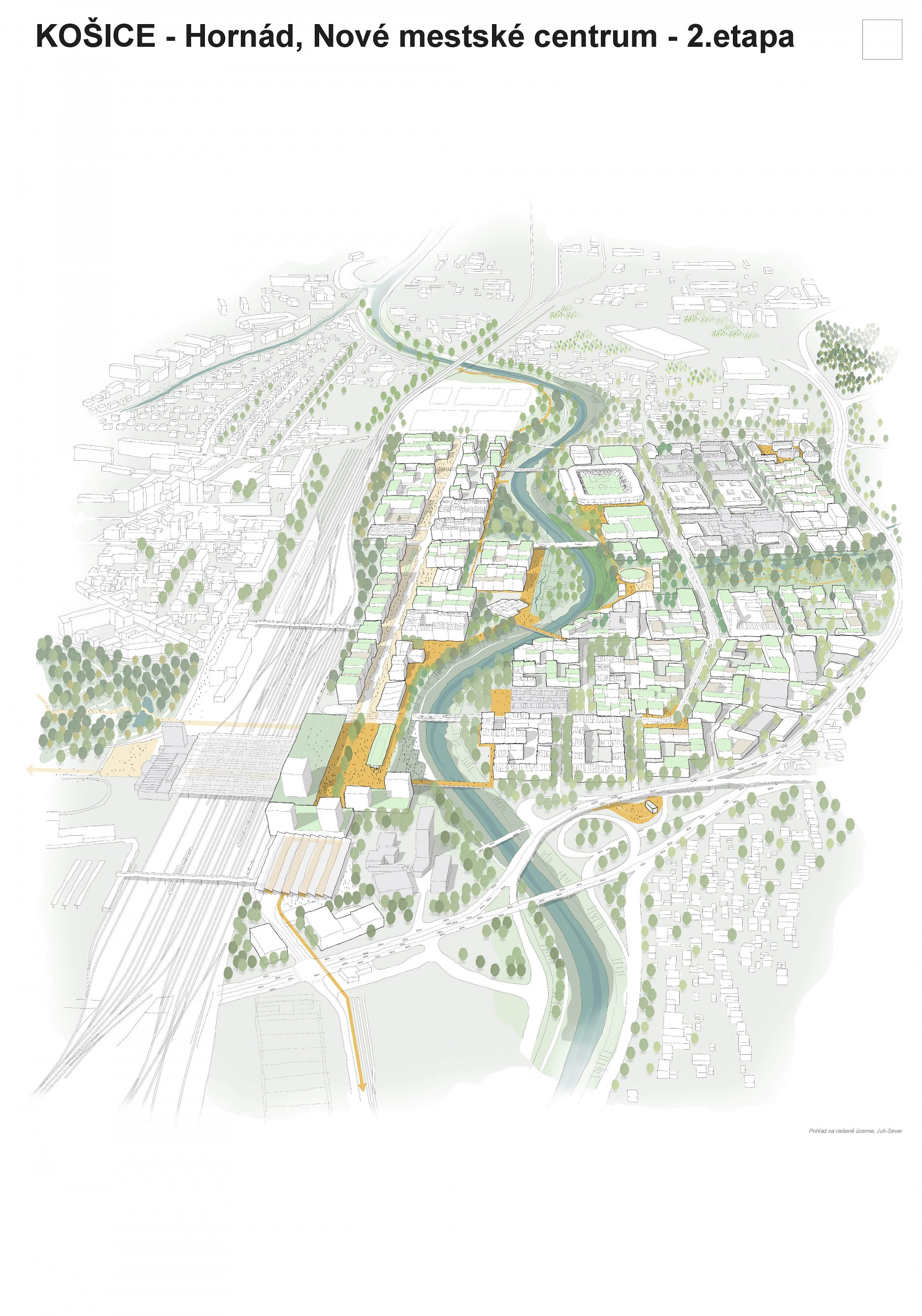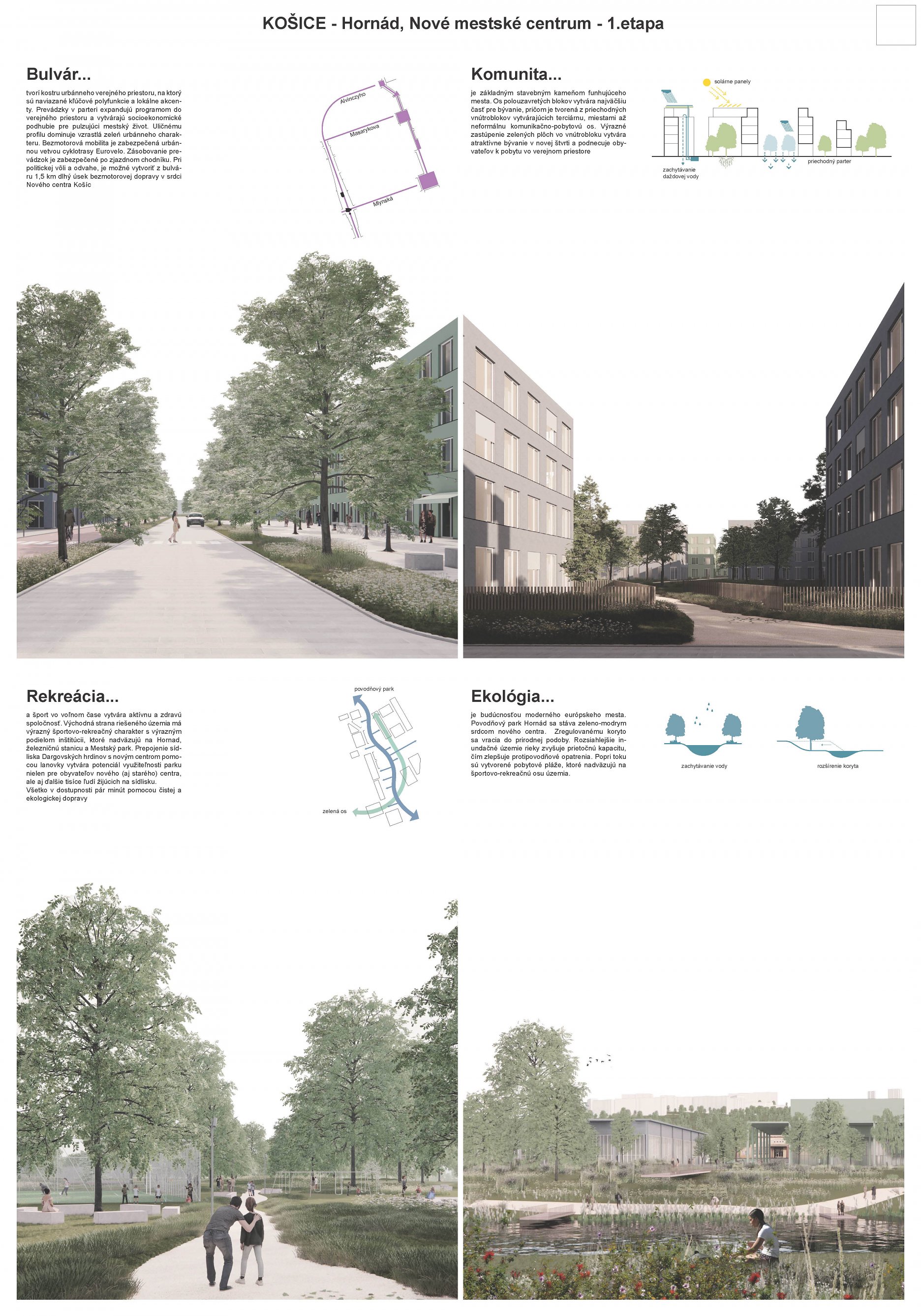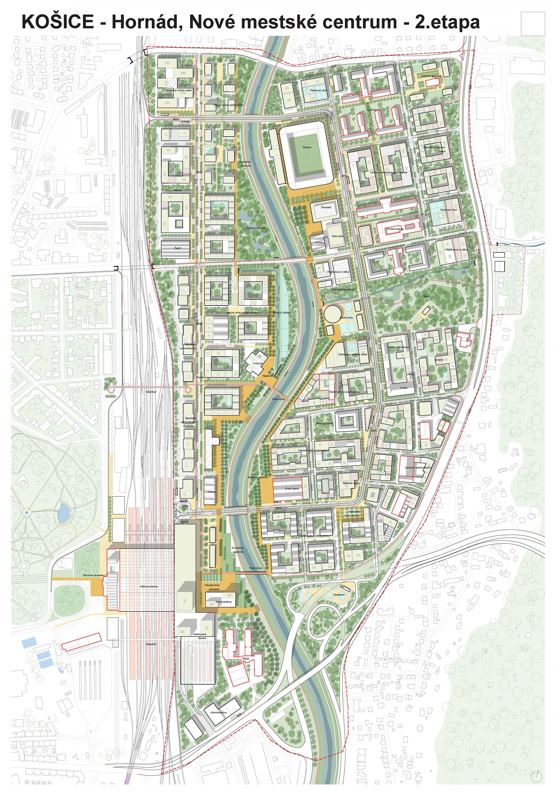 - návrh štruktúru vhodným spôsobom napája na historické štruktúry mesta a zároveň zhodnocuje územie okolia Hornádu v riešenom území