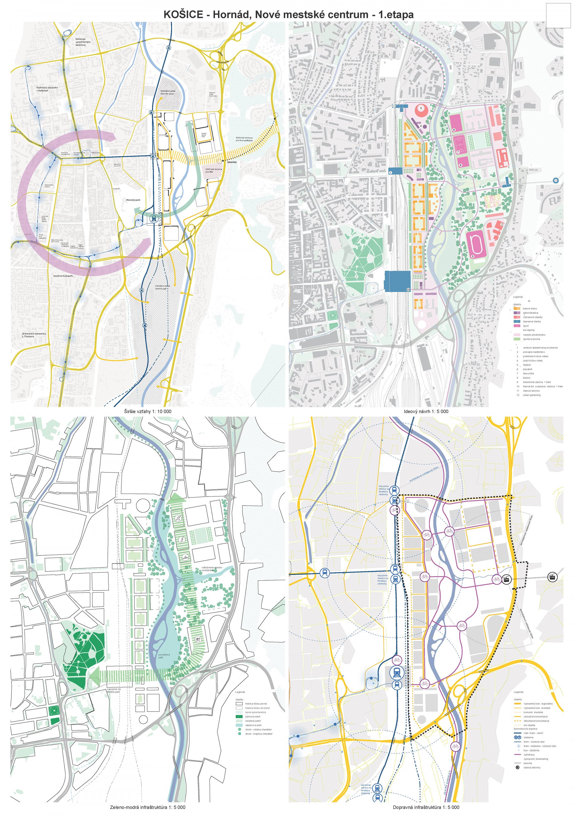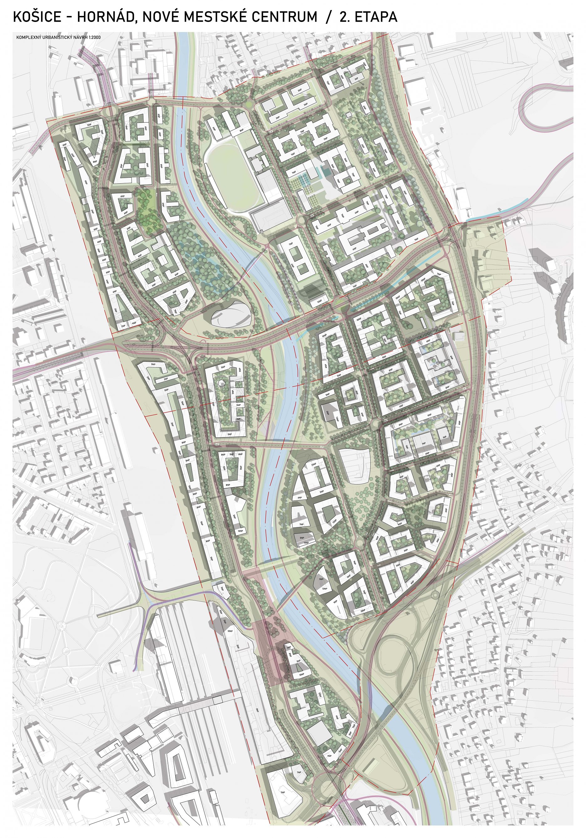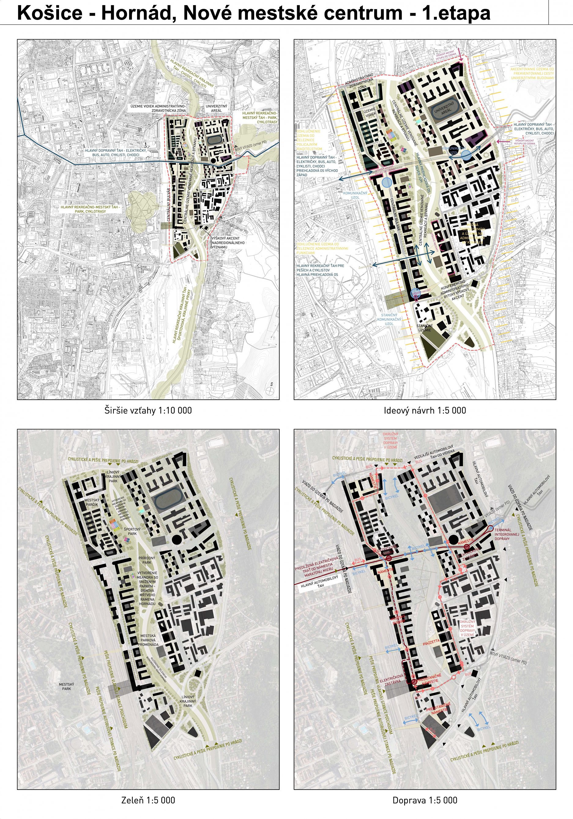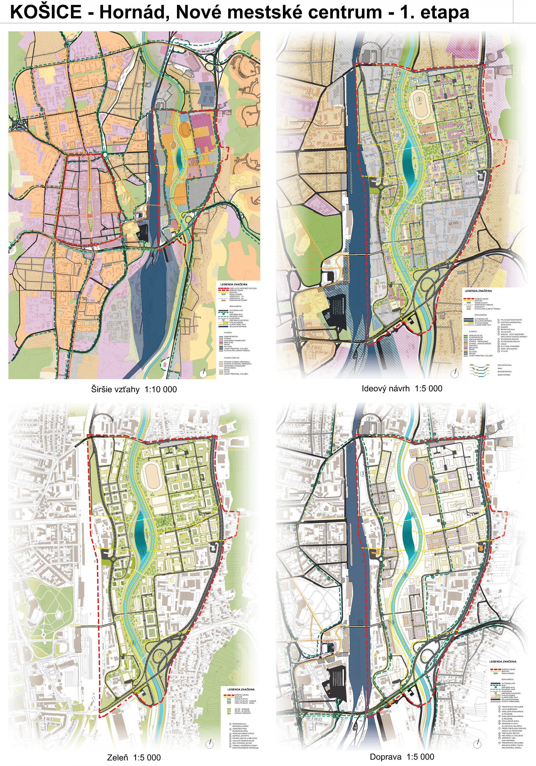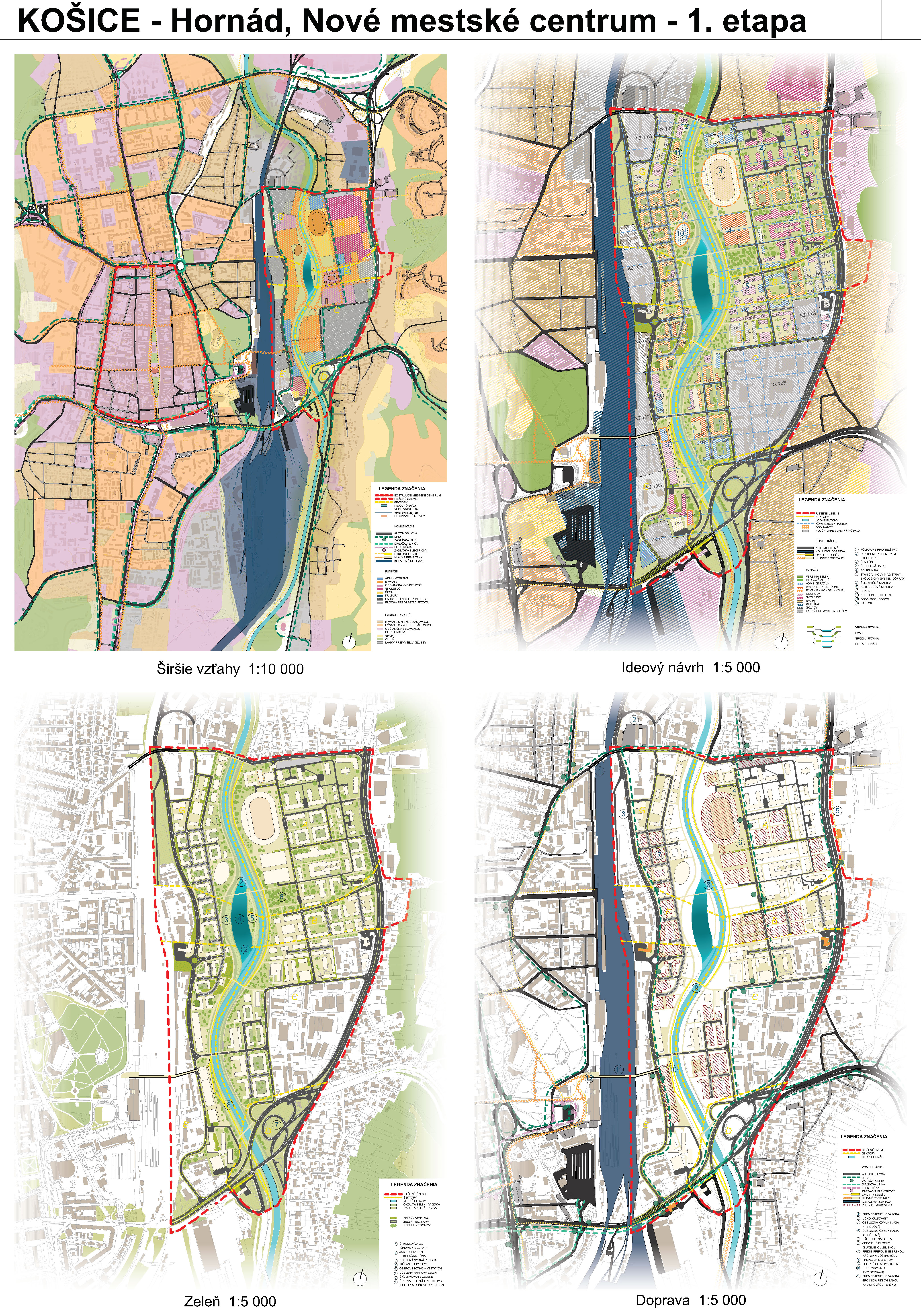 - návrh štruktúru vhodným spôsobom napája na historické štruktúry mesta a zároveň zhodnocuje územie okolia Hornádu v riešenom území