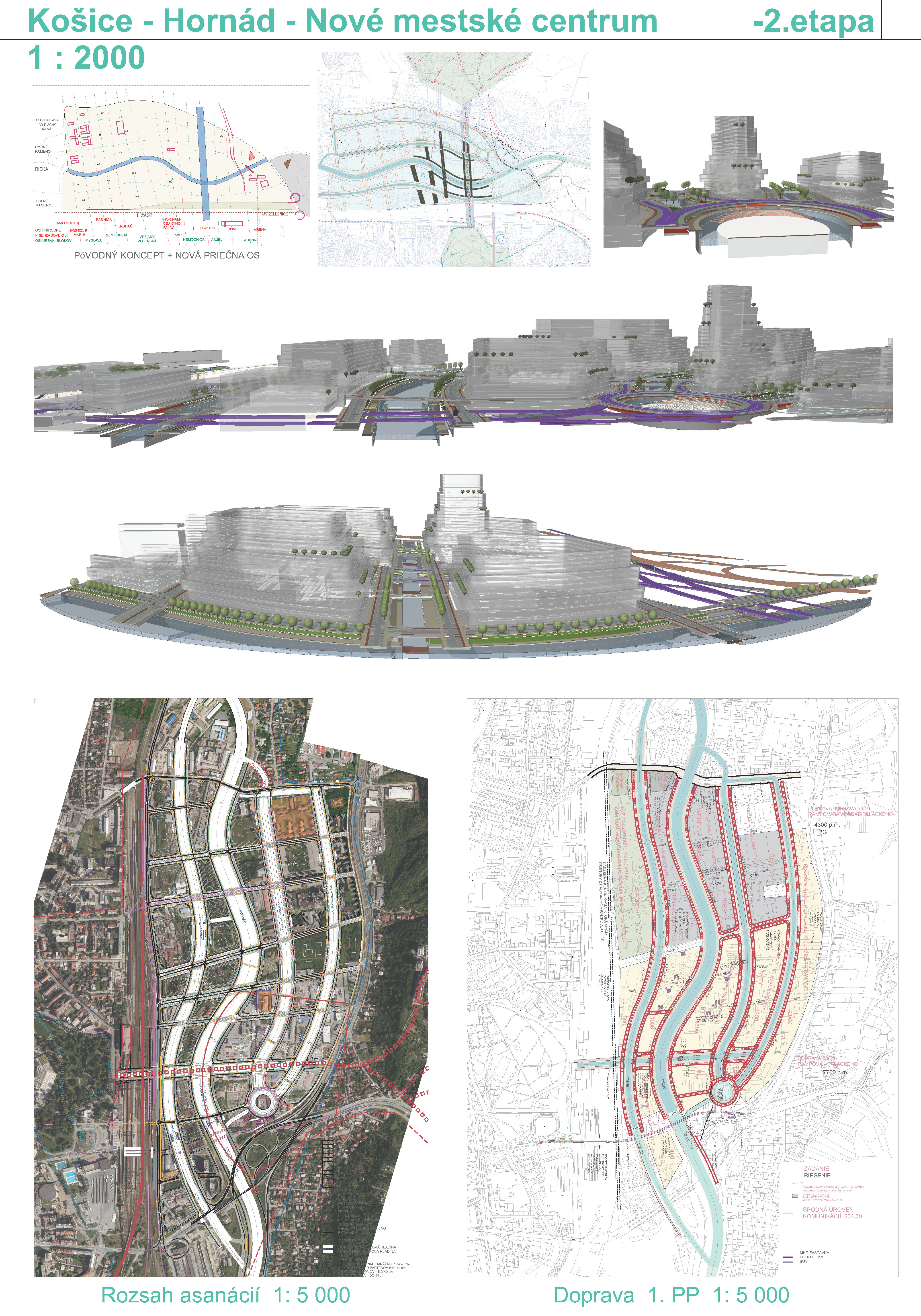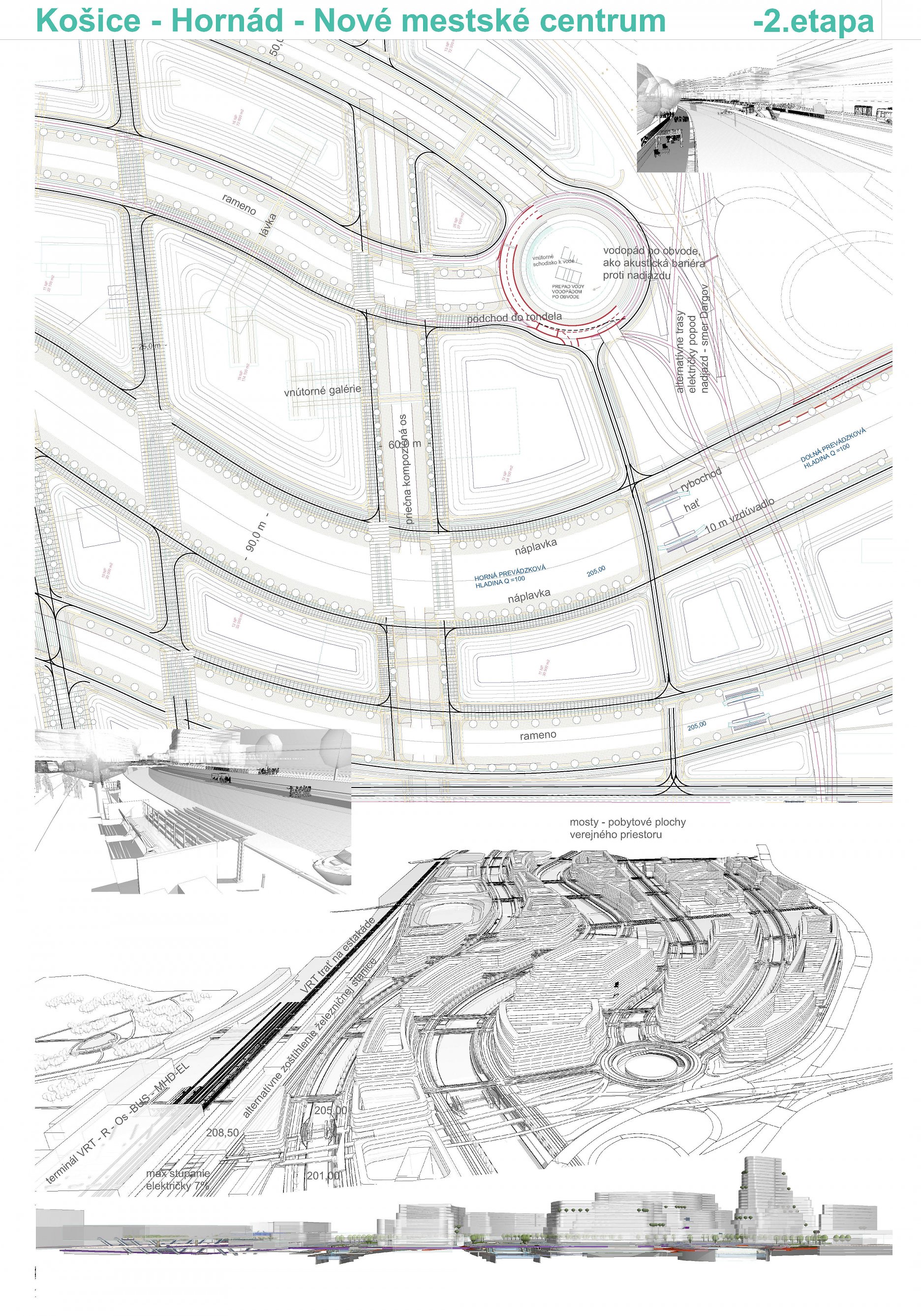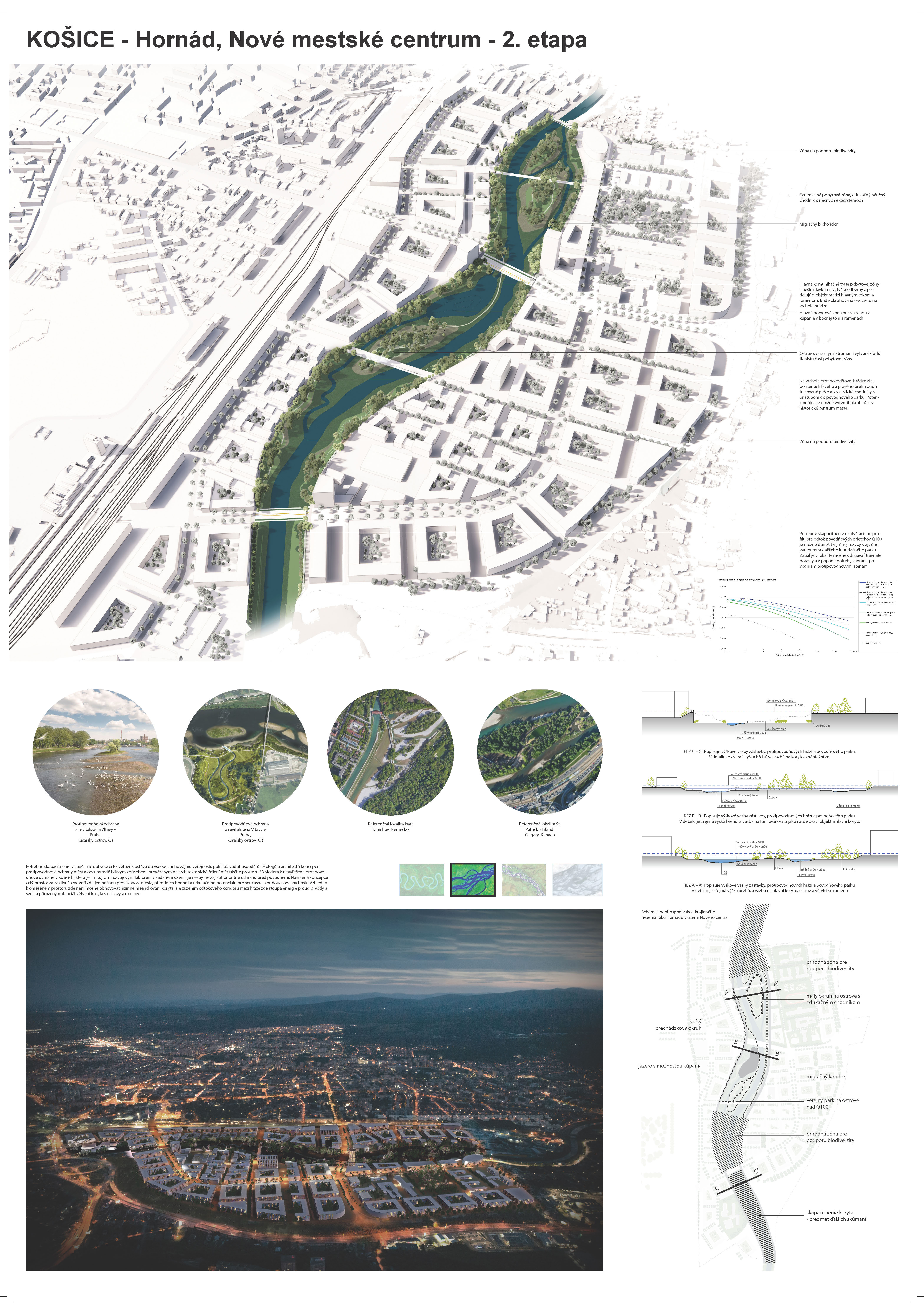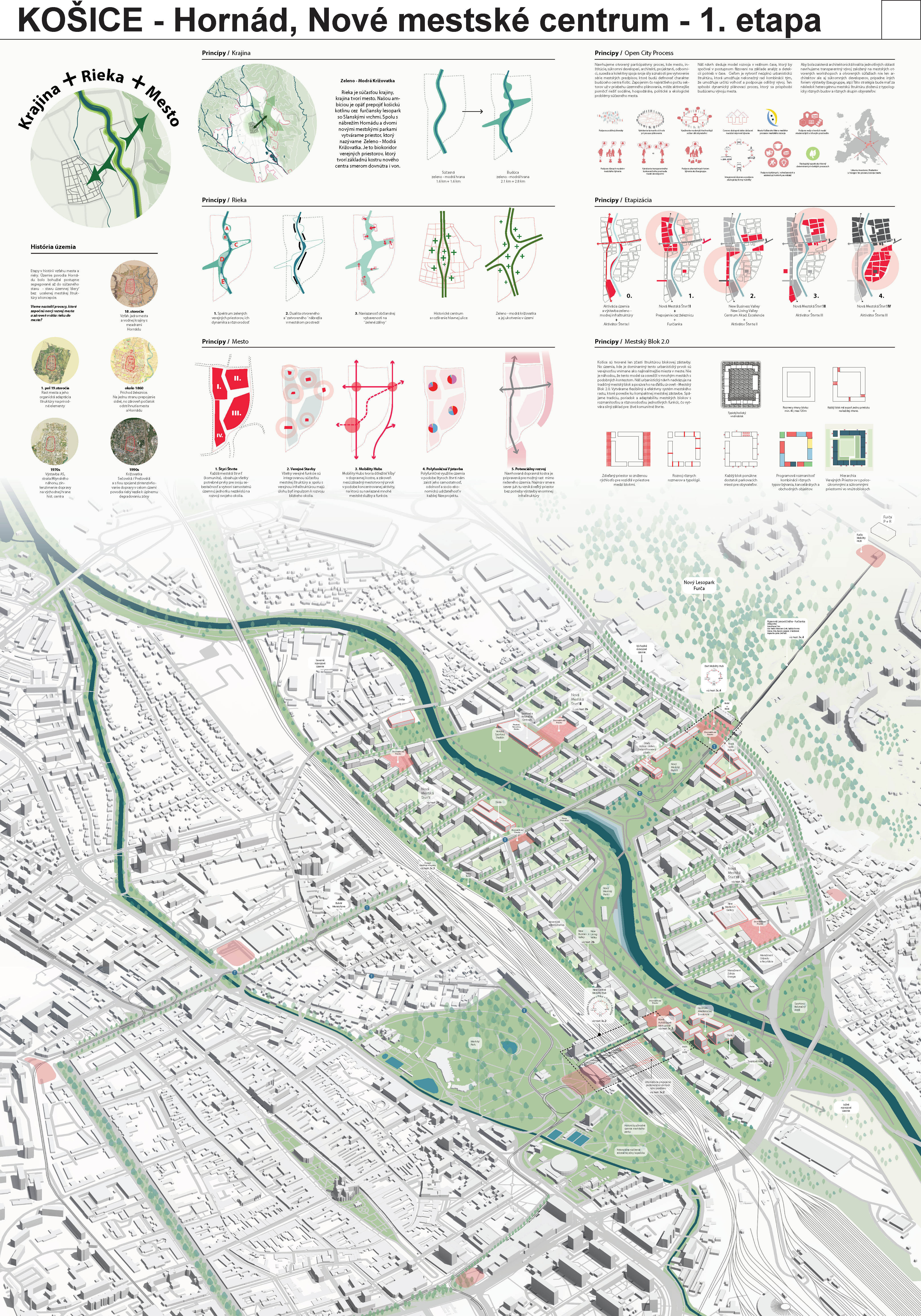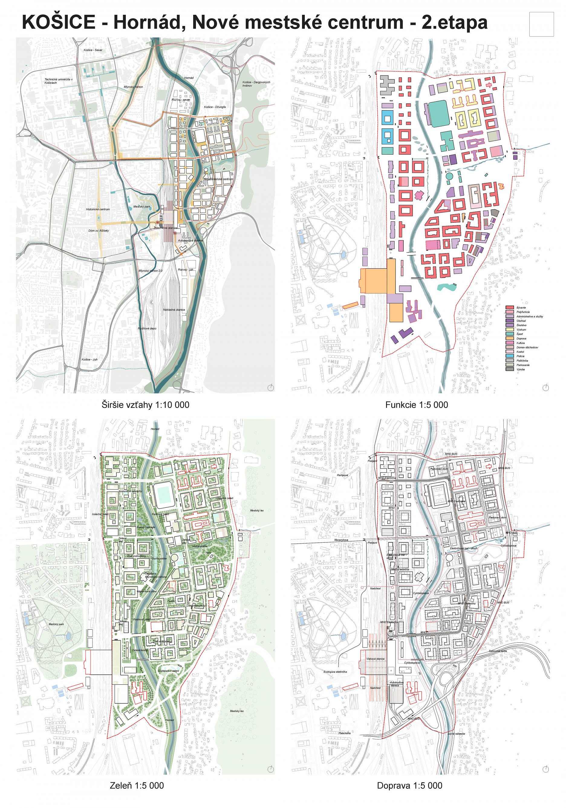 - návrh štruktúru vhodným spôsobom napája na historické štruktúry mesta a zároveň zhodnocuje územie okolia Hornádu v riešenom území