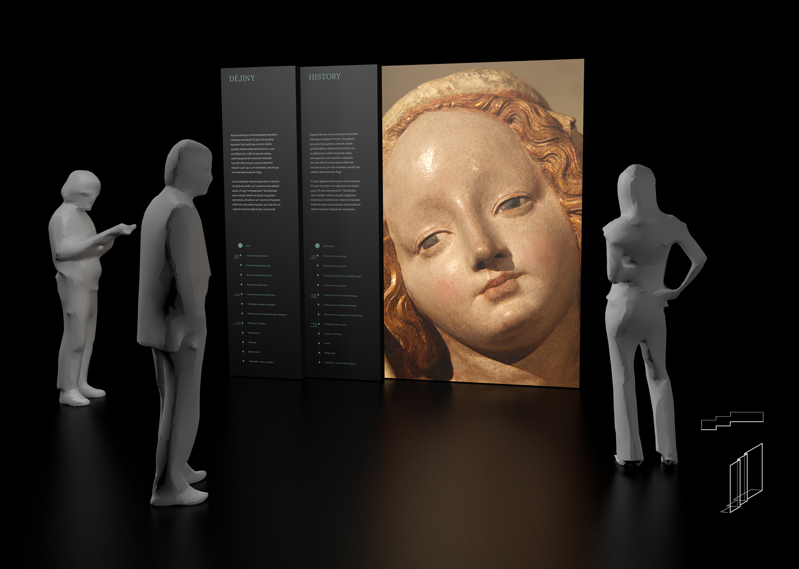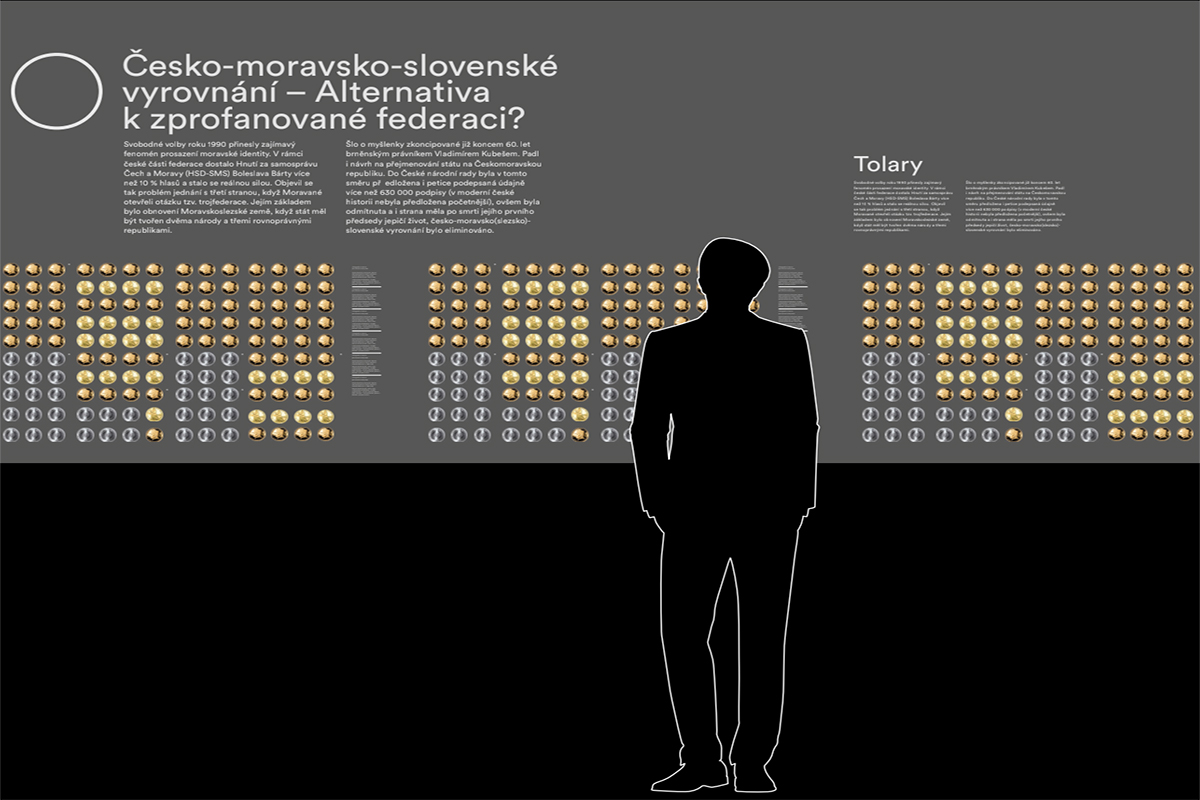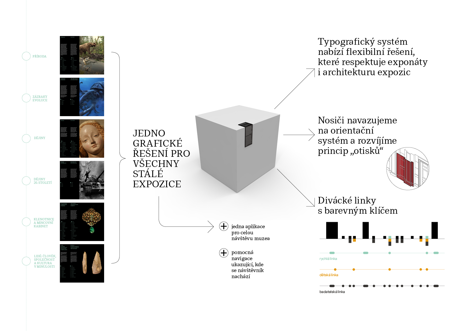 Štúdio pôvodne navrhlo dizajn všetkých piatich expozícií. Účelom bolo ich spolupôsobenie a zjednotená vizuálna stránka. Skúsený ateliér bude nakoniec realizovať tri expozície. Pôvodný návrh bude mierne upravený, aby lepšie spolupôsobil s charakterom historickej budovy. Zostáva flexibilný systém typografie, využitie písma Messina a jednotná grafika sprievodcu expozícií.