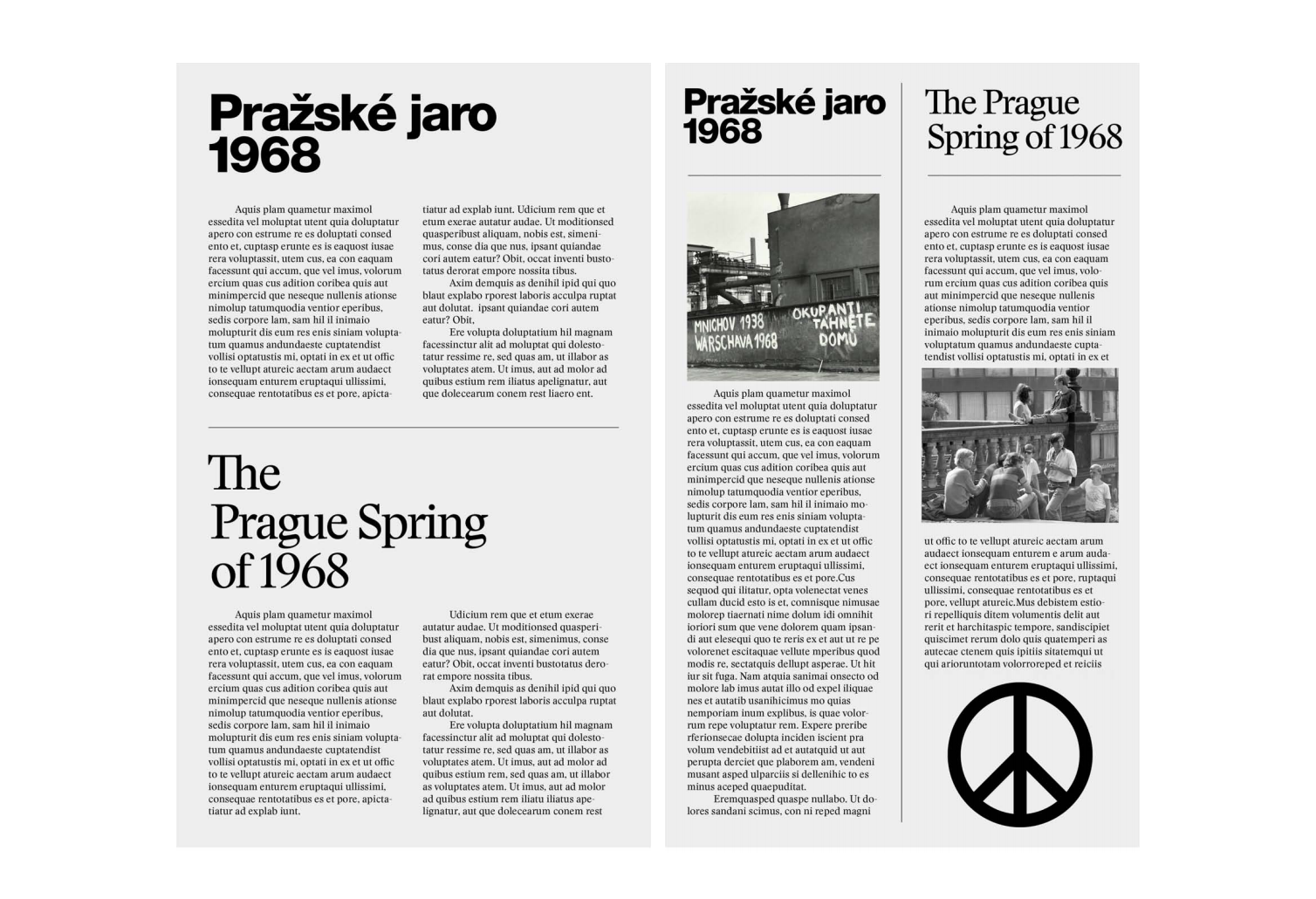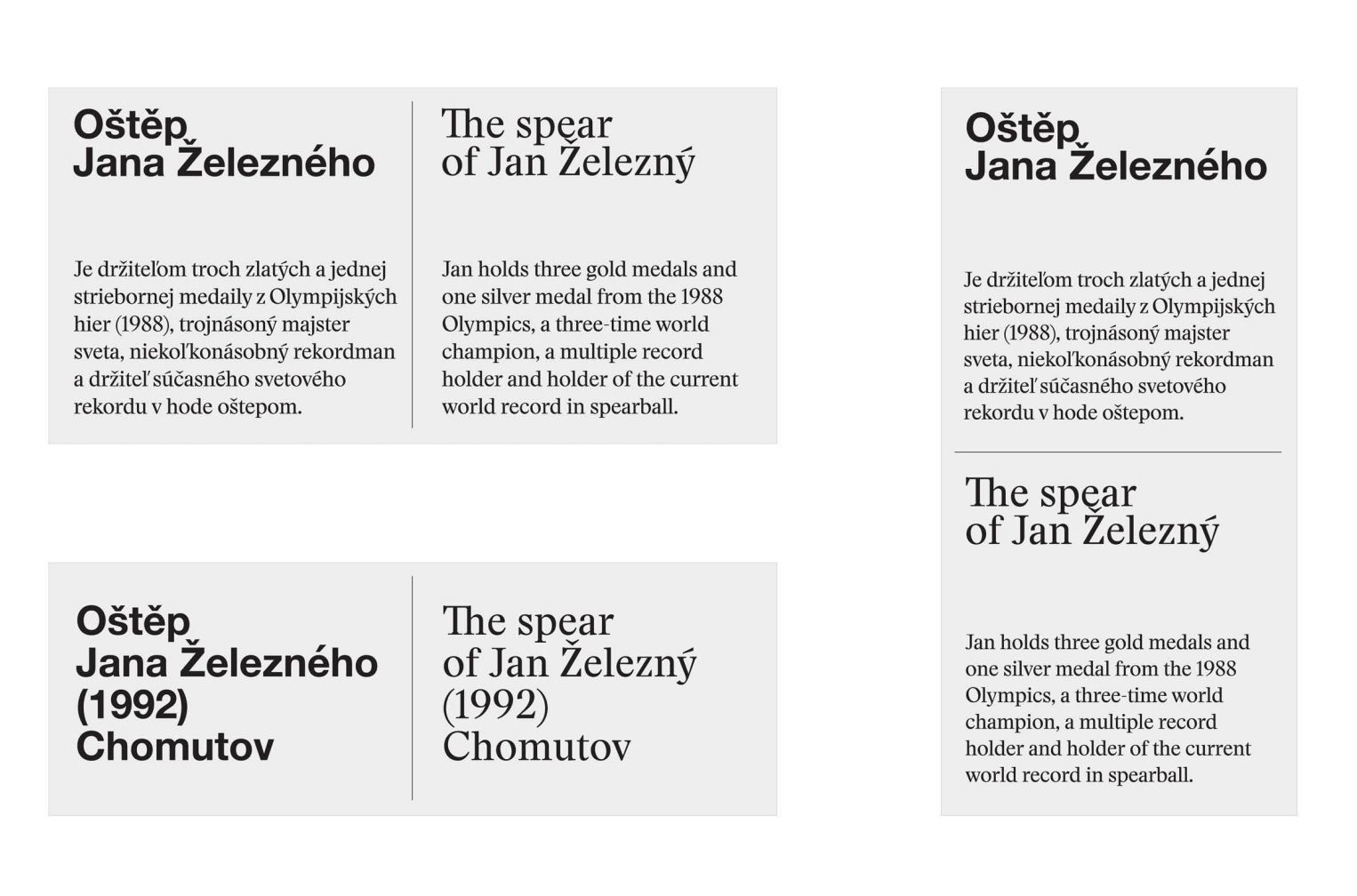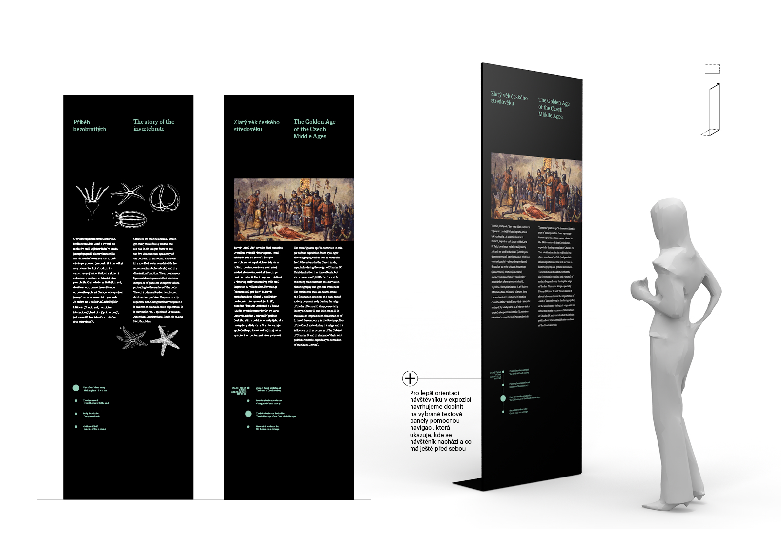Štúdio pôvodne navrhlo dizajn všetkých piatich expozícií. Účelom bolo ich spolupôsobenie a zjednotená vizuálna stránka. Skúsený ateliér bude nakoniec realizovať tri expozície. Pôvodný návrh bude mierne upravený, aby lepšie spolupôsobil s charakterom historickej budovy. Zostáva flexibilný systém typografie, využitie písma Messina a jednotná grafika sprievodcu expozícií.