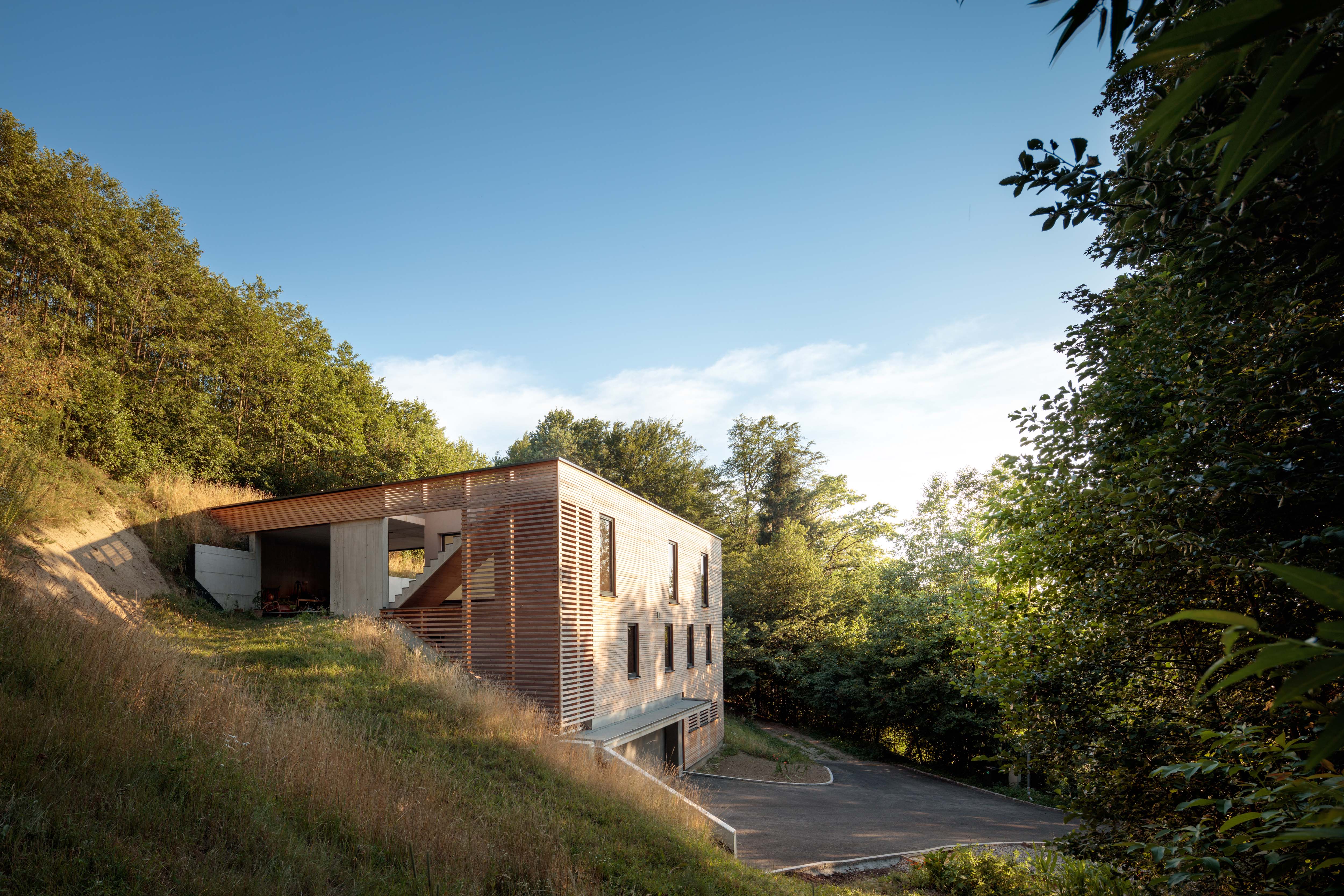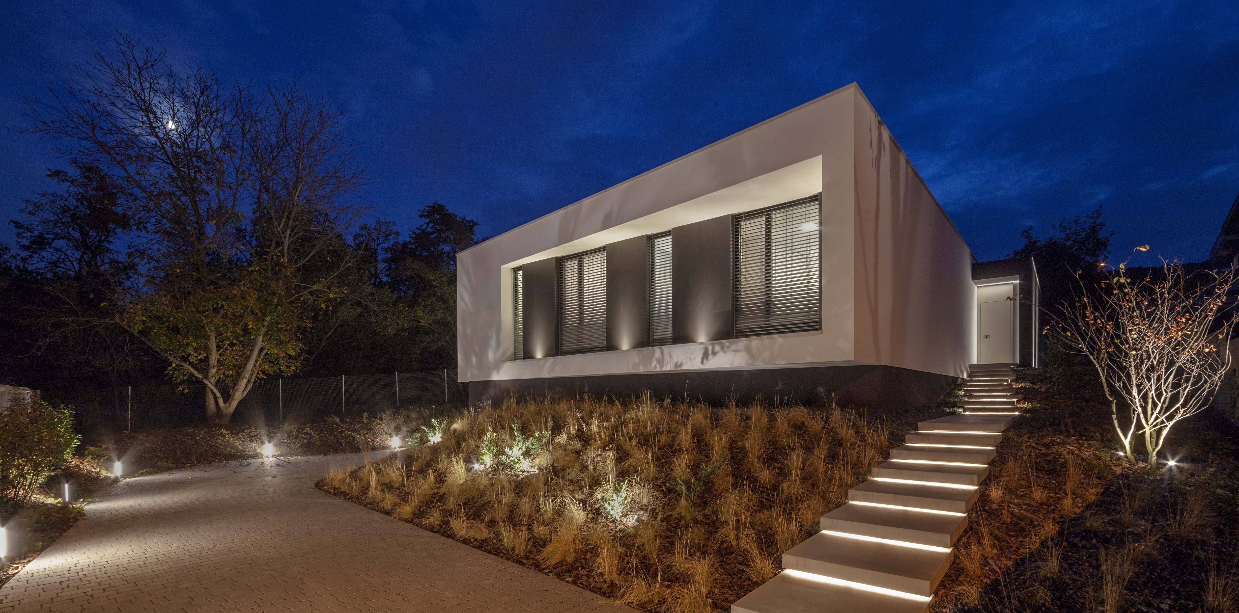Novostavba pozostávajúca zo suterénu a prízemia je osadená do svahovitej parcely hraničiacej s lesom. Nadzemné podlažie je osadené na "podnoži" s pochôdznou extenzívnou zelenou strechou. Dostatok prirodzeného svetla do suterénu vedie malé átrium, ktoré prechádza cez obe podlažia. Rozmerné zasklenie dennej zóny zabezpečuje prívod denného svetla do hlbokej dispozície nadzemného podlažia. "Vila v Maďarsku je príkladom toho, ako práca s osvetlením a dispozíciou dokáže ´skrytý´ suterén premeniť na kvalitný a využiteľný priestor," hodnotí Anette Klinger.