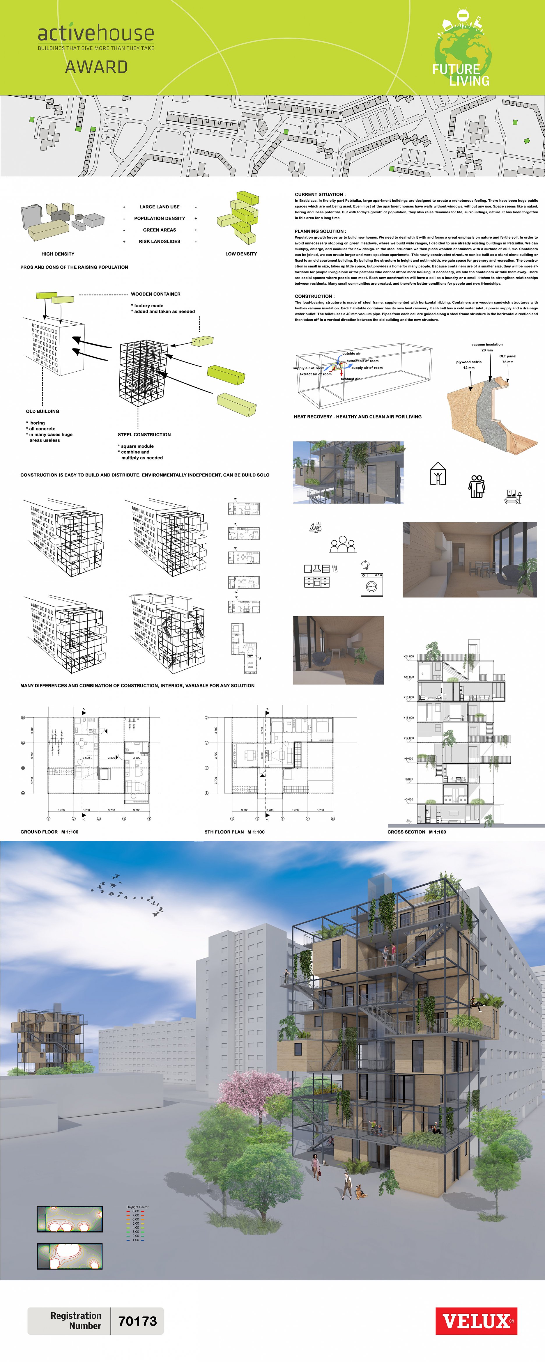 Projekt sa zaoberá nesmrteľnou témou sídliska, jeho zahustením a poľudštením. Využitie kontajnerov v modulárnom systéme zodpovedá logike sídliska, dispozičné riešenie je najmä vo vzťahu k prepojeniu jednotlivých podlaží schodiskom problematické.