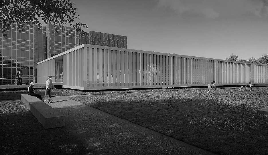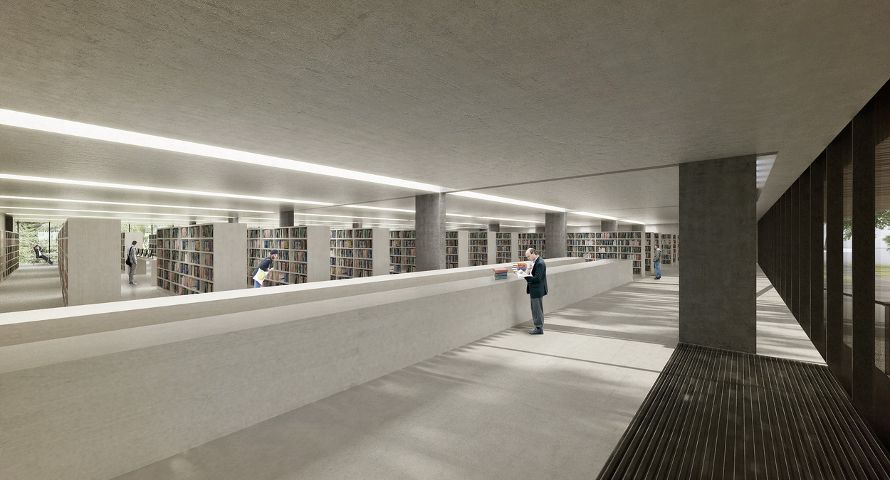 Víťazný návrh rozširuje knižnicu lapidárnou formou "levitujúcej" jednopodlažnej dostavby, ktorá je s pôvodným objektom spojená iba v mieste súčasného vstupu. Vonkajší plášť tvoria predsadené vertikálne copilitové lamely. Horizontálna hmota zodpovedá prevádzkovo dispozičným požiadavkám zadávateľa na vytvorenie nového bezbariérového vstupu do budovy a rozšírenie priestoru voľného výberu v nadväznosti na vstupnú časť objektu. Toto riešenie umožní knižnici voľne sprístupniť viac než 130.000 zväzkov kníh a periodík.