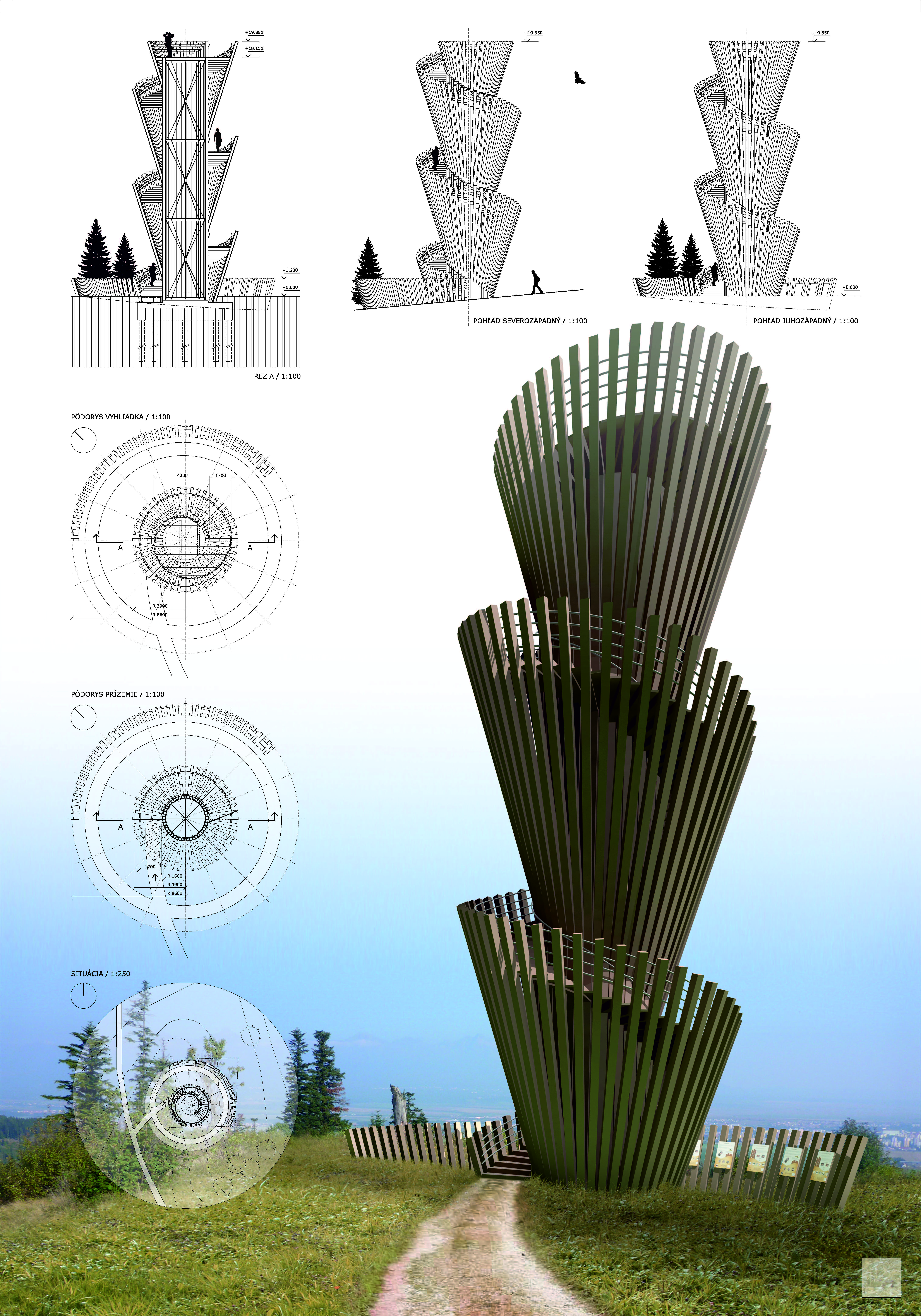 Hodnotenie poroty: Atypické konštrukčné riešenie vytvára možnosť dobrého funkčného využitia, návrh poskytuje možnosť panoramatických výhľadov na krajinu z rôznych výškových úrovní.