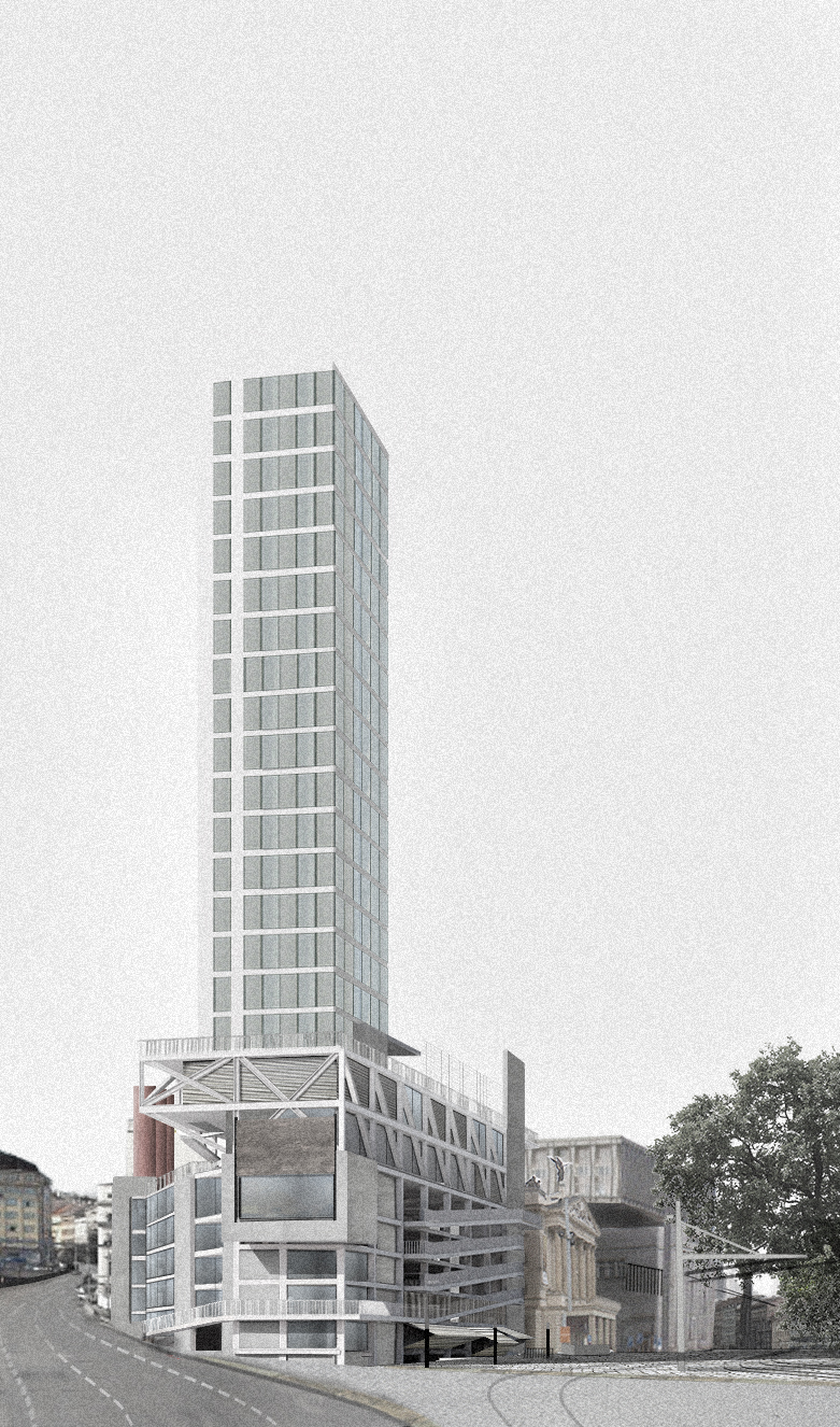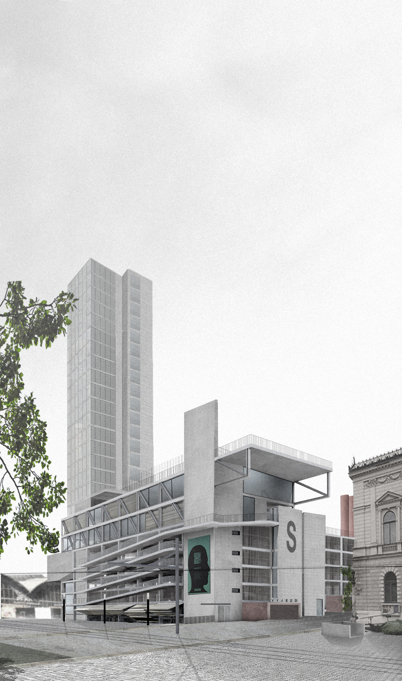 Odvážně a neotřele zvolené místo, náplň i architektonická forma. Dům jako iniciátor reálných změn v turisticky i dopravně zdevastované centrální části města. Zahušťování a oživování centra Prahy díky zrekonstruování parkovacího domu a náplň studentského domu je příkladná a inspirující a to včetně kultivace přilehlých ploch. Projekt navazuje na odvážné přemostění burzy Karlem Pragrem a aktivuje současnými prostředky danou část města a tak naplňuje zadání soutěže. Věž kolejí vzbuzuje v tomto místě otázky a měla by předpokládat hlubší zamyšlení nad možností výškových budov v samém centru metropole. Současná nenoblesní architektura by městu pomohla se vzpamatovat z letargie a dodala by mu potřebnou energii. Práce s objektem stávajících garáží (využívání stávajících staveb více než jejich bourání) je smysluplná a příkladná, otevřenost domu k okolí působí jako iniciátor veřejného života. Navržená rampa se stává veřejným prostorem, který oživuje zdevastované místo.