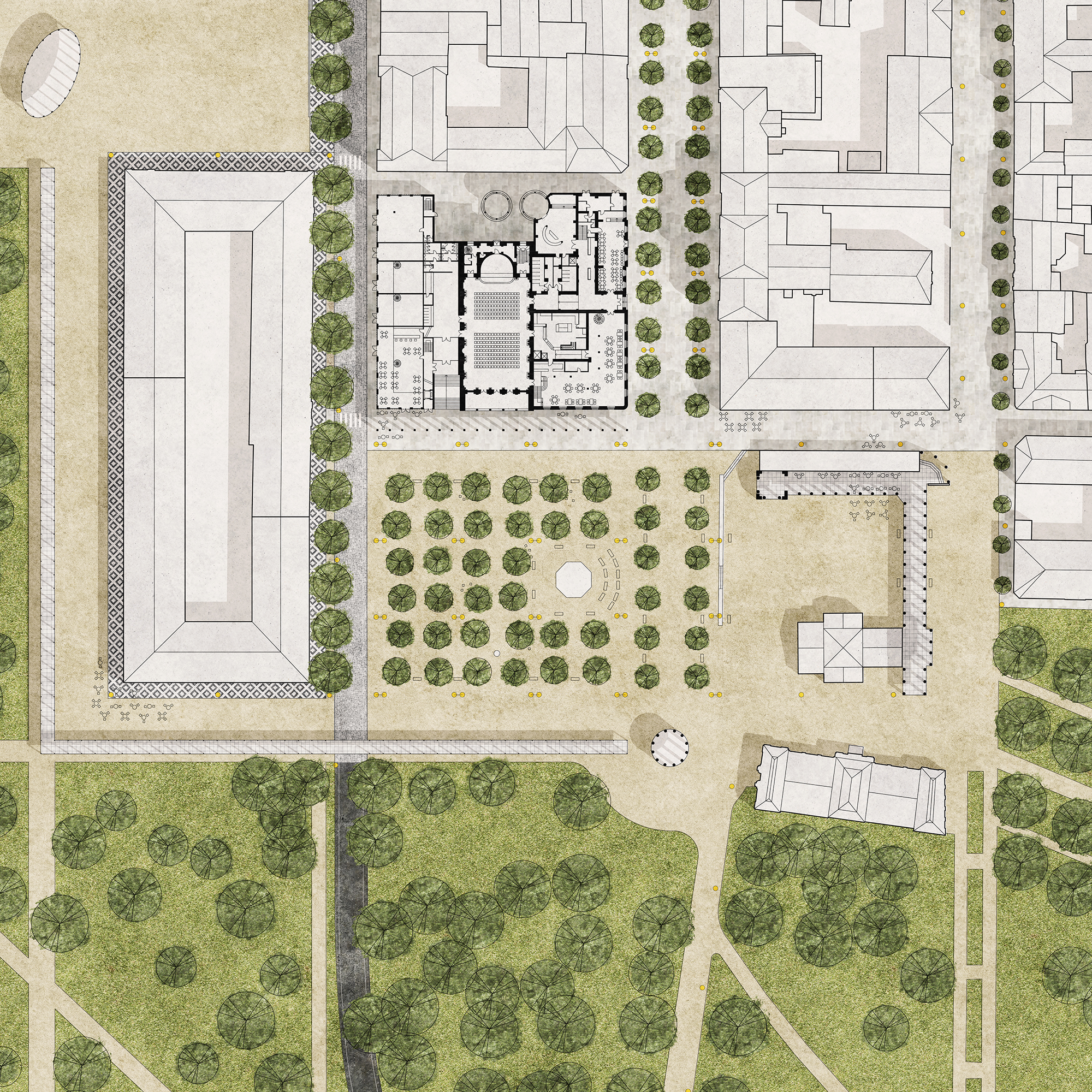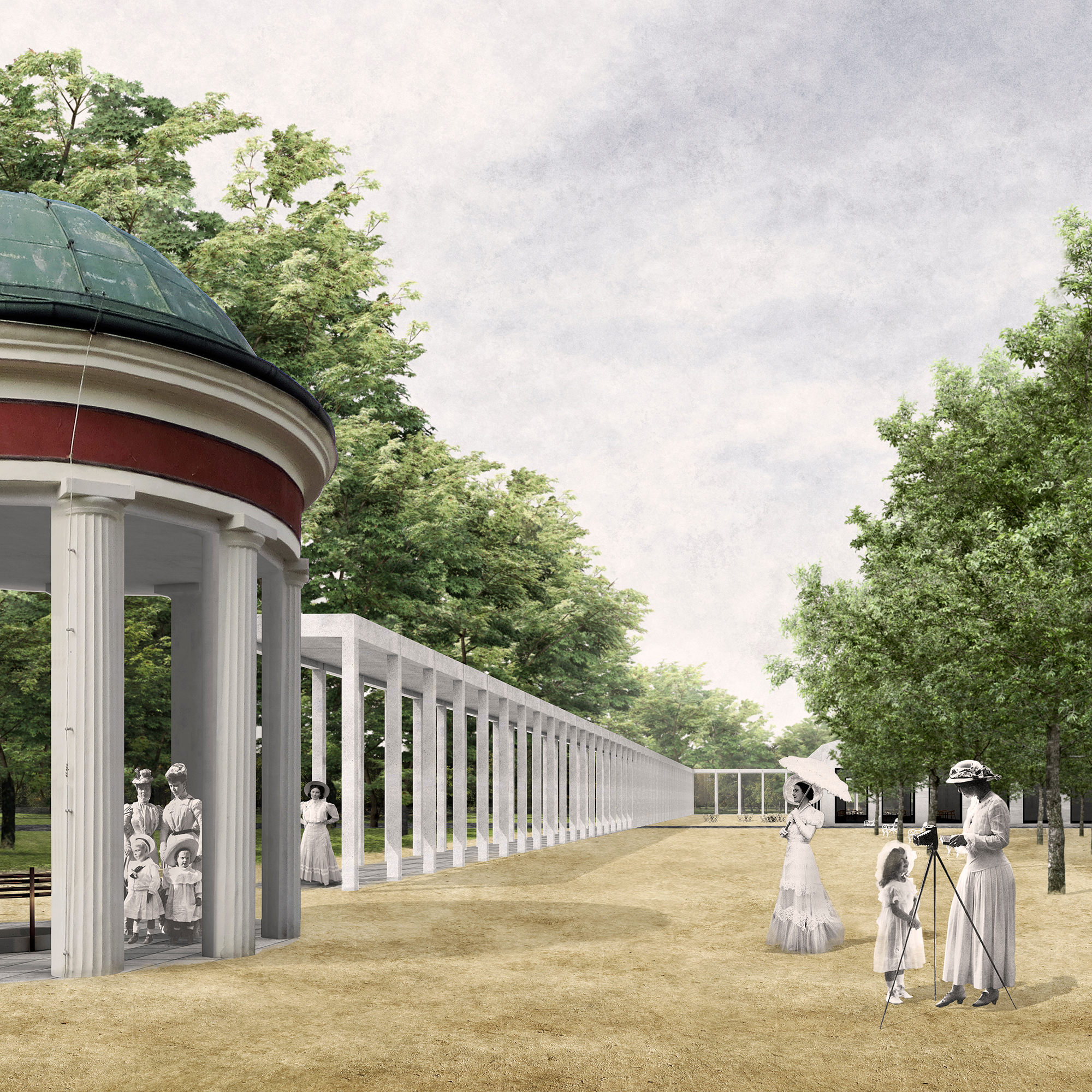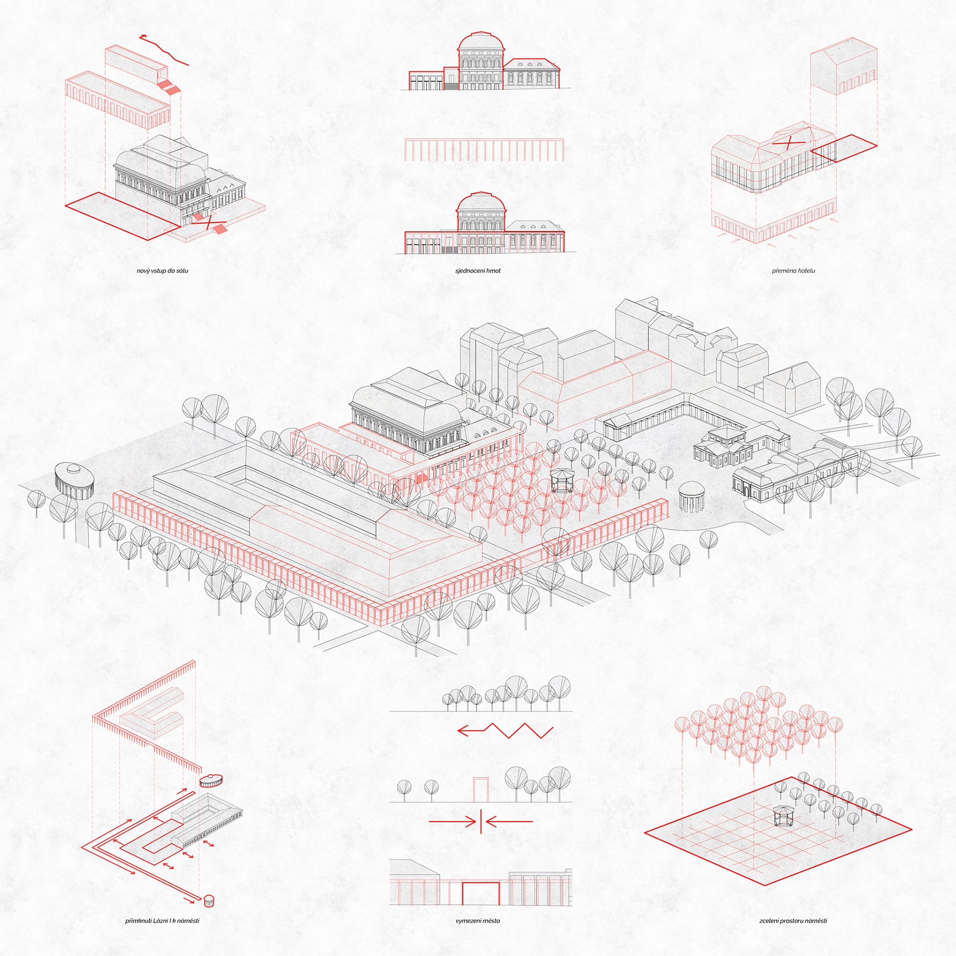 Jemná a citlivá práce s kontextem lázeňské architektury. Samozřejmé doplnění objemů staveb, kolonád i stromořadí současným řešením, které přirozeně dotváří vybranou část města. Oživuje a kultivuje veřejné prostory a vybízí ke společenskému životu uprostřed stávajících i doplněných staveb, v kolonádách, mezi domy a mezi stromy, venku.