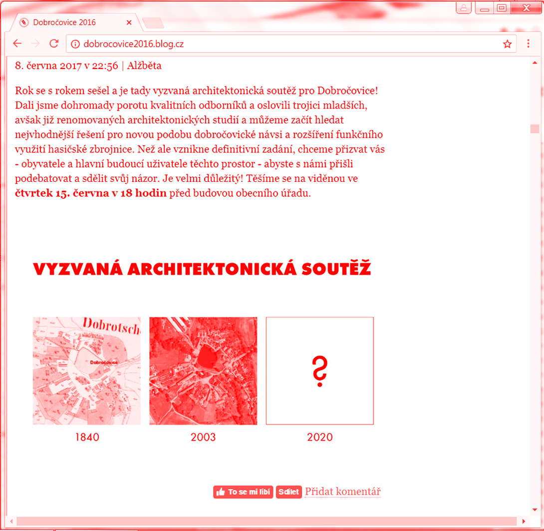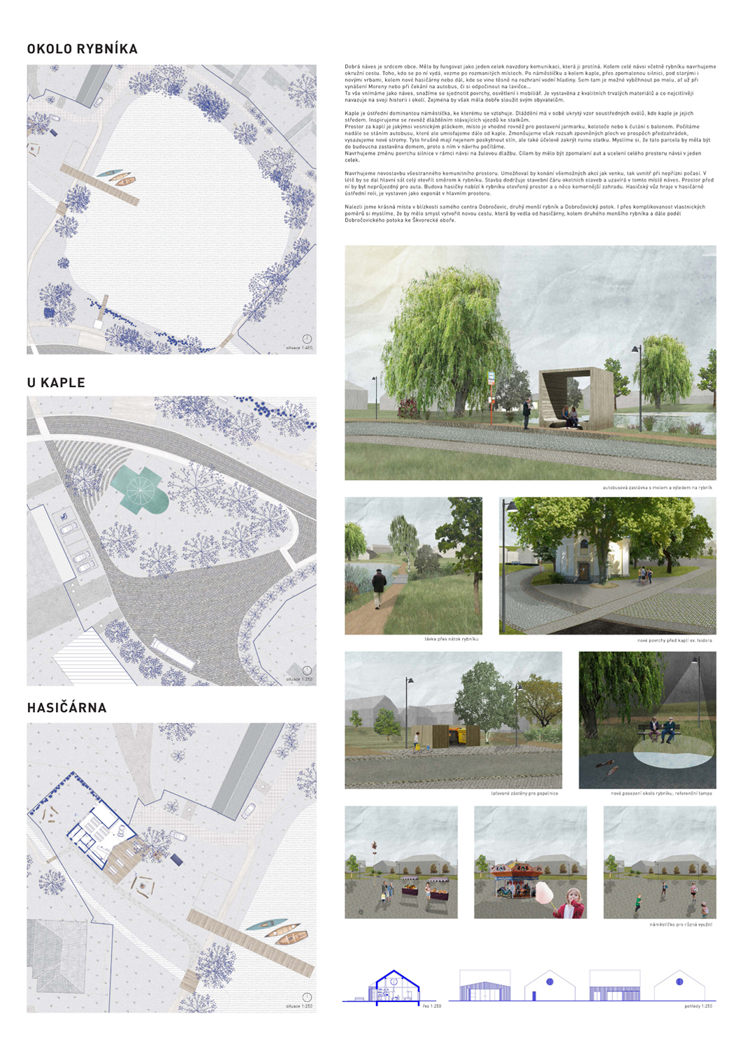 Příkladná práce ukazující novou roli architekta v současném světě jako aktivního hybatele změn ve městech a obcích a to nejen jako tvůrce reálné architektury. Zorganizování soutěží na malé obci na základě předchozí studie oblasti vzbuzuje naději na budoucí přeměny veřejných prostor promyšlenými a dlouhodobými vizemi. Obdiv nad projektem vzbuzuje hledání nejvhodnějšího řešení nejen zrealizování vyzvané soutěže a sestavení vhodné poroty, práce s veřejností a se zastupiteli, ale i obdiv nad vzdání se pokušení zrealizovat vlastní návrh, včetně grafiky a principu kalendáře jakožto osnovy ukazující promyšlenost akce i zpřístupnění vize vedení města a veřejnosti.