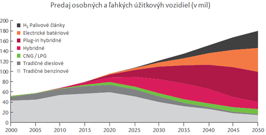 Predpokladaný dlhodobý vývoj podielu elektrických automobilov by podľa Medzinárodnej agentúry pre energetiku (IEA) mal neustále narastať. Ročný počet vyrábaných vozidiel so zážihovým a vznetovým motorom, ako ich poznáme dnes, by mal dosiahnuť vrchol v roku 2020. Po roku 2020 bude ich počet klesať.