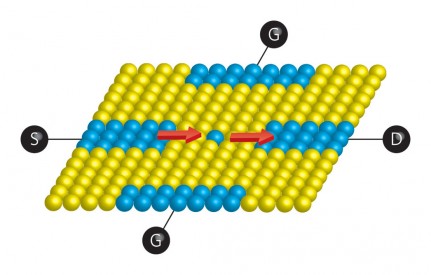 Jeden atóm fosforu (modrá gulička v strede) je starostlivo a veľmi presne umiestnený na povrch z kremíkových kryštálov. Elektrický prúd postupuje od elektrody source (S) k elektrode drain (D) ak je medzi elektródami gate (G) potrebné napätie. (Obrázok nie je v merítku. V skutočnosti je medzi atómom fosforu a elektródami D/S niekoľko desiatok radov atómov kremíka a viac ako sto kremíkových atómov medzi fosforom a elektródami G).