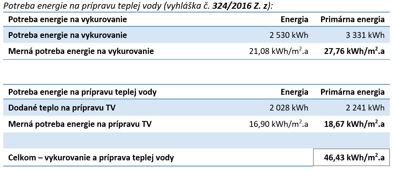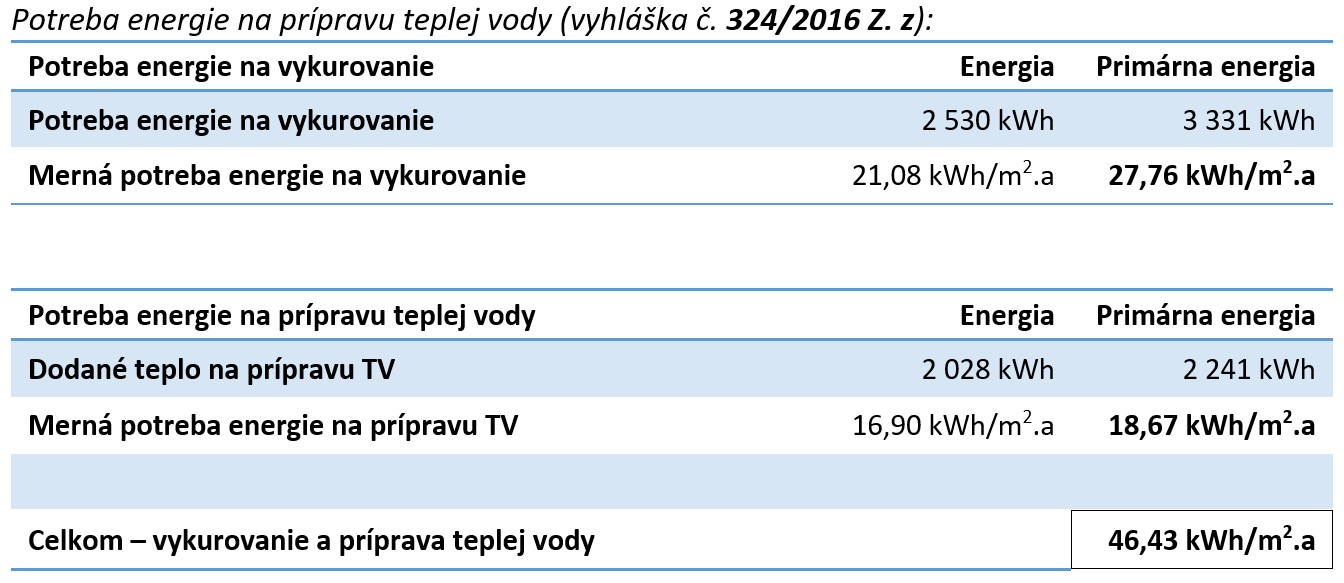 V zmysle vykonávacej vyhlášky č. 364/2012 Z. z. sa celková potreba energie budovy určí ako súčet potrieb energií pre jednotlivé miesta spotreby. Pri rodinných domoch je to súčet potrieb energie na vykurovanie a energie na prípravu teplej vody. Potreba energie na vetranie a chladenie sa pri rodinných domoch nehodnotí.