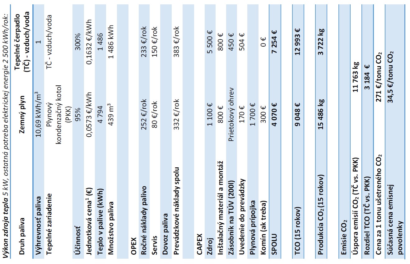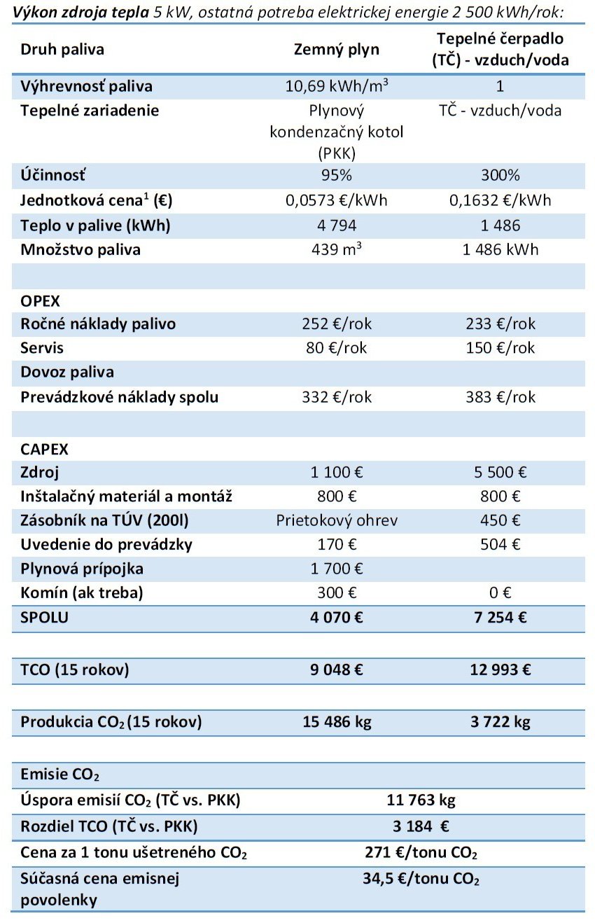V prípade, ak analyzovaný rodinný dom bude vykurovaný plynovým kondenzačným kotlom, tak kompletné náklady na 15 rokov (TCO) sú vo výške 9 390 €. Tepelným čerpadlom vzduch – voda sú kompletné náklady vo výške 13 142 €, čo je o 3 184 € viac ako plynovým kondenzačným kotlom. Plynový kondenzačný kotol vyprodukuje za 15 rokov prevádzky 15 486 kg CO2 a tepelné čerpadlo 3 722 kg CO2, čo je rozdiel 12 ton CO2.