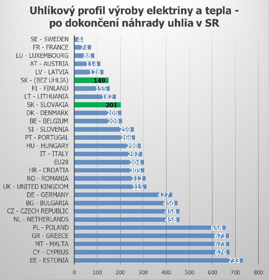Slovensko patrí v Európe medzi krajiny s najnižšou jednotkovou produkciou CO2 v sektore energetiky t.j. pri výrobe elektrickej energie a tepla (obrázok č. 1). Po odstavení Elektrárne v Novákoch (ENO) a 100% náhrade uhlia za biomasu/OZE v sektore vykurovania a chladenia sa slovenská energetika posunie z 9. na 6. miesto najmenej emisných energetík v rámci celej EÚ. Predbehne tak aj štáty s omnoho vyššou kúpyschopnosťou obyvateľstva. Opodstatnenosť tlaku na ďalšie znižovanie produkcie emisií v  sektore energetiky sa stáva tým pádom otázna. Naopak, v budúcnosti budú v SR výrazne narastať emisie zo sektoru dopravy (nárast počtu áut na počet obyvateľov), na ktorý je potrebné sa namiesto tohto zamerať.